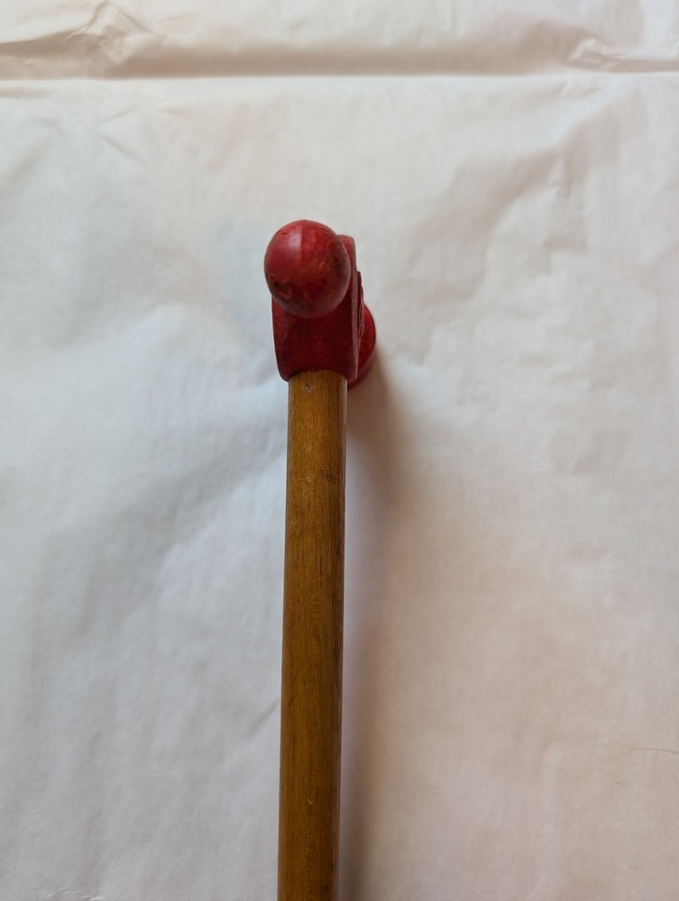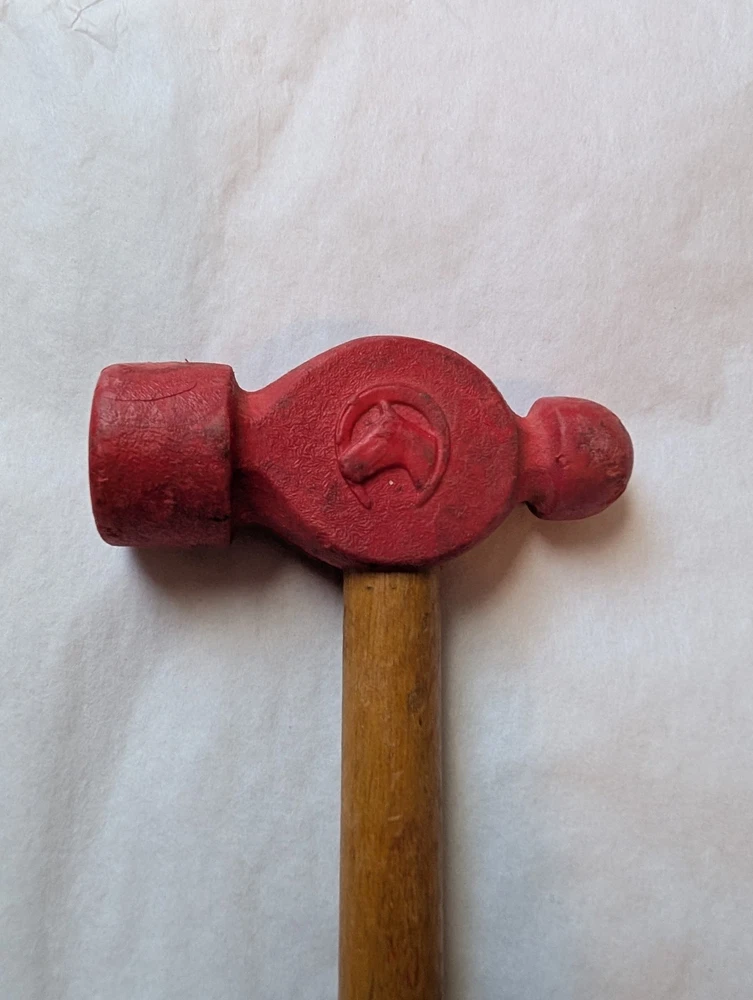 Vintage Auburn Rubber Toy Red Ball Peen Hammer with Wooden Handle This is a toy ball peen hammer The head is red rubber with a horse head and horse shoe design on it The handle is made of wood The hammer is 9.5 inches in length Used, see pictures for condition Ships via USPS