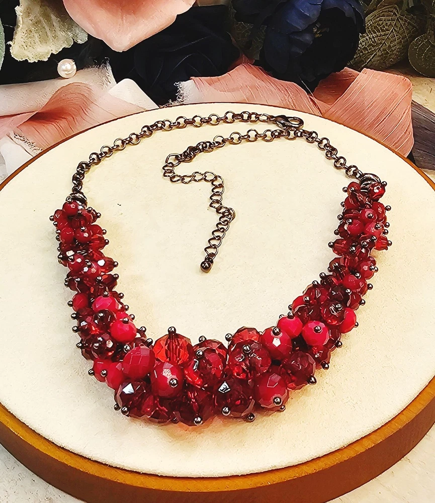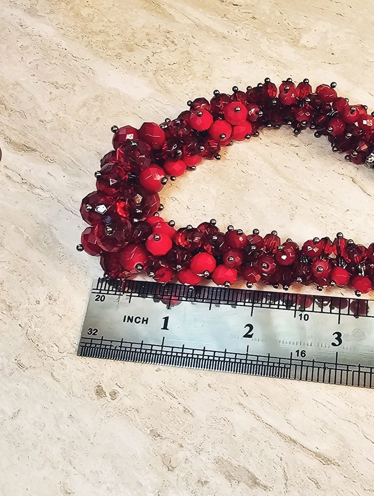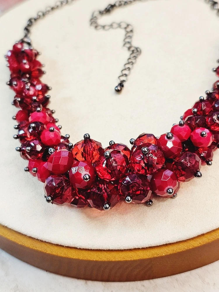 This vintage eye-catching necklace features a sparkly bold red beaded design with an adjustable chain for a customizable fit, suitable for various occasions. • Adjustable chain length • Lobster clasp closure • Multicolor red beads • Statement piece 16 to 19 inches