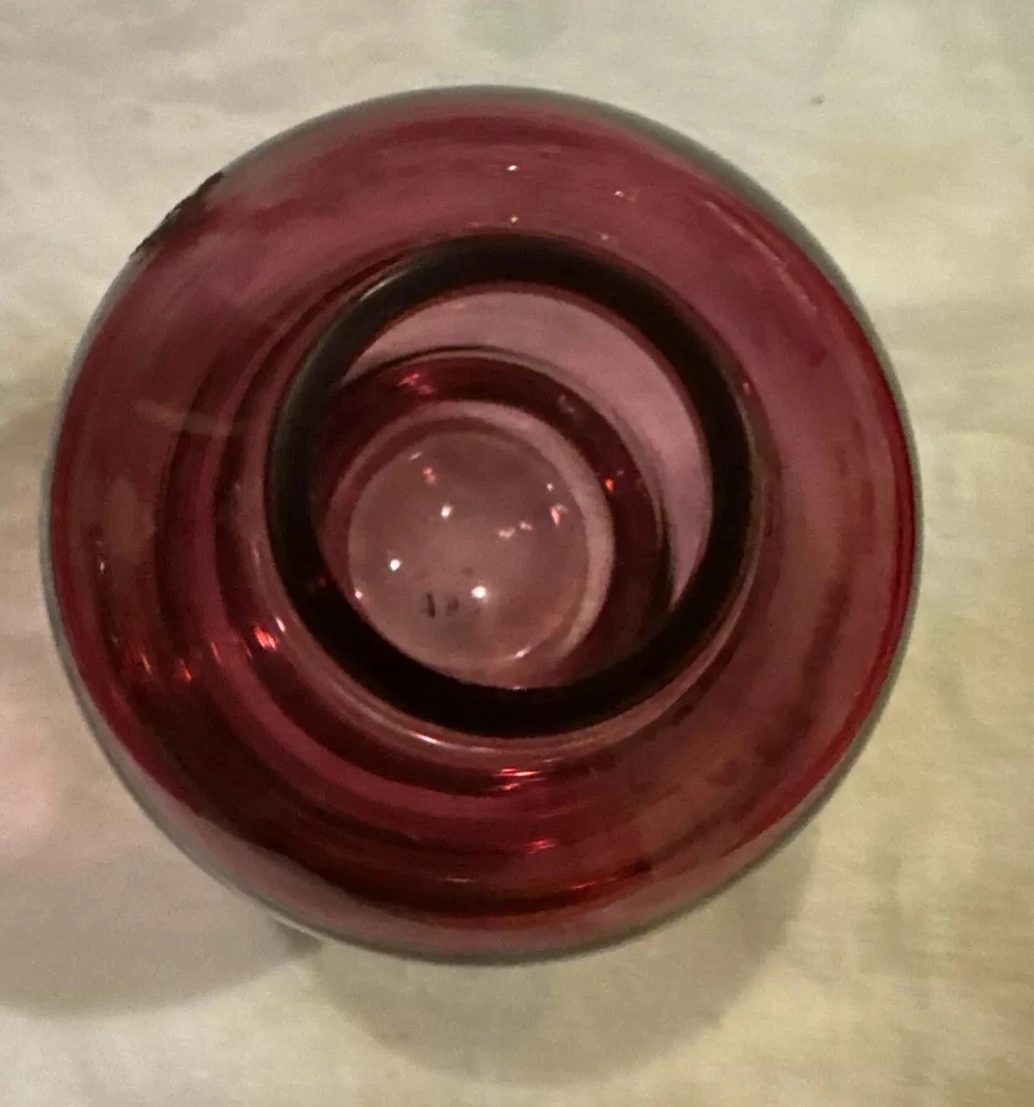 Vintage Red Glass Bud Vase. This vase is made of glass and features a vibrant red color. It is designed in a bud shape, perfect for displaying a single flower or small bouquet. A beautiful collectible item that adds a decorative touch to any space.