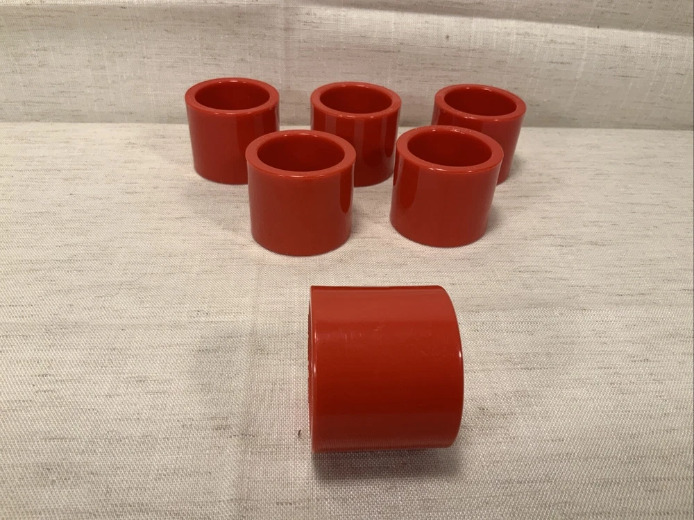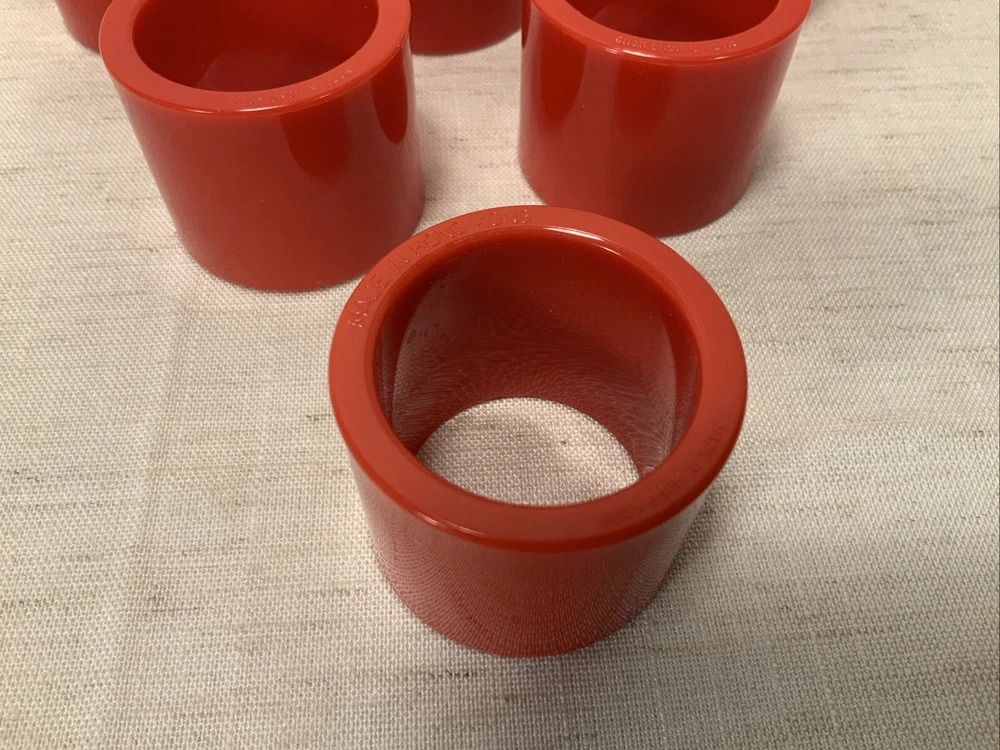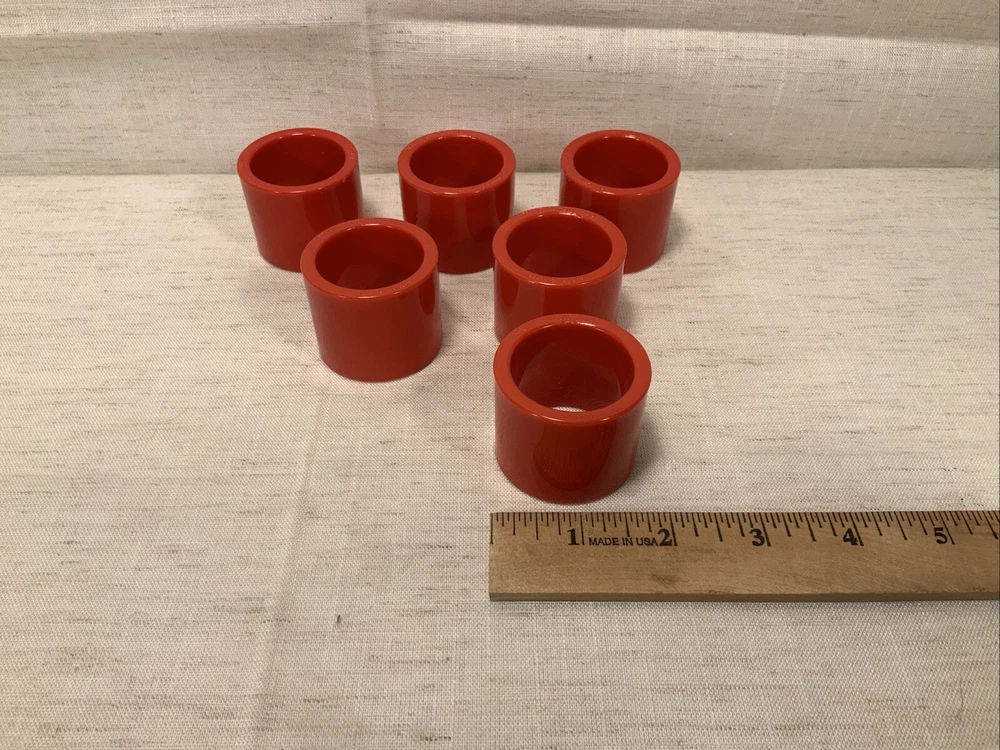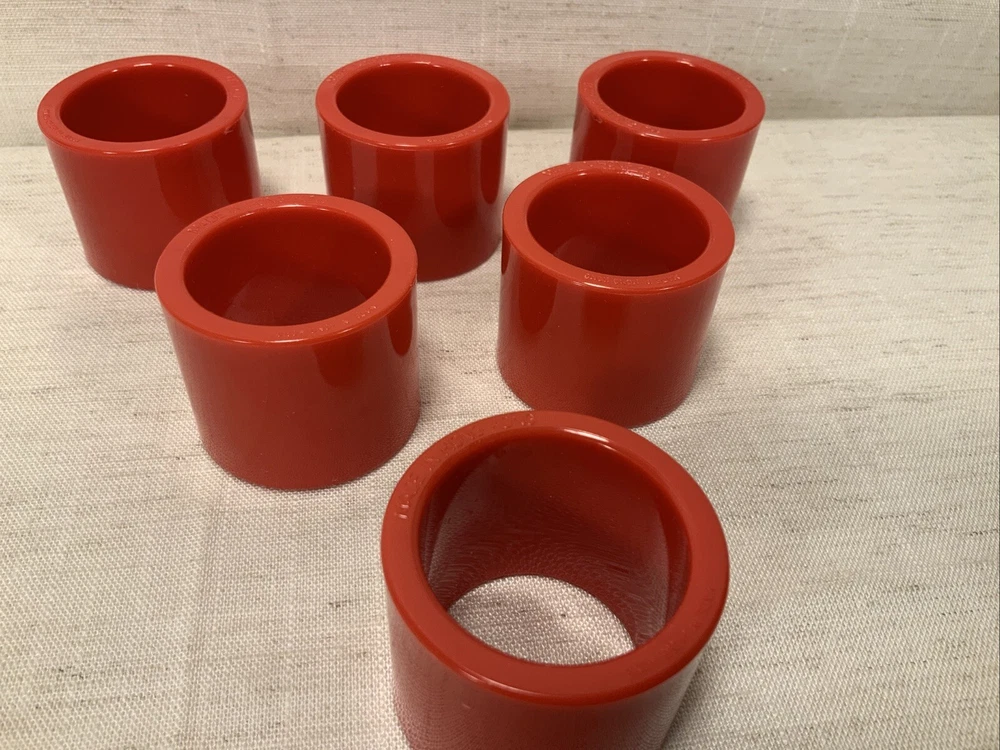 Vintage Red Lucite Plastic Acrylic Napkin Rings Hong Kong Set Of 6 Unique Used clean condition. Small chip on one edge. Please see pictures.