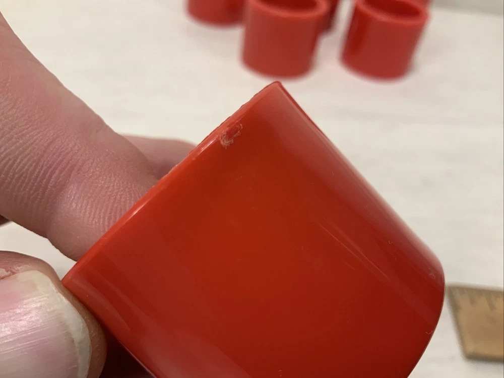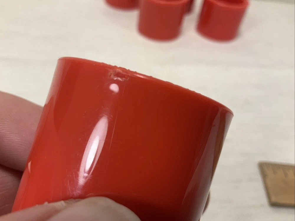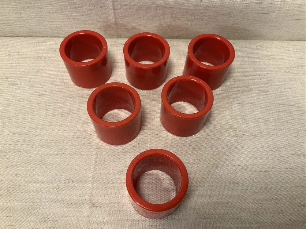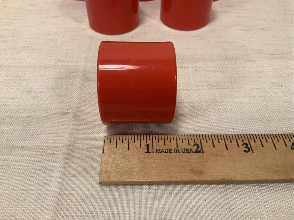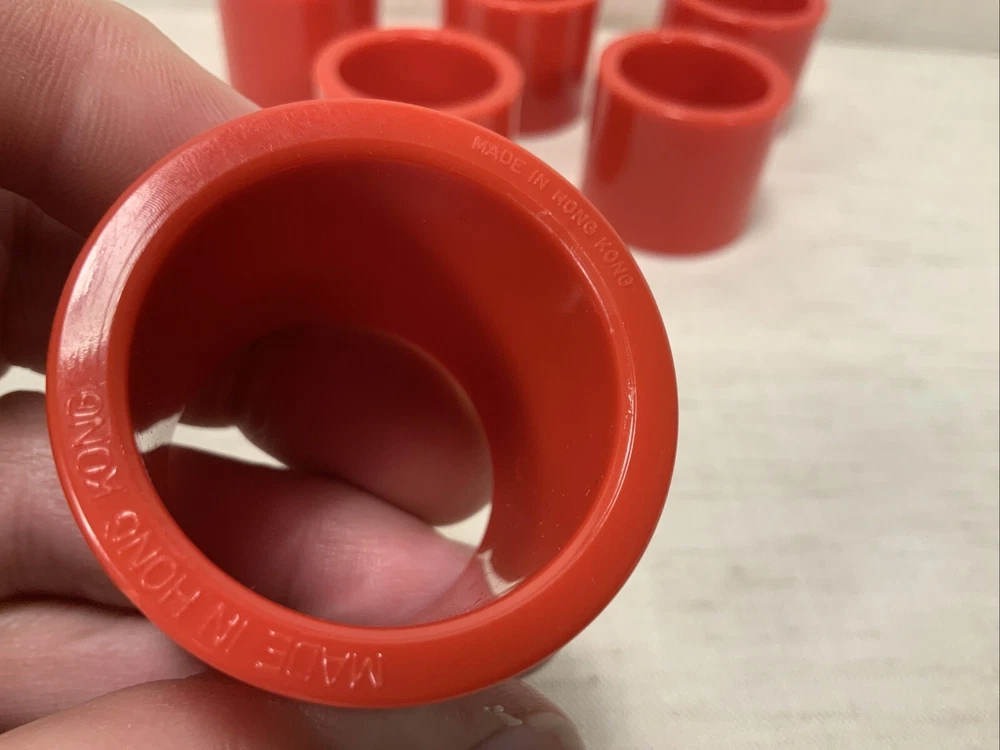 Vintage Red Lucite Plastic Acrylic Napkin Rings Hong Kong Set Of 6 Unique Used clean condition. Small chip on one edge. Please see pictures.