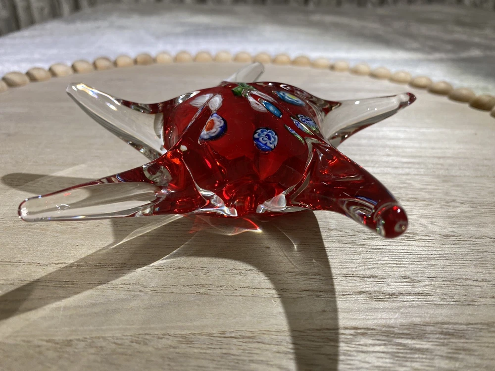 This item is a vintage starfish figurine, acquired in the early 2000's. Specifically, it is a Millefiori-style, glass starfish in clear and red, with multicolor flowers. "Millefiori" translates from Italian to "thousand flowers", and refers to the Murrina technique of slicing canes of glass to expose transverse patterns. In Millefiori, the slices of layered glass exposes a flowerlike design. Measurements Height: 2 in Width / Length (at widest / longest point): 6.325 in Weight: 13.8 oz These measurements are Seller's best approximations. Vintage. Pre-owned and in excellent condition. No flaws observed. Please see all photos. SHIPPING: All items will be weighed, photographed and/or video-recorded while item is prepared for shipment. Shipping of items will always prioritize the care and safety of the item, but at times will use recyclable materials (to include boxes and packaging materials). DISCLAIMER: All photographs provided do not use filters with any intent to alter or improve the appearance or condition of the item. All items are inspected carefully and flaws are photographed and presented as transparently as possible to The Buyer. All measurements provided are done to the best of the ability by The Seller. If you have any further questions pertaining to the description of this item, please contact The Seller BEFORE purchasing or placing an offer.