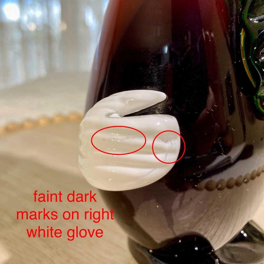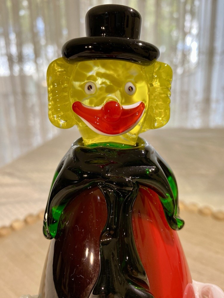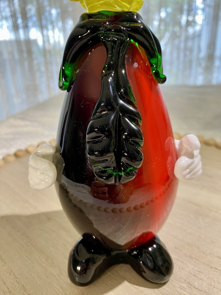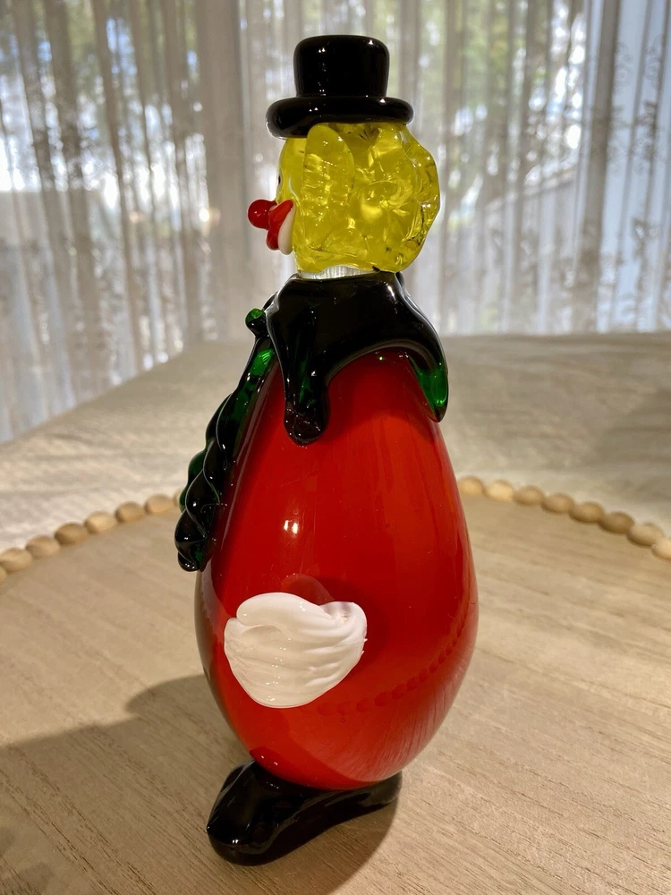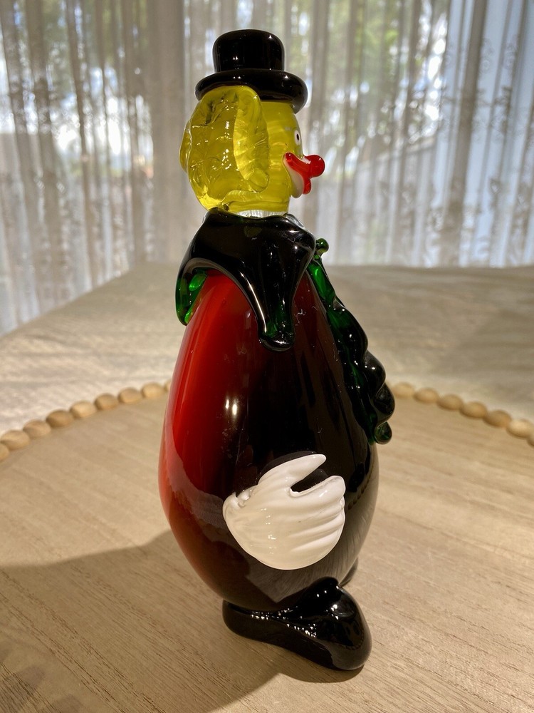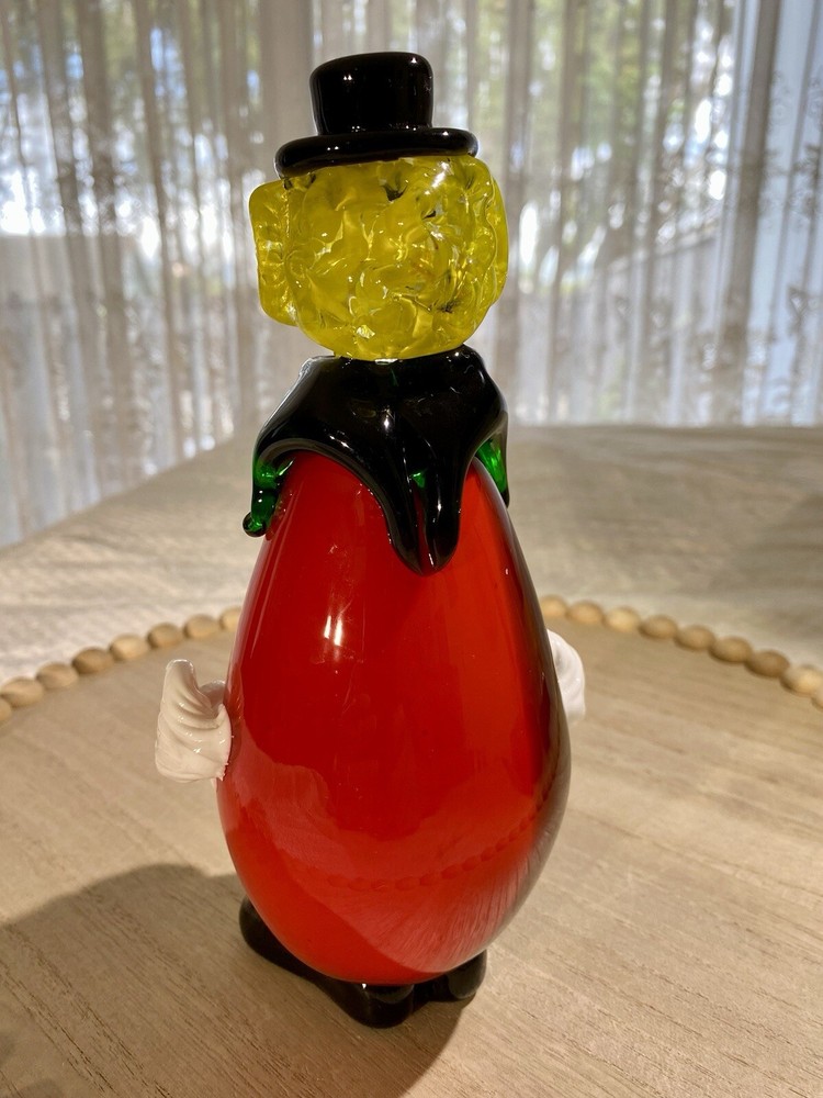 **FINAL PRICE** Acquired in the early 2000's, this item is inspired by Murano / Venetian glass but is NOT believed to be authentic. Its friendly facial features, along with a black and red ombre body that resembles an eggplant, makes this whimsical clown a wonderful addition to your collection. Height: 8.25 in Width: 4.25 in Depth: 3.5 in Weight: 2 lbs, 4 oz. These measurements are Seller's best approximations. Vintage. Pre-owned and in very good condition. Flaws observed: 1) Various faint, dark marks on the right white gloved hand, difficult to capture in photographs. 2) 1 white speck and 1 dark speck encased in glass on the back of the body. No other flaws observed. Internal bubbles are not to be considered flaws and are inherent in handmade art glass. Please see all photos. **PLEASE REVIEW SHIPPING COSTS, which reflect USPS Priority shipping from Hawaii for speedier delivery. If you are not in a rush to receive this item and are willing to wait approximately 18+ days for delivery, lower cost USPS Ground Shipping is available. Please message me requesting this shipping method, which I estimate will cost approximately $40. I can modify this listing for you to reflect the cost of USPS Ground Shipping. SHIPPING: From Hawaii. All items will be weighed, photographed and/or video-recorded while item is prepared for shipment. Shipping of items will always prioritize the care and safety of the item, but at times will use recyclable materials (to include boxes and packaging materials). The packaging may not be aesthetically pleasing, but will be safe and secure. DISCLAIMER: All photographs provided do not use filters with any intent to alter or improve the appearance or condition of the item. All items are inspected carefully and flaws are photographed and presented as transparently as possible to The Buyer. If you have any further questions pertaining to the description of this item, please contact The Seller BEFORE purchasing or making an offer.