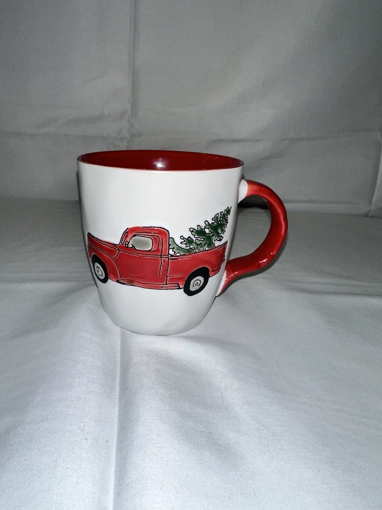 This rare SPECTRUM Designz mug features an old glazed red truck carrying a Christmas tree, perfect for the 2018 holiday season. The mug is made of ceramic and porcelain in vibrant red color, suitable for both hot and cold beverages. It is a collector's item from the 2010-2019 period, depicting a festive and nostalgic design that is sure to be enjoyed by any unisex adult who appreciates unique mugs for their collection.