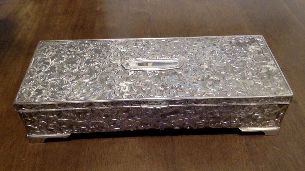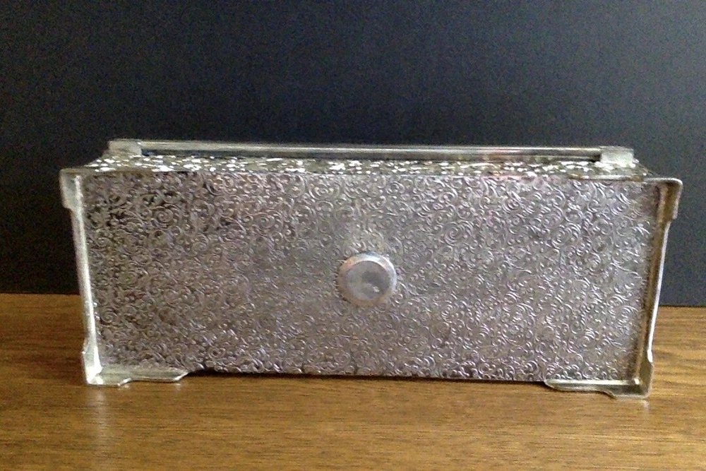 Excellent vintage condition (circa 1990s) lid opens and closes smoothly, Beautiful red velvet interior, ornate silver plated exterior. Made by Godinger, this box has a plaque area in the center of the lid surface decoration that may be engraved with your initials. Ships via UPS ground, carefully packed. Thanks for looking, and enjoy!
