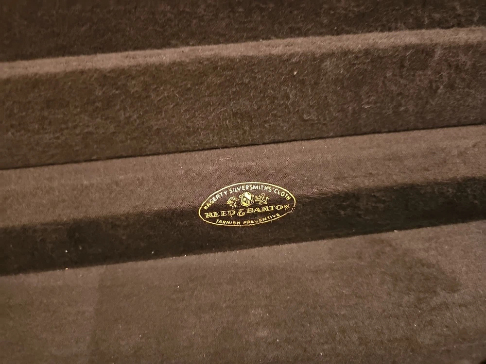 Reed & Barton Wooden Silverware case with a drawer. Very nice condition. Some scratches from use. A few tiny dents in the wood on the cover. Name plate on cover has never been etched and still has the protective plastic. Great side and drawer handles. Clean inside. Measures 14 3/4"" long x 6" high x 11 1/4" wide. A great redish brown wood.(maybe cherry, but not sure). Made by eureka mfg. Holds a service for 12. 12 knife slots on the cover.