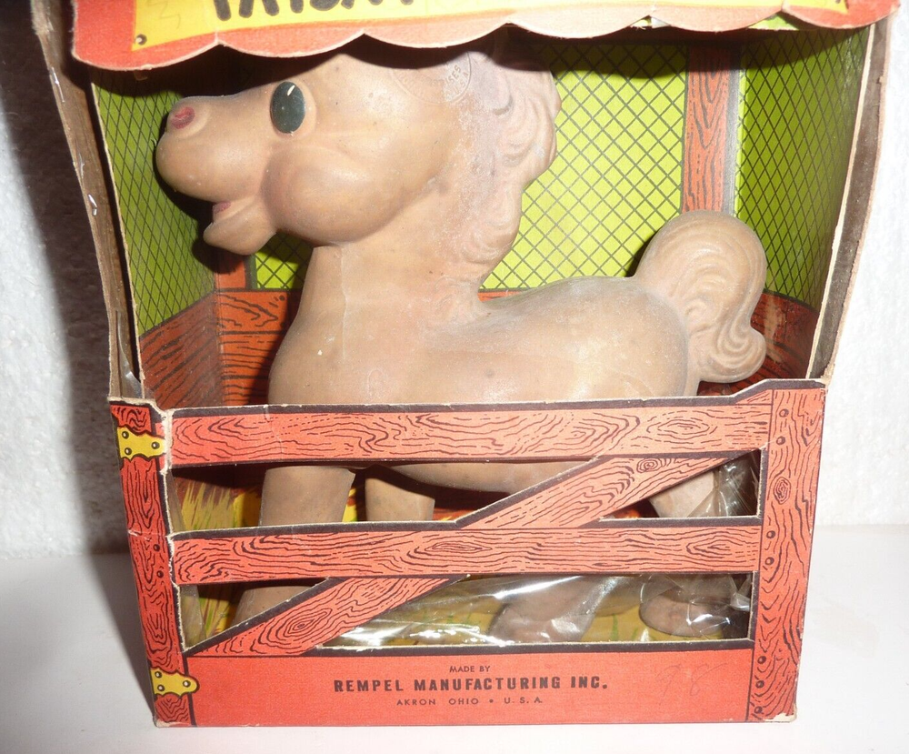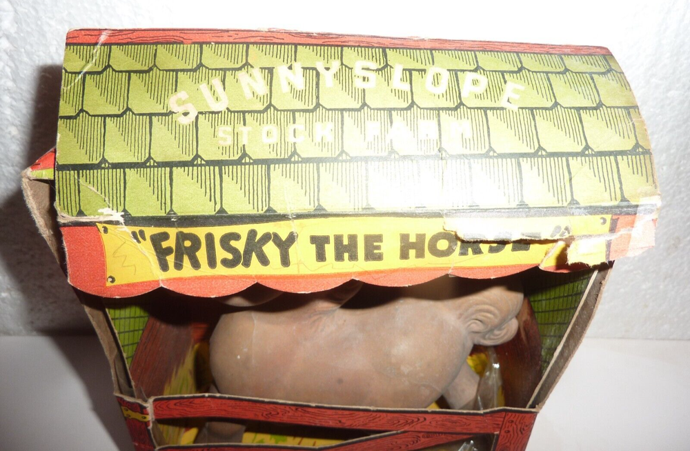 Vtg Rempel Sunnyslope Stock Farm Frisky The Horse Rubber Toy in Cardboard Barn In fair condition does not squeak, dirty I didn't try to clean, cardboard barn box has wear from storage and age, horse is 7" tall.