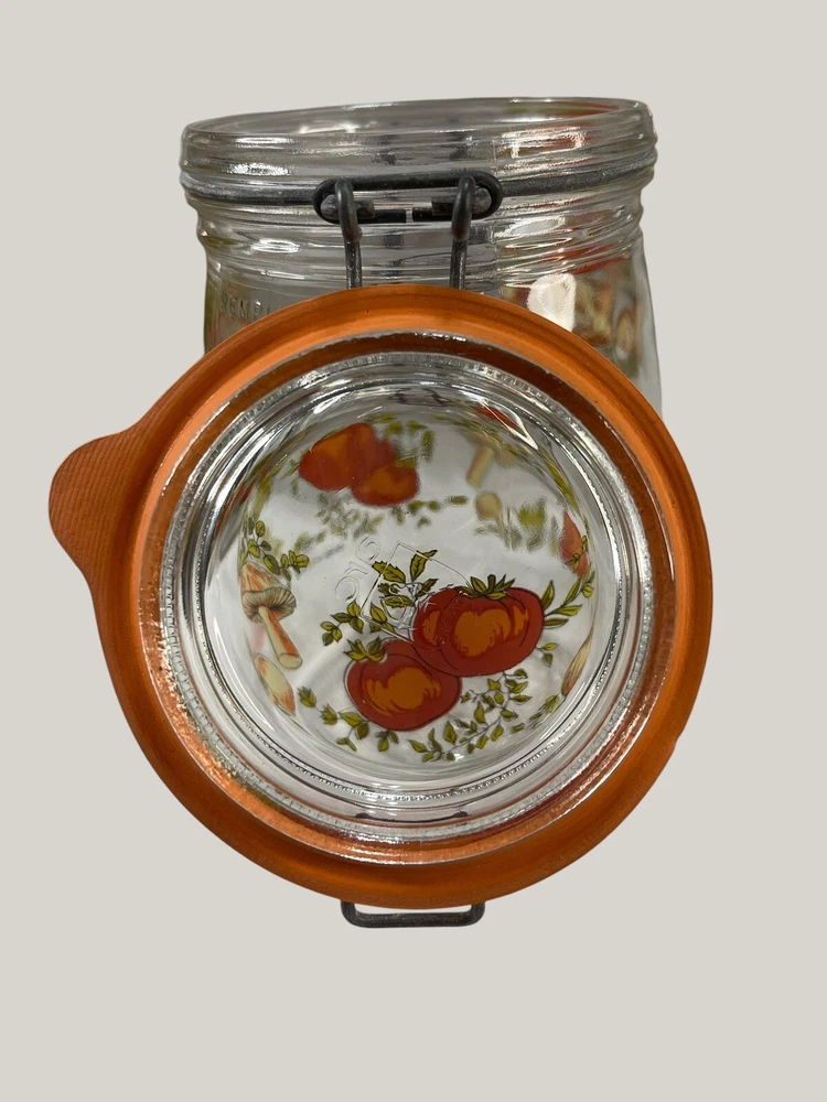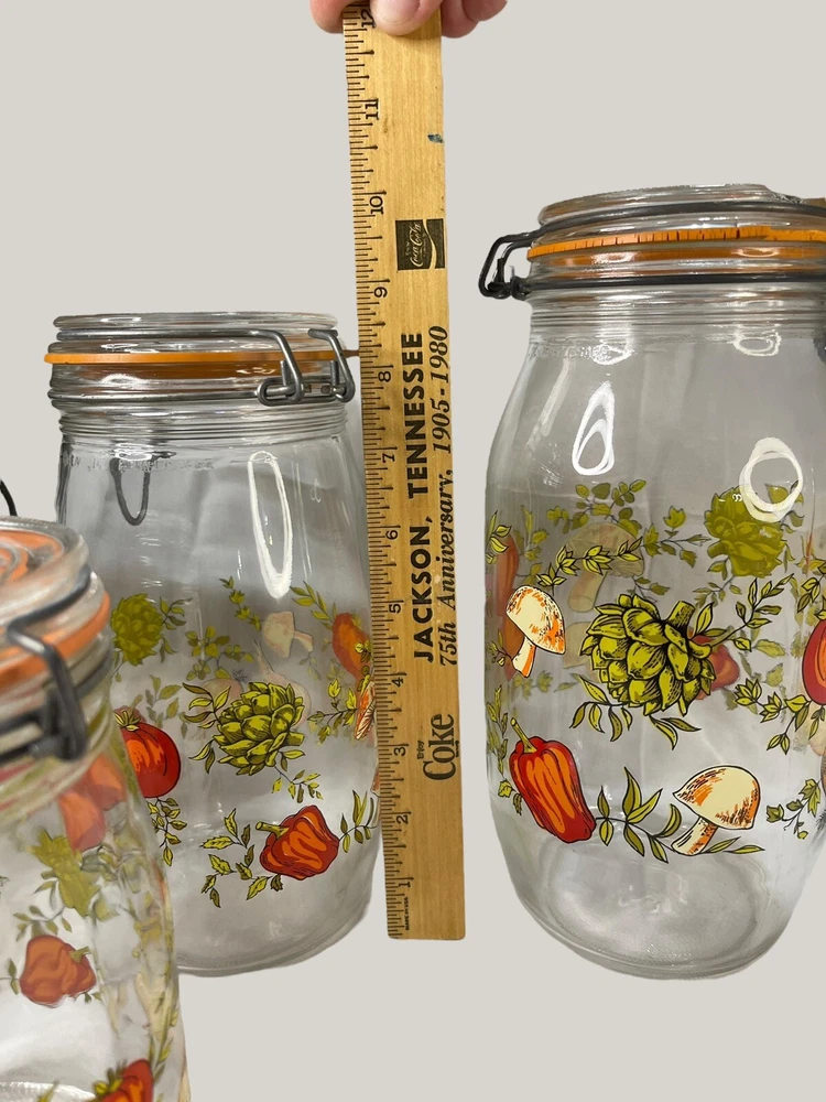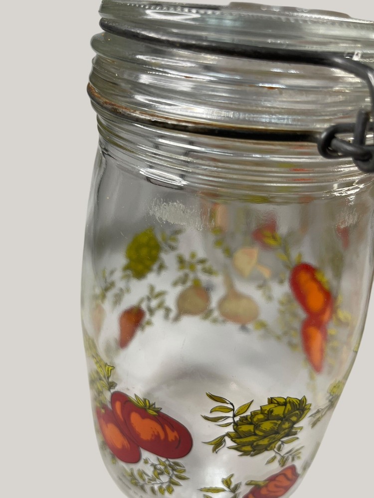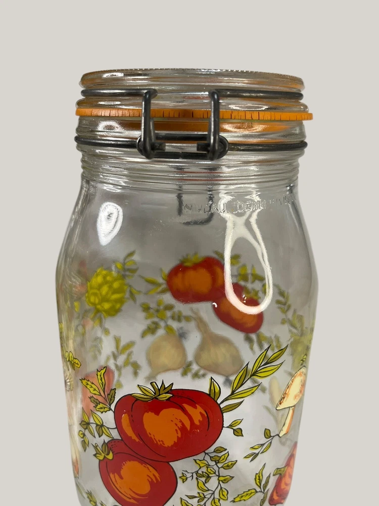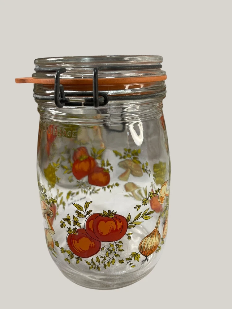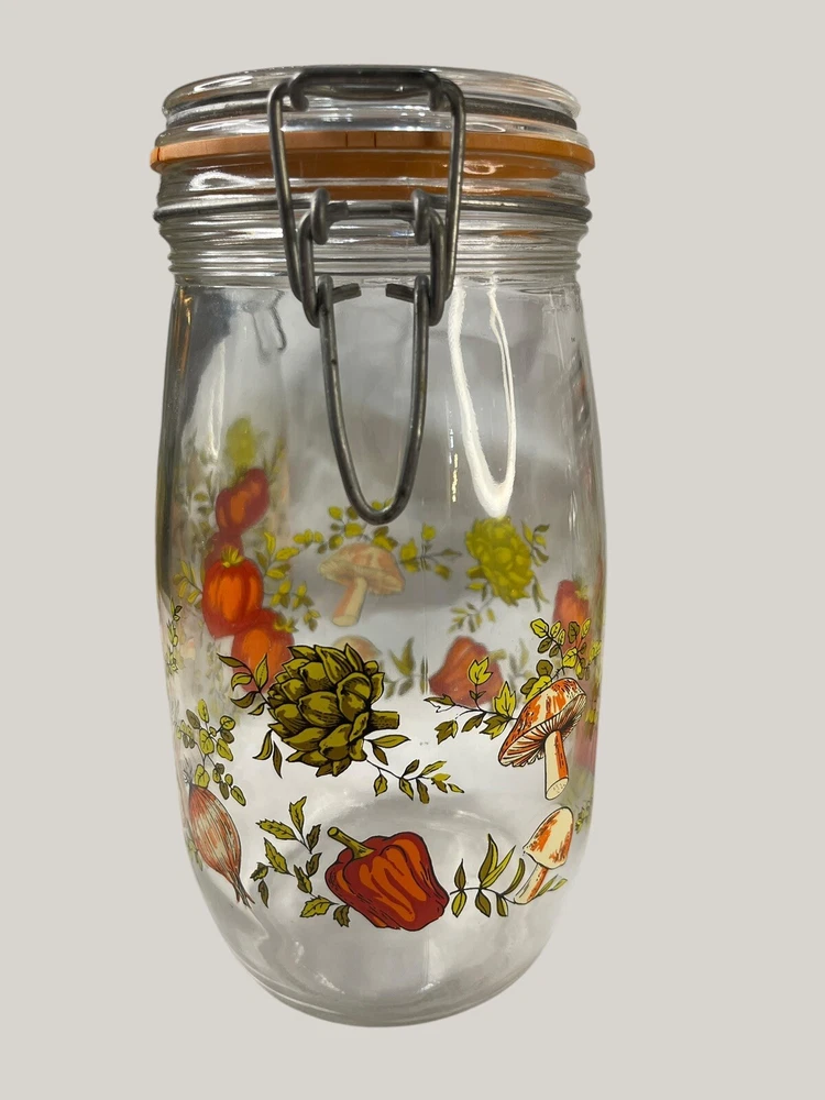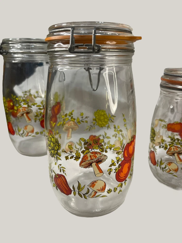 Vintage Arcoroc canister set from the 1970s, featuring a set of 4 glass jars with a multicolor vegtable pattern including mushrooms, tomatoes, and garlic. The jars have a clasp lock lid and come in a cylindrical shape. Each jar is sized 6.75", 8.75" x 2 and 9.75” tall, and 4.5" wide. Made in France, this retro set is ideal for kitchen storage and organization with a vintage appeal. One is missing the rubber seal. One’s rubber seal is cracking and would need to be replaced. The one without a seal has scratches on the outside of the jar at the top where it looks like the metal may have scratched it over time. The lid on the largest jar is damaged slightly, but no sharp edges. They are 1 Liter, 1.5 Liters x 2 and 2 liters in capacity.