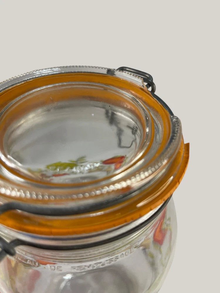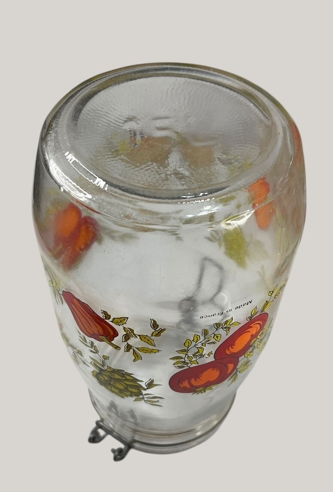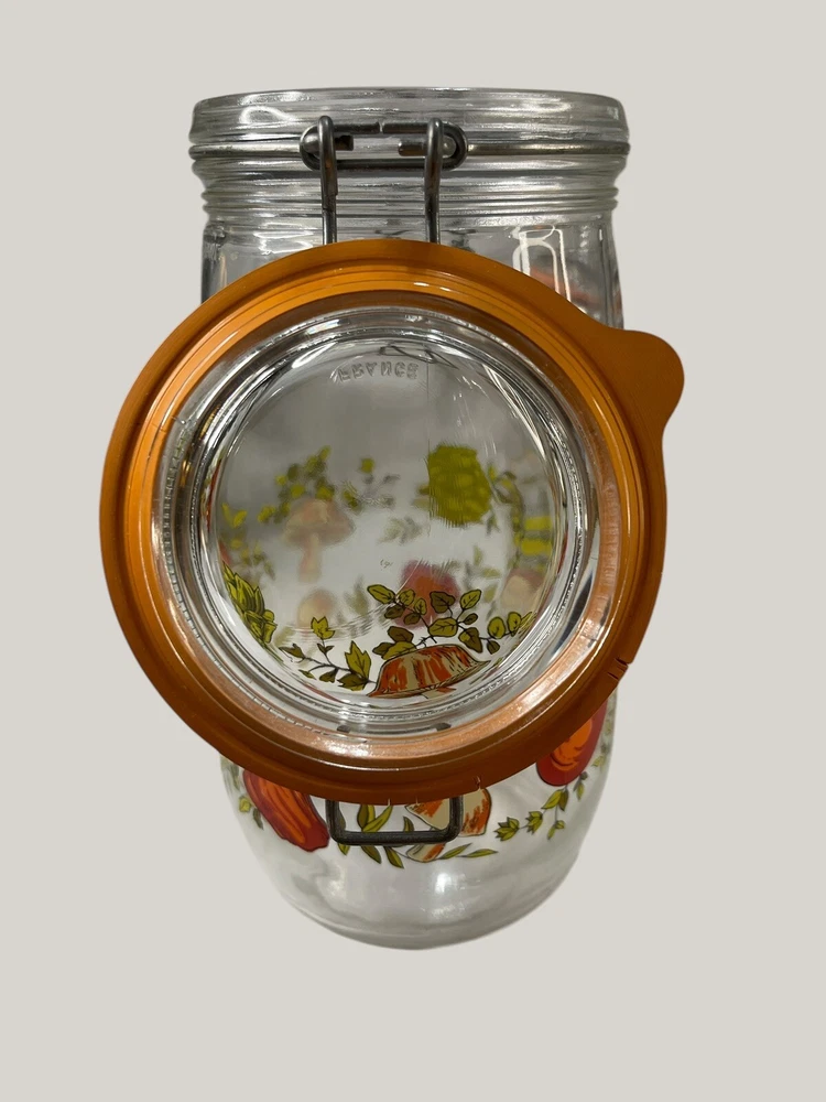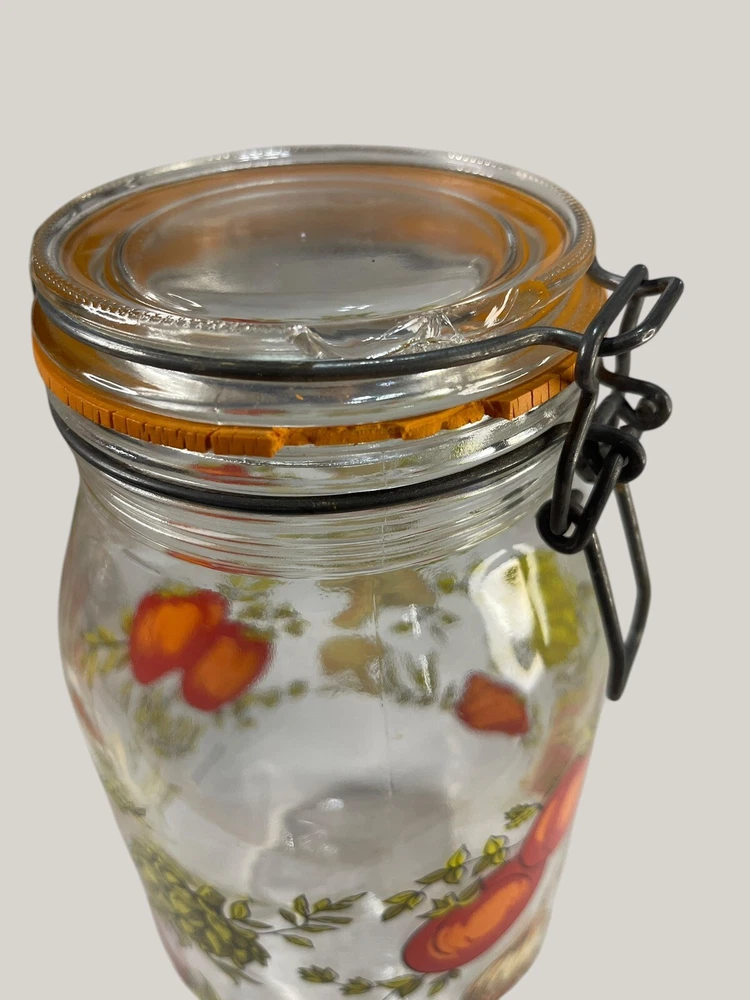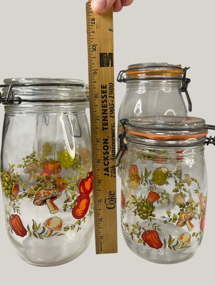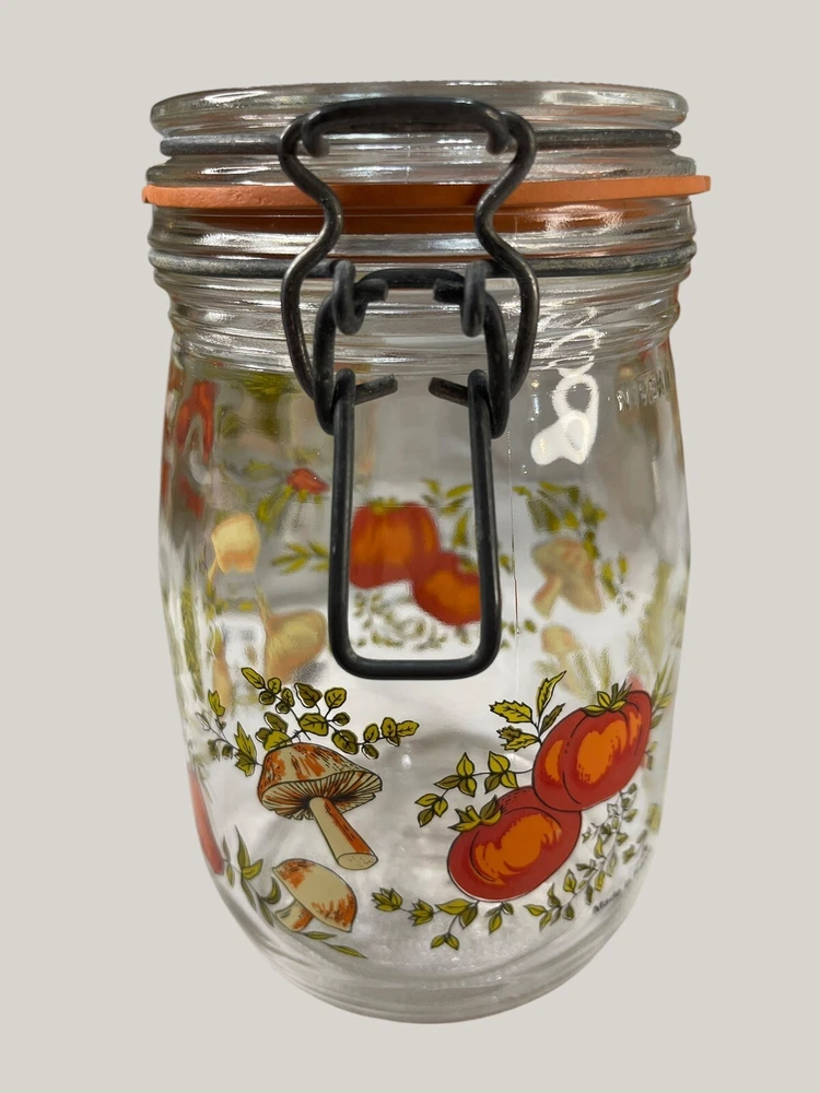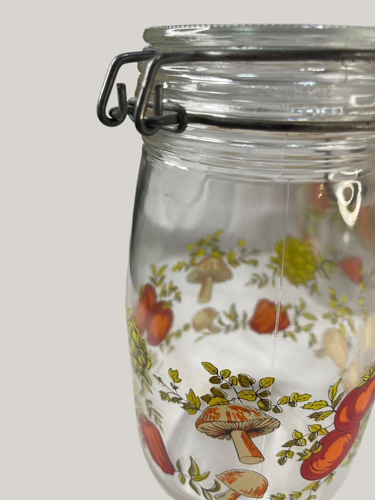 Vintage Arcoroc canister set from the 1970s, featuring a set of 4 glass jars with a multicolor vegtable pattern including mushrooms, tomatoes, and garlic. The jars have a clasp lock lid and come in a cylindrical shape. Each jar is sized 6.75", 8.75" x 2 and 9.75” tall, and 4.5" wide. Made in France, this retro set is ideal for kitchen storage and organization with a vintage appeal. One is missing the rubber seal. One’s rubber seal is cracking and would need to be replaced. The one without a seal has scratches on the outside of the jar at the top where it looks like the metal may have scratched it over time. The lid on the largest jar is damaged slightly, but no sharp edges. They are 1 Liter, 1.5 Liters x 2 and 2 liters in capacity.