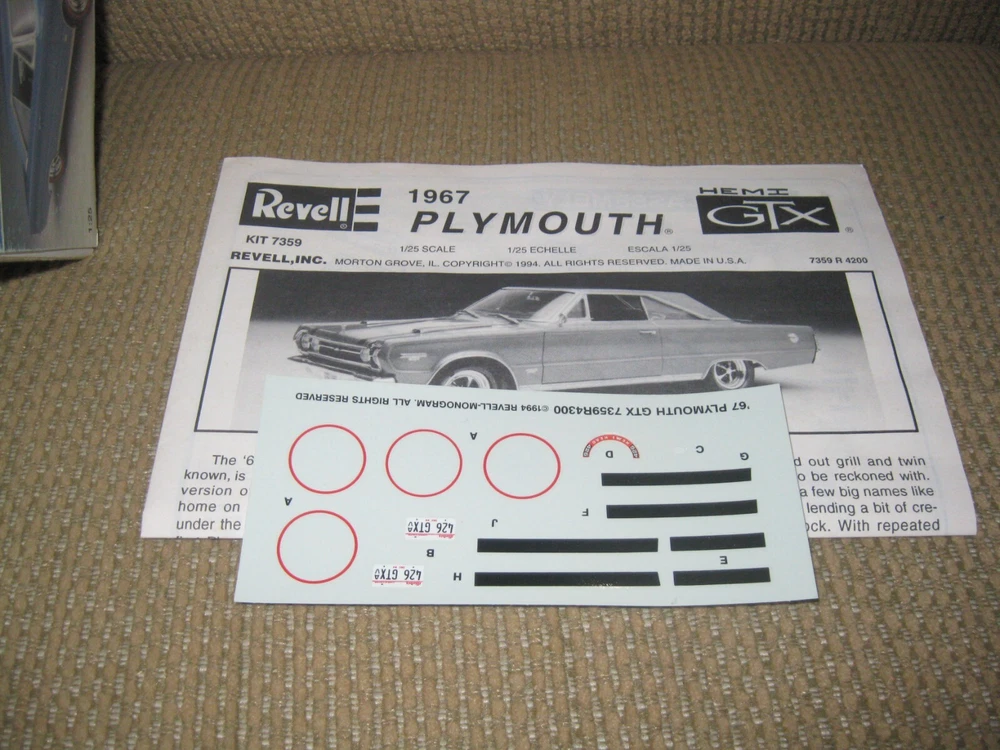 Vintage Revell 1/25 Scale 1967 Plymouth GTX Hemi Kit: c1994: MINT IN BOX! This 31 year-old kit is is in mint-in-box, unstarted condition; parts still in original poly bags Parts molded in metallic blue, chrome, with vinyl tires and clear glass Box is a bit scuffed but in good condition; instructions and decals are in excellent shape Kit sold as-is, as-shown LOW starting price, NO reserve Good luck and Good bidding!