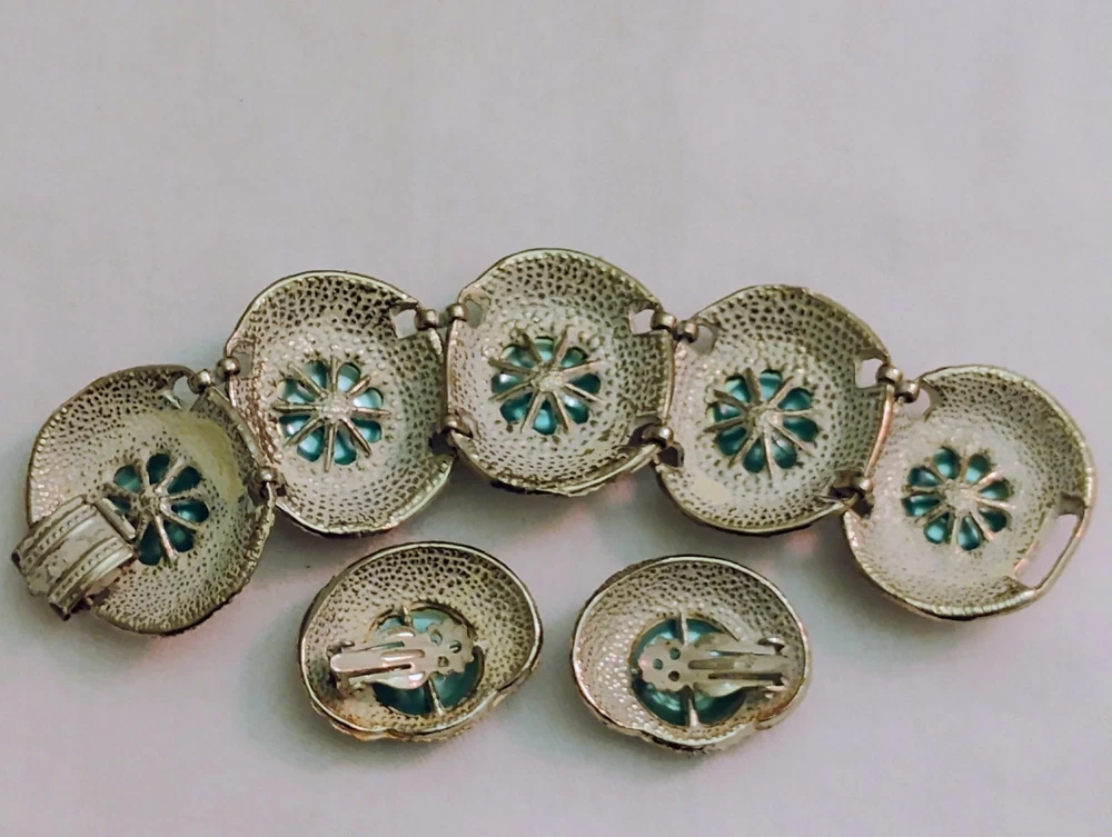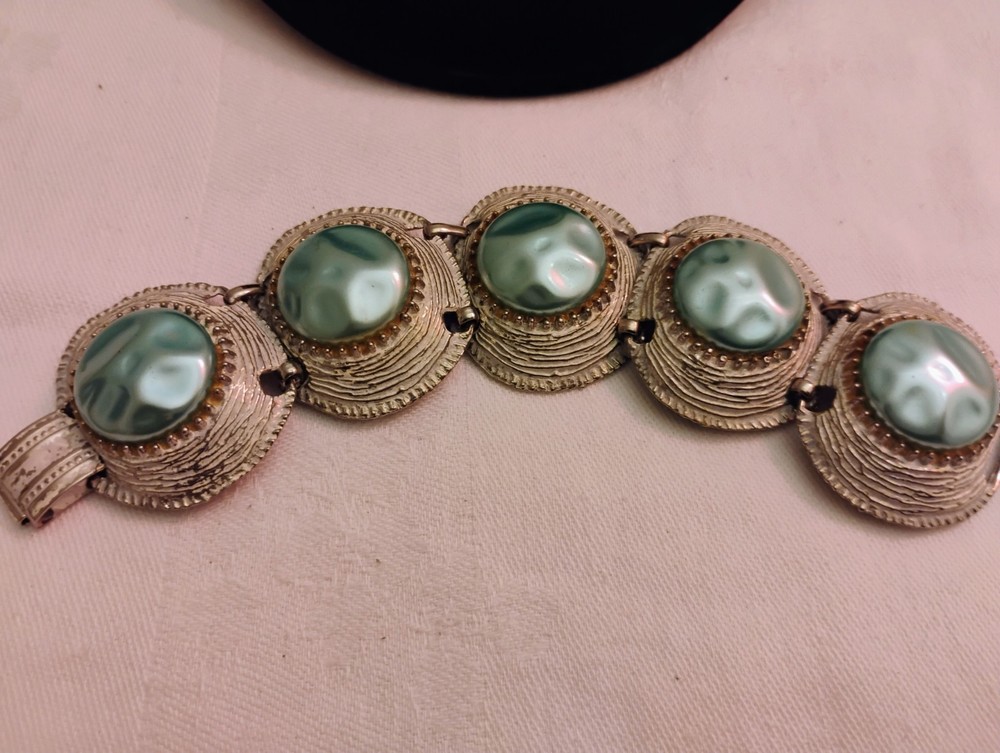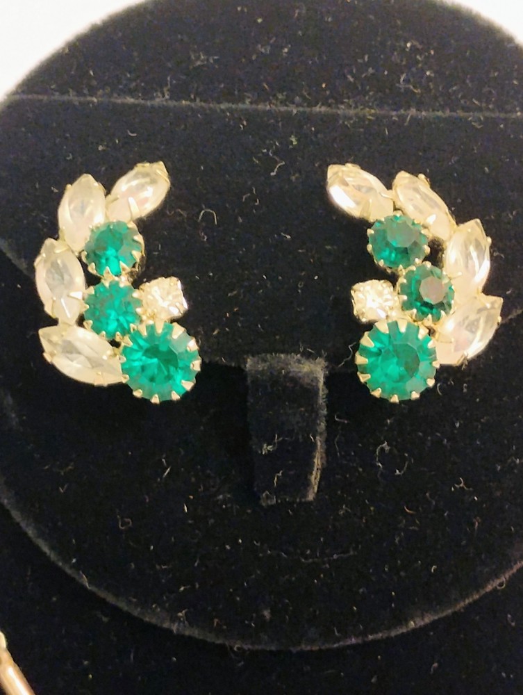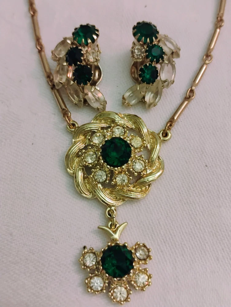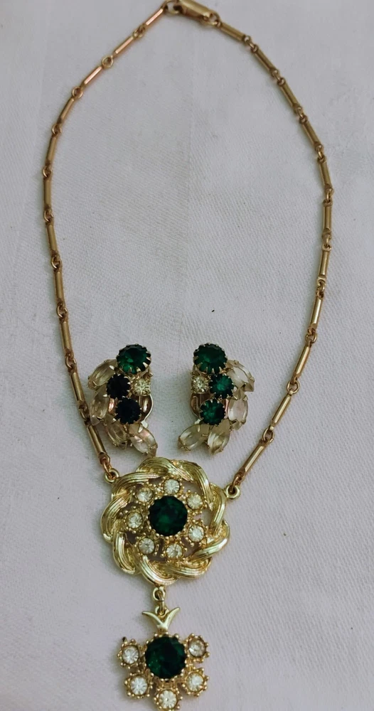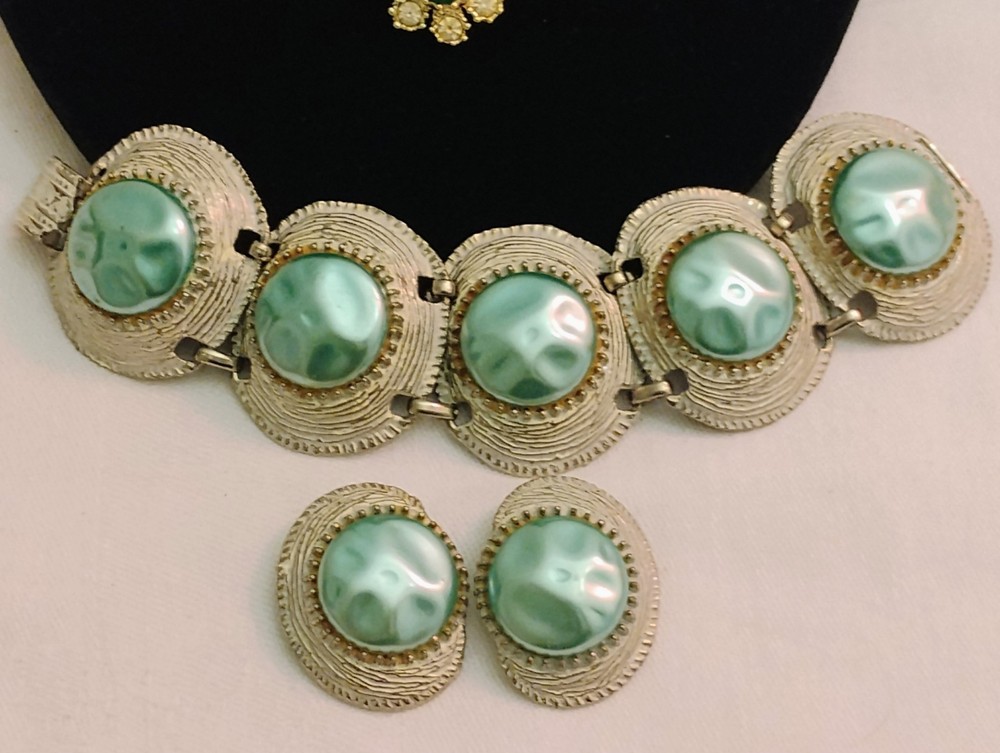 These vintage jewelry set from the 60's to 80's features a chunky faux baroque pearl bracelet and clip earrings in very good condition photos does not give it's true justice also set in silvertone is a beautiful emerald green rhinestones necklace and clip earrings purchased as a set the green stones are identical.These sets exudes a sense of beauty and nostalgia, perfect for women who appreciate unique and statement-making pieces of vintage jewelry. Made in the United States, these original set are a great addition to any jewelry collection for those who appreciate classic style with a modern Payment is due at end of purchase.Buyer never paid for my last sale therefore the earring lot will be relisted tomorrow also I will begin leaving feedback when it has been left.Thanks for looking buy with complete confidence,shipping safely in gift box.
