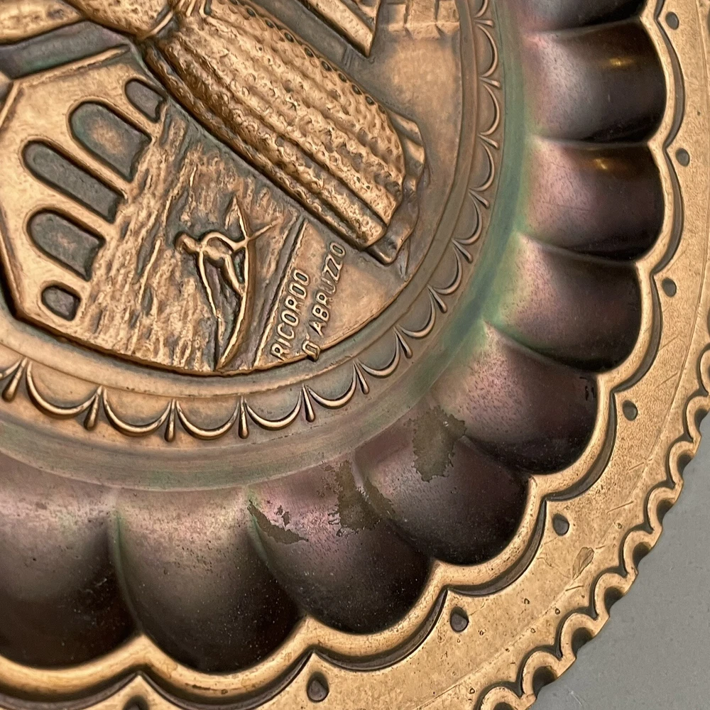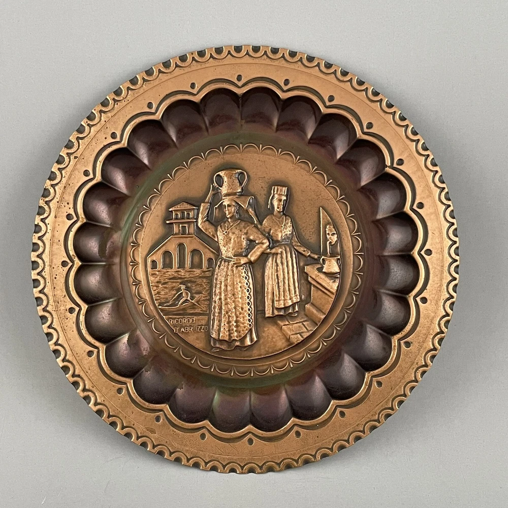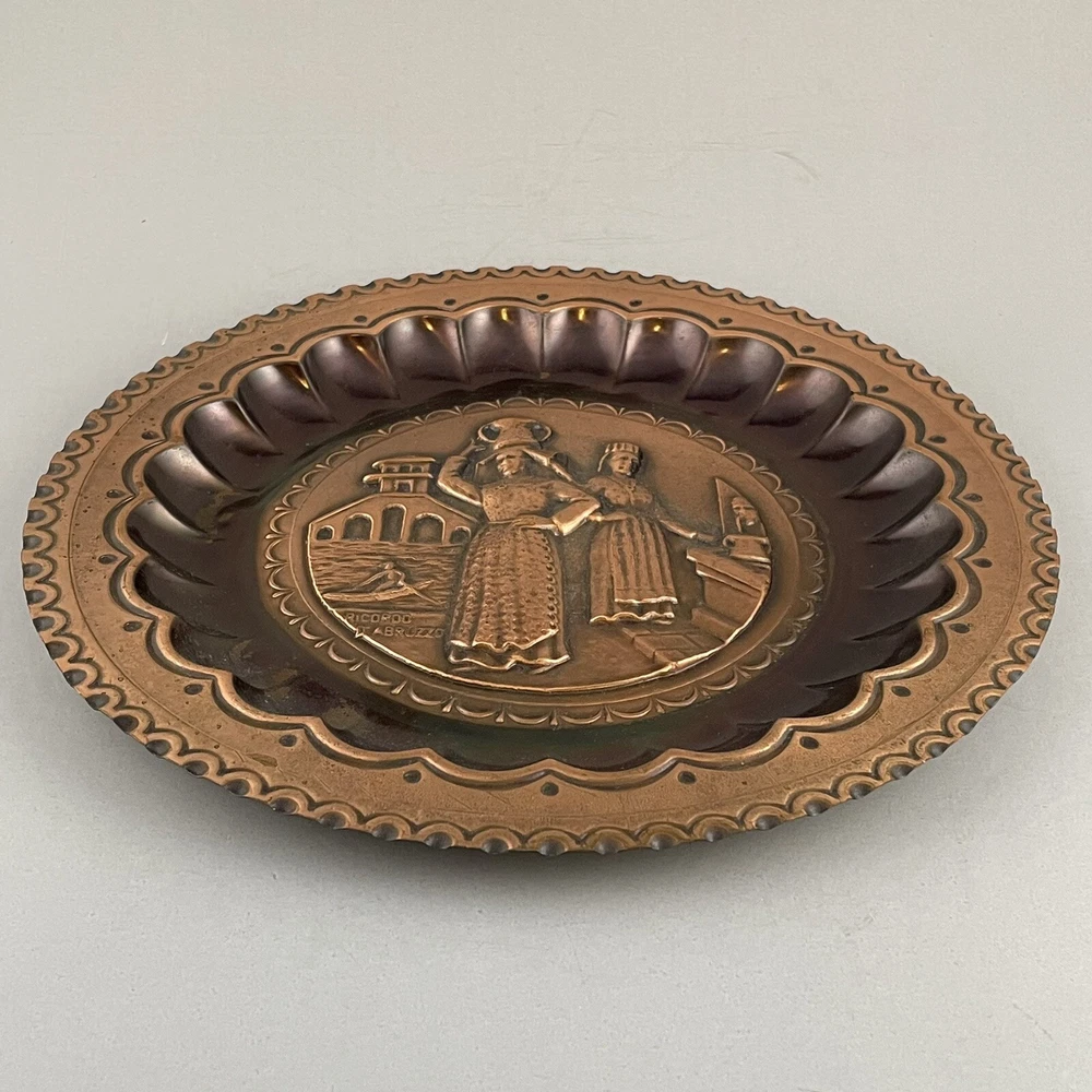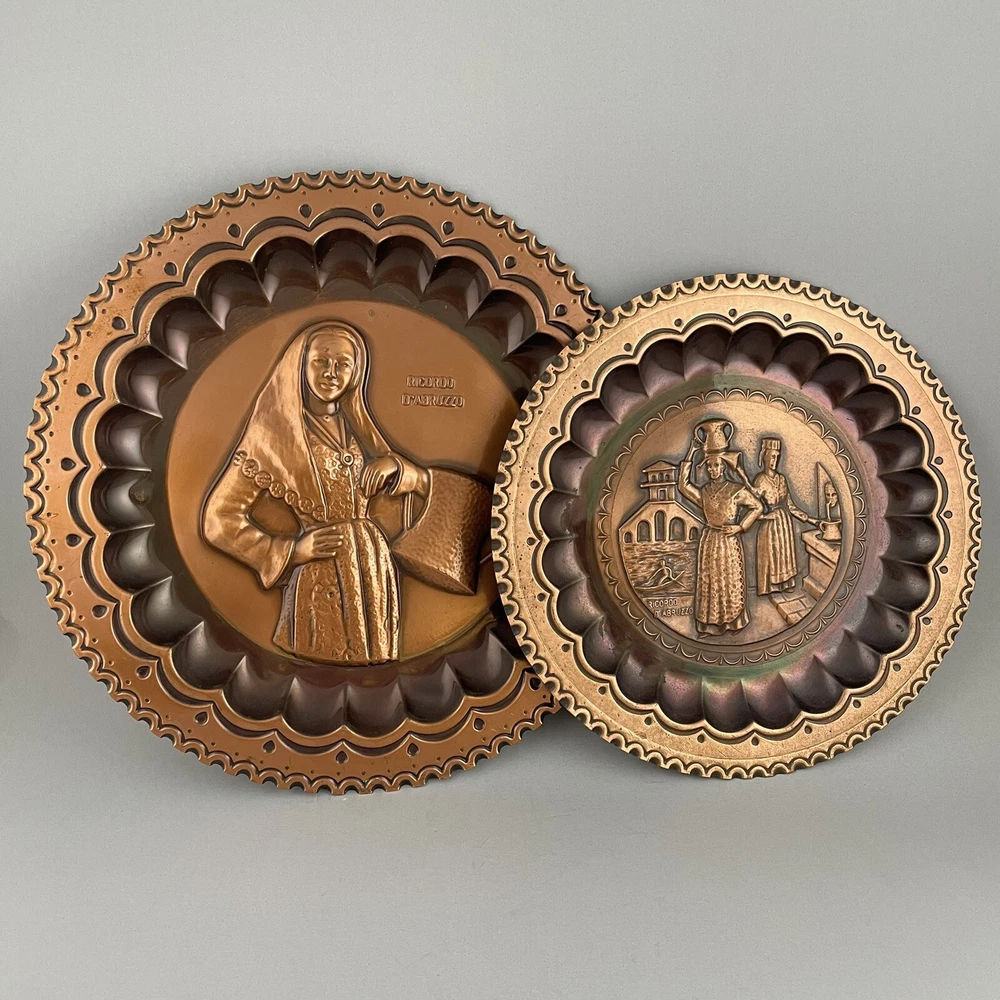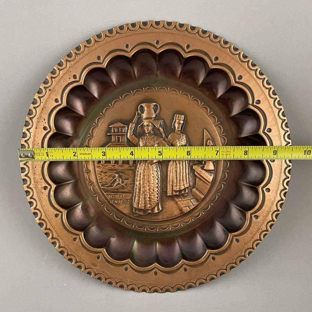 Vintage Ricordo D'Abruzzo Copper Wall Plates Italy Lot of 2 Diameter of larger plate: 11-1/2" Diameter of smaller plate: 9-1/2" Note: Color may differ slightly in photos due to flash, lighting and screen resolution Pre-owned condition Both plates have some tarnish/oxidation, scratches, and a few dings See all photos 2024-124