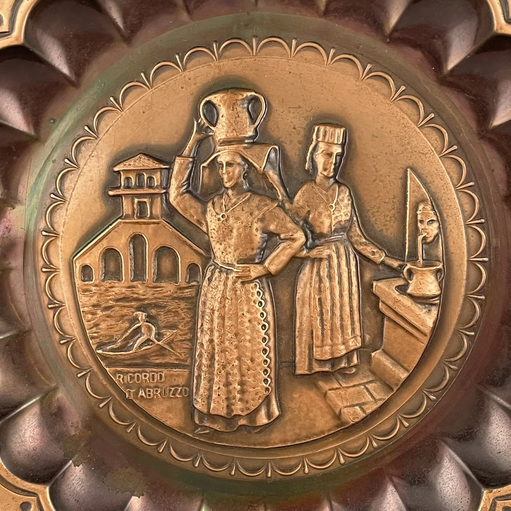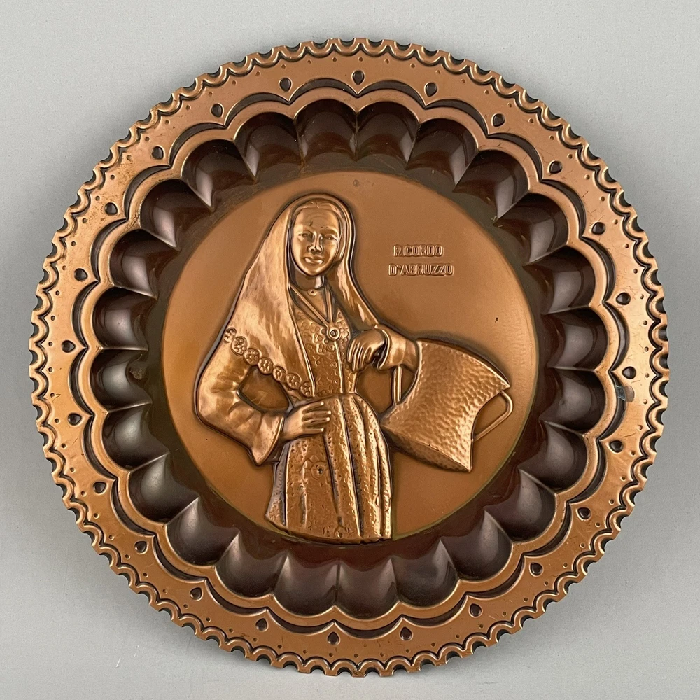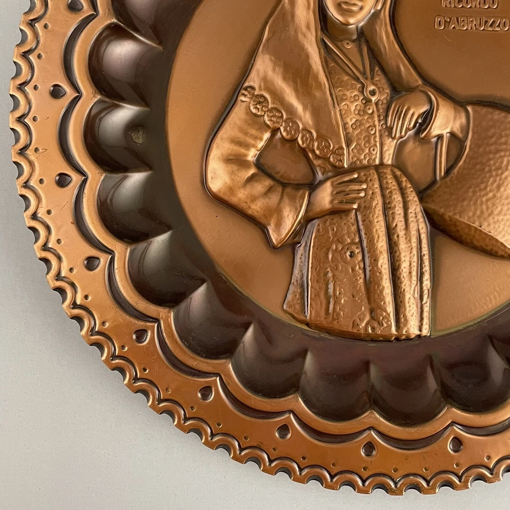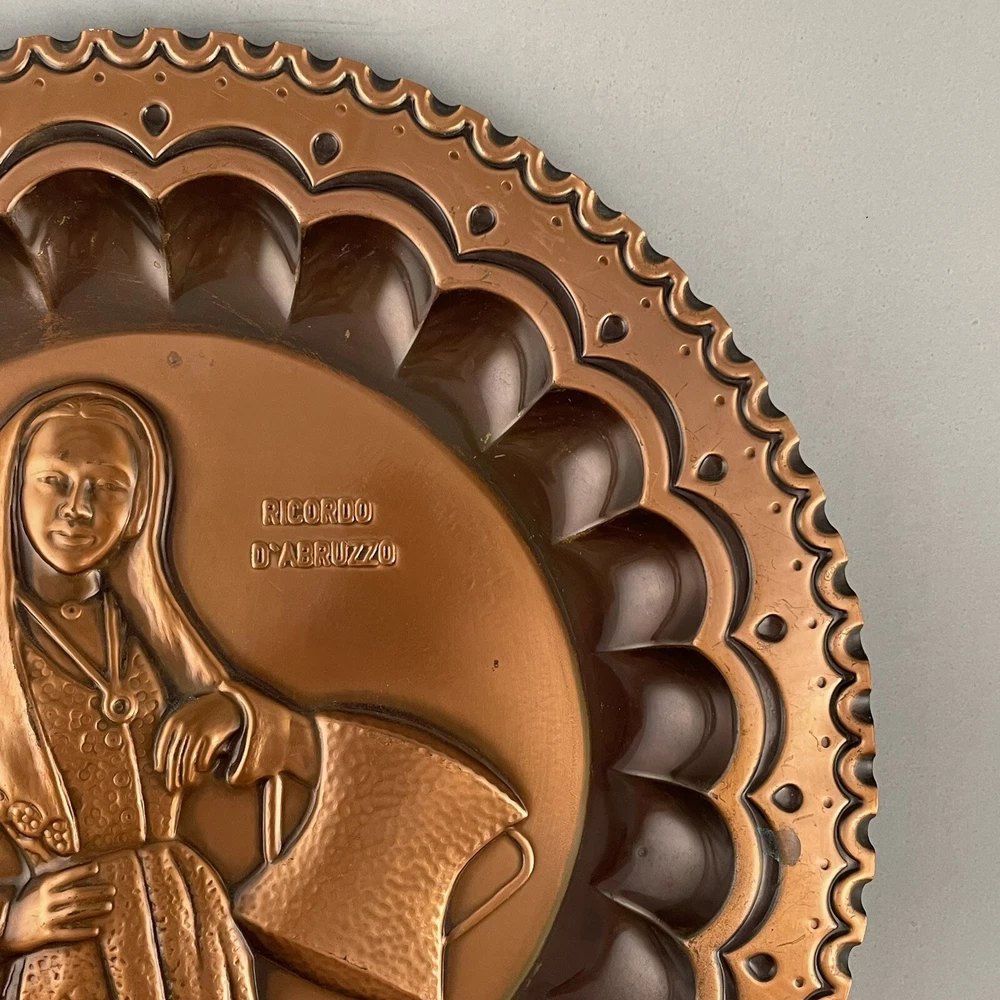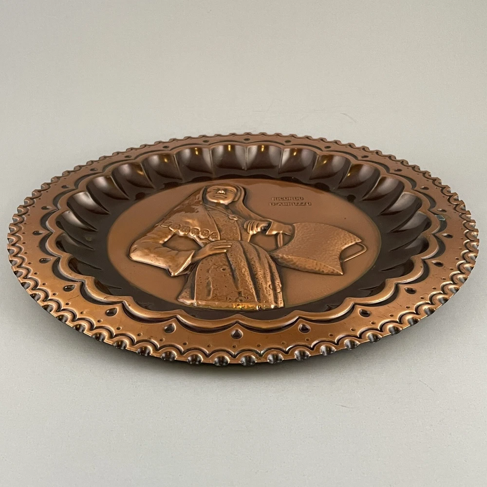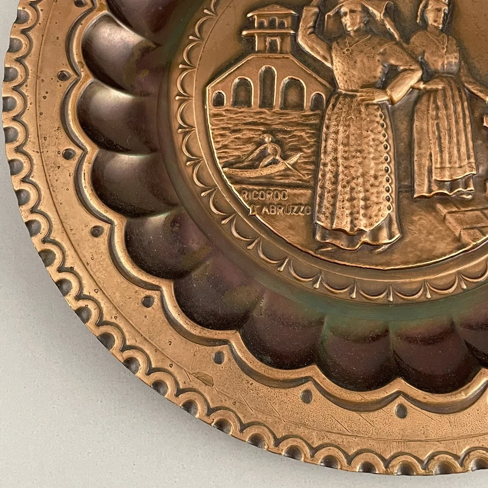 Vintage Ricordo D'Abruzzo Copper Wall Plates Italy Lot of 2 Diameter of larger plate: 11-1/2" Diameter of smaller plate: 9-1/2" Note: Color may differ slightly in photos due to flash, lighting and screen resolution Pre-owned condition Both plates have some tarnish/oxidation, scratches, and a few dings See all photos 2024-124