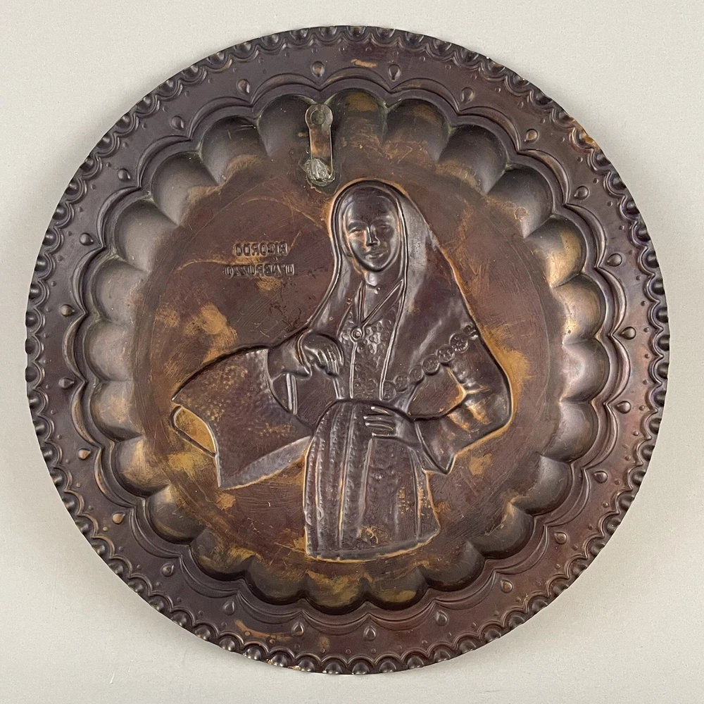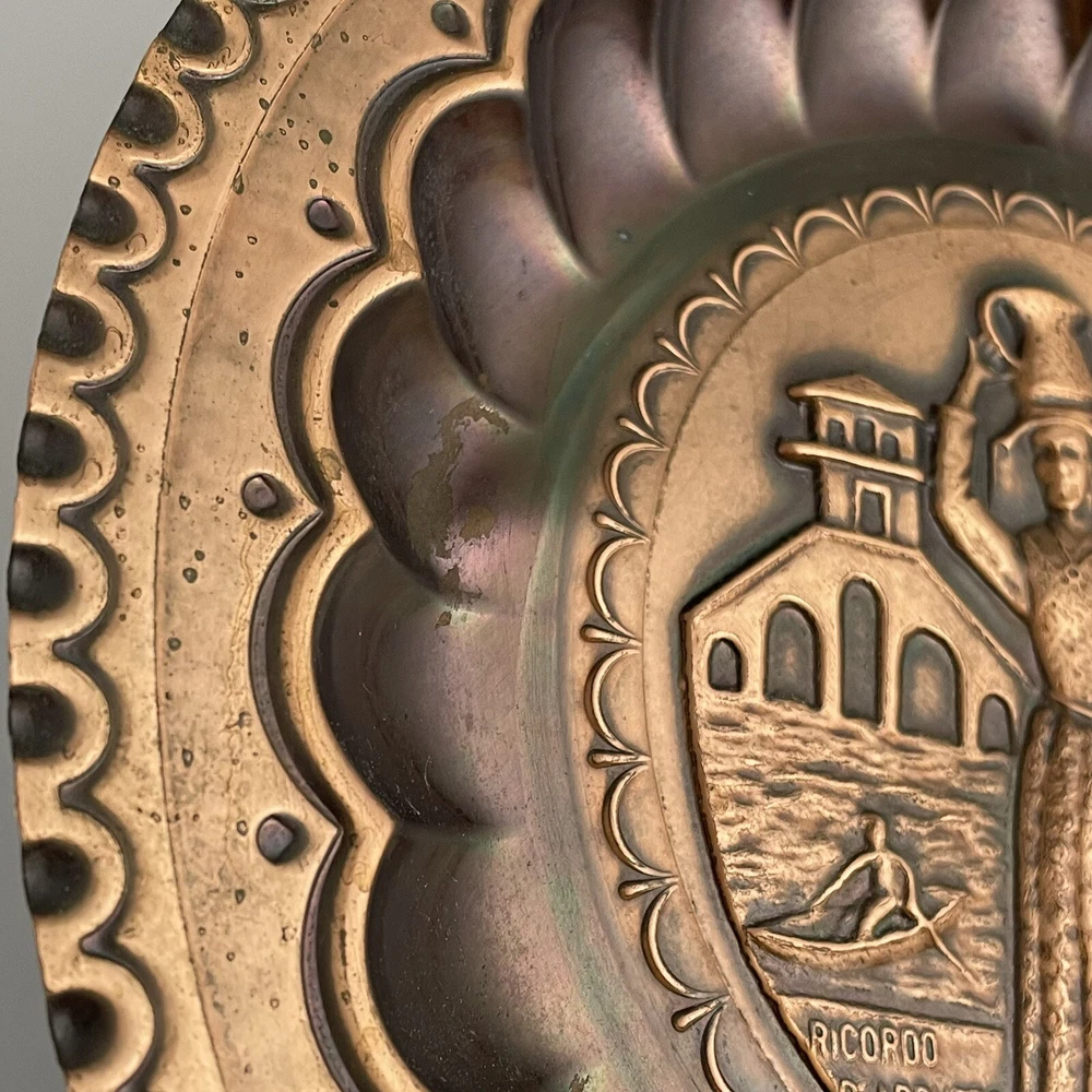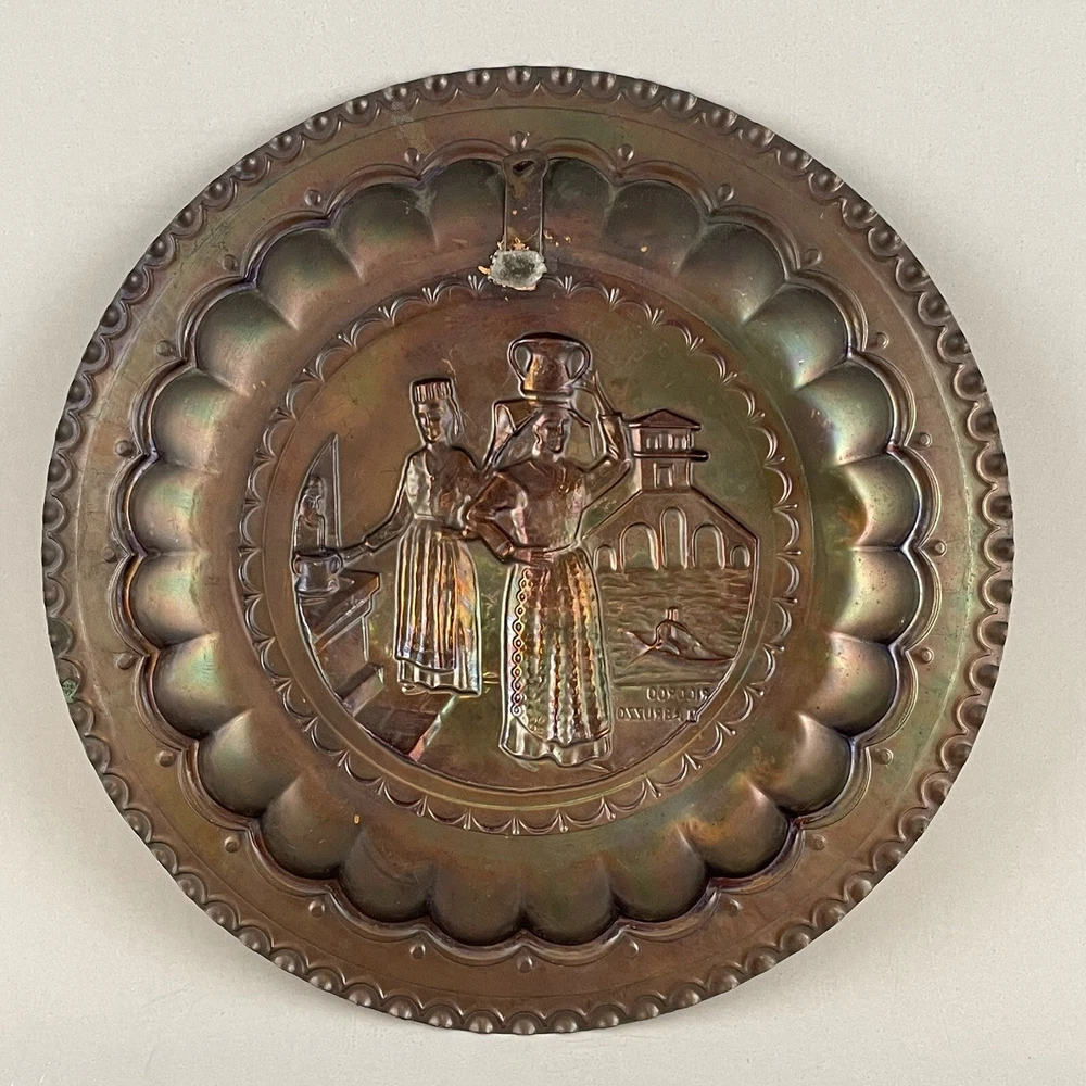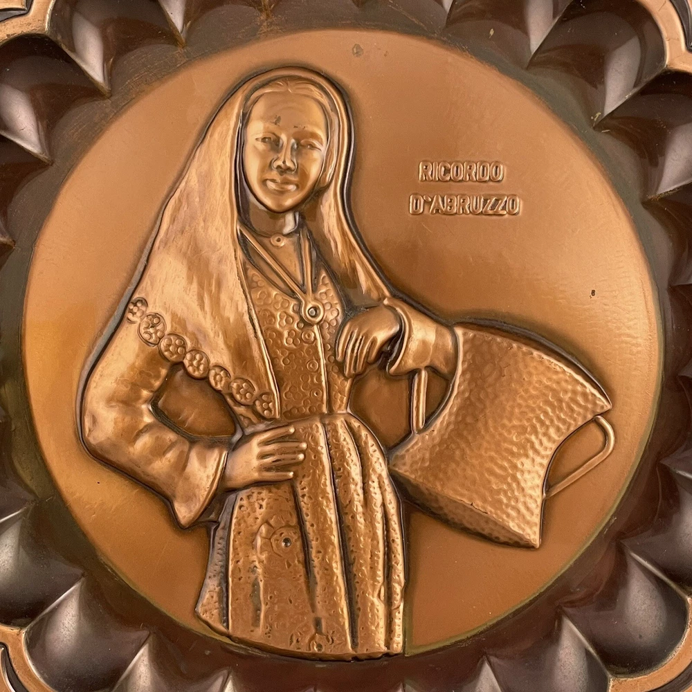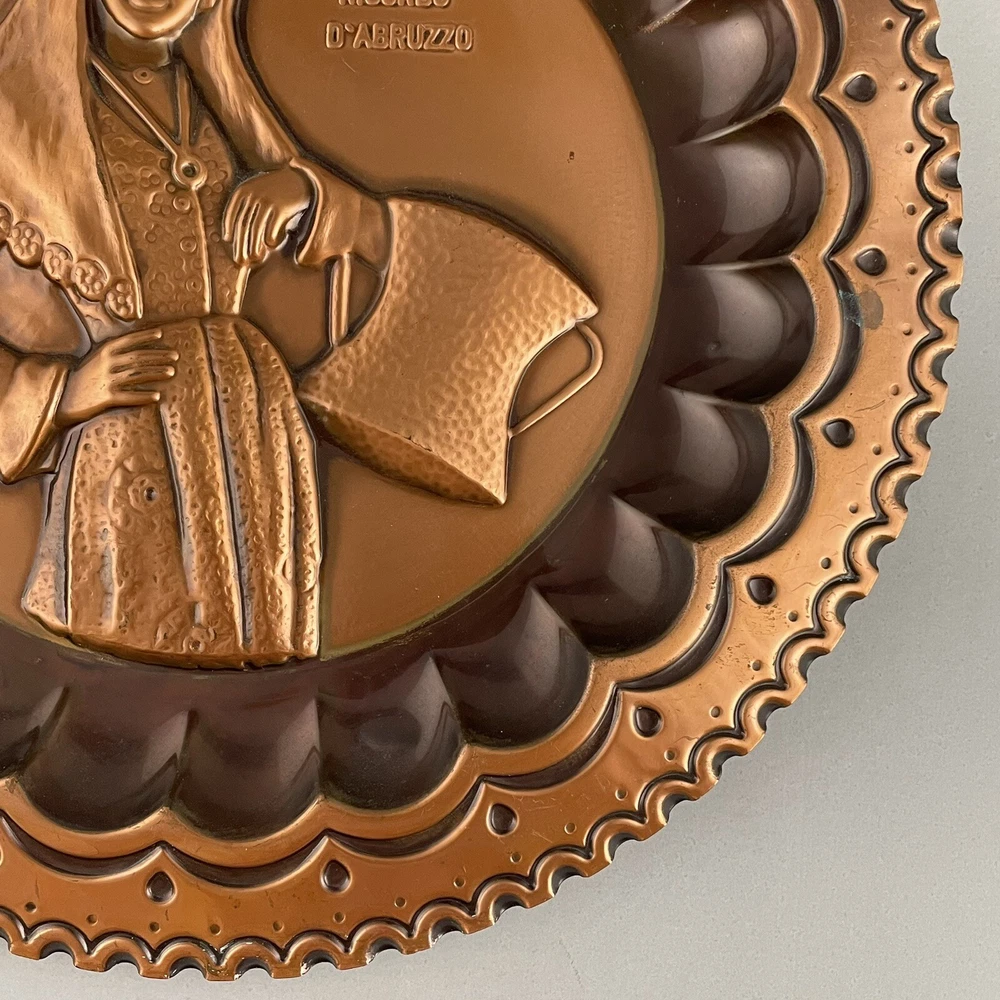 Vintage Ricordo D'Abruzzo Copper Wall Plates Italy Lot of 2 Diameter of larger plate: 11-1/2" Diameter of smaller plate: 9-1/2" Note: Color may differ slightly in photos due to flash, lighting and screen resolution Pre-owned condition Both plates have some tarnish/oxidation, scratches, and a few dings See all photos 2024-124