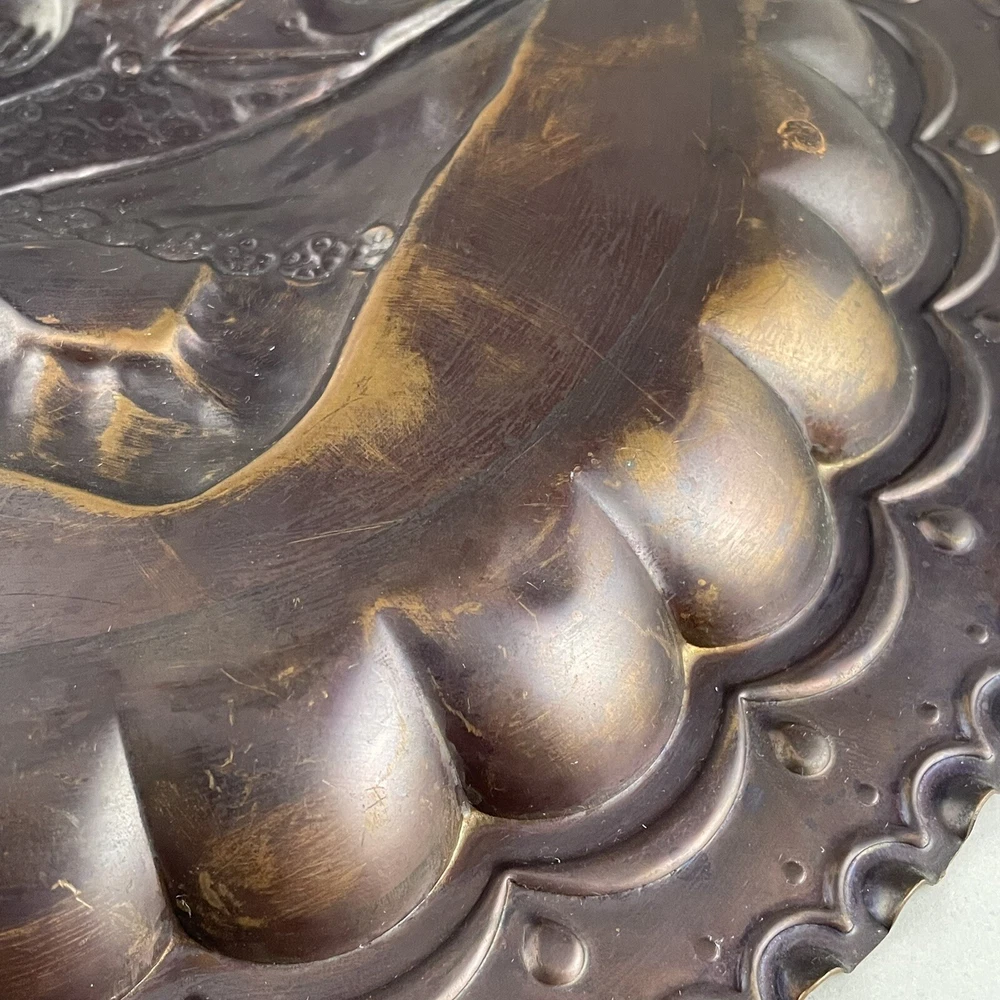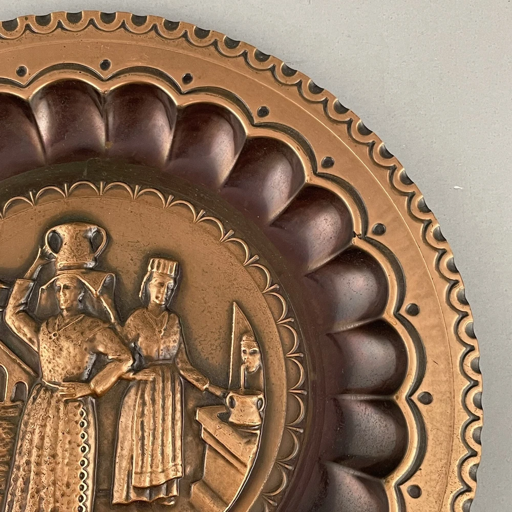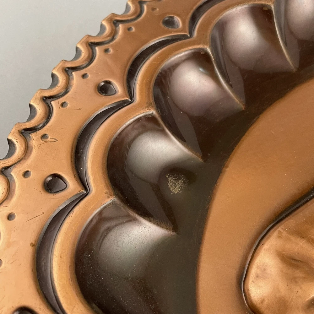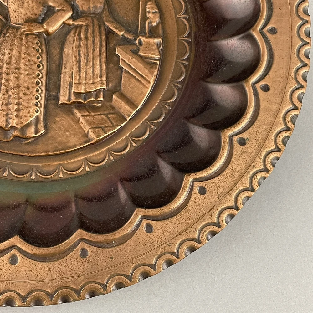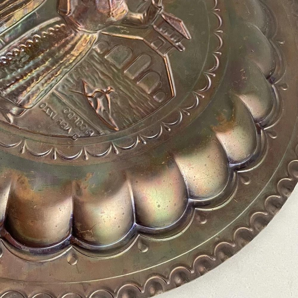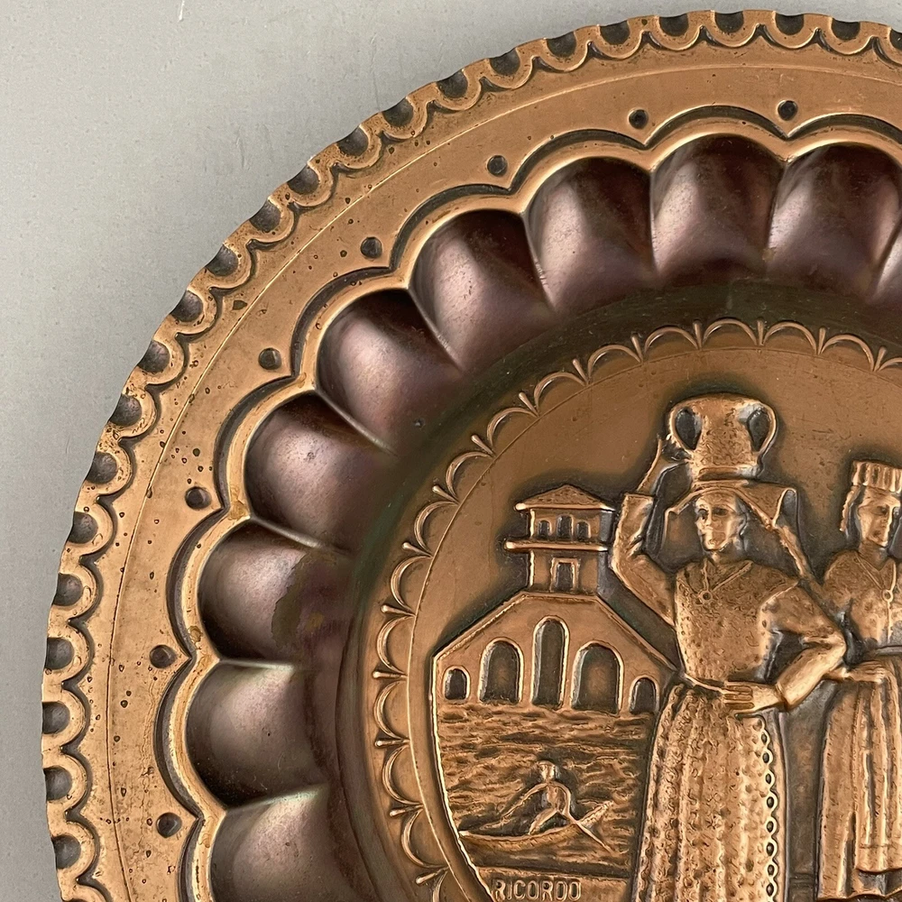 Vintage Ricordo D'Abruzzo Copper Wall Plates Italy Lot of 2 Diameter of larger plate: 11-1/2" Diameter of smaller plate: 9-1/2" Note: Color may differ slightly in photos due to flash, lighting and screen resolution Pre-owned condition Both plates have some tarnish/oxidation, scratches, and a few dings See all photos 2024-124