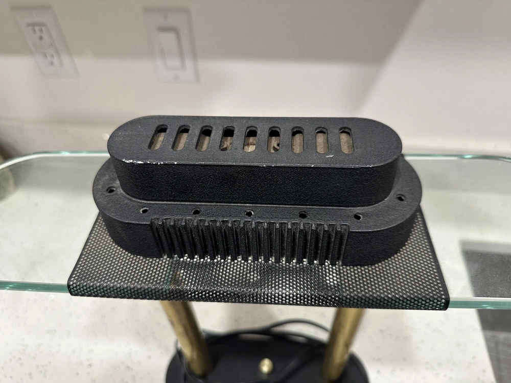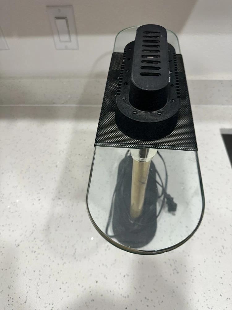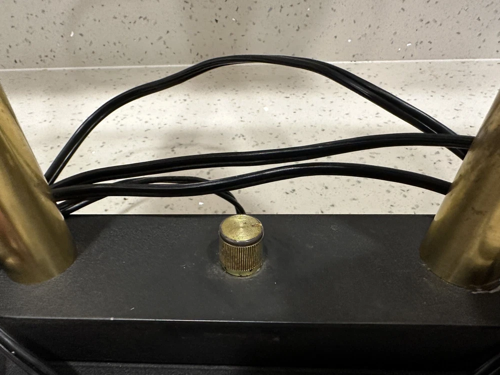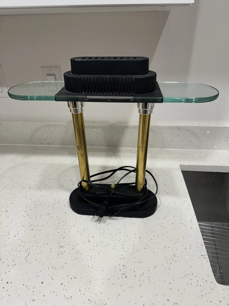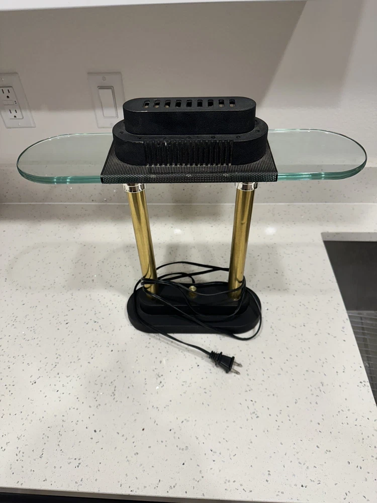 This vintage Robert Sonneman desk lamp is a unique addition to any collection. With a funky, shaded design and a glossy finish, it's sure to catch the eye of anyone who sees it. The lamp is made of brass, glass, and metal, and features a black cord and a knob control. Lamp is sold for parts only, no bulb. Please see all pictures and angles before purchase. Sold as is