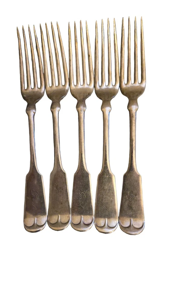 Add some vintage flair to your dining table with this beautiful set of 5 forks from 1847 Rogers Bros. The coin pattern and monogrammed "Gard" make these forks a unique addition to any collection. Crafted from silverplate, they are durable and perfect for everyday use. Perfect for collectors or anyone who appreciates antique silverware. I STRUGGLED FINDING.WHAT THESE QERE EXACTLY BUT ONE LIATINF HAD RHEM AS COIN PATTERN. IM NOT POSITICE. THEY APPEAR TO HAVE GARD MONGEAMED ON THEM AND ARE OLD AND VINTAGE. HEAVY FORKS LOT OF 5