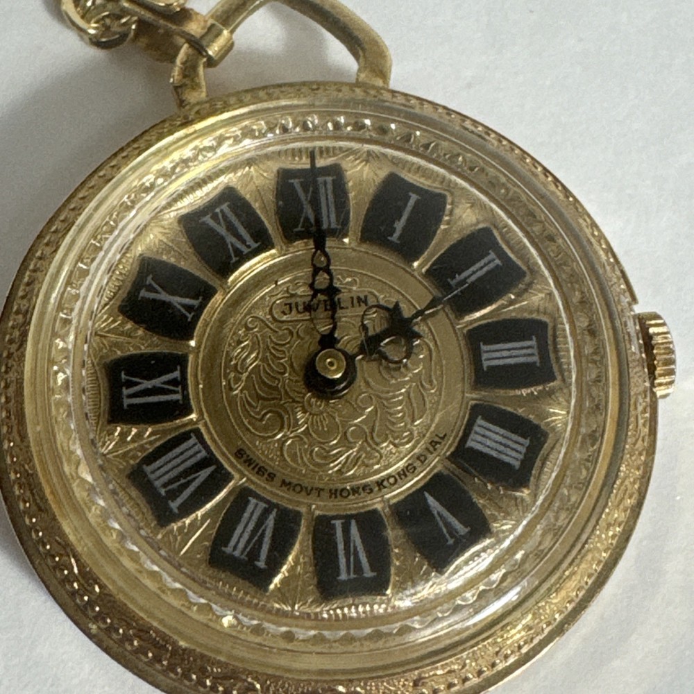 A Vintage Juvelin Roman Numeral Pocket Watch with Chain Swiss Hong Kong, Gift for him/her Unsure if it works. Sold as is