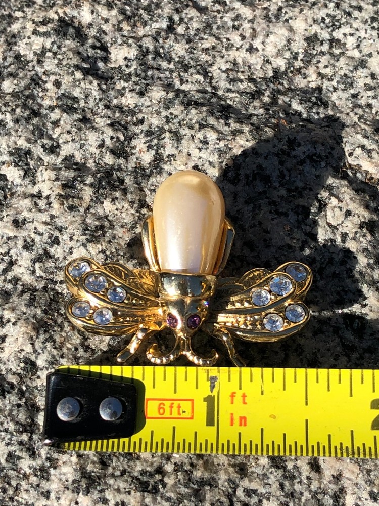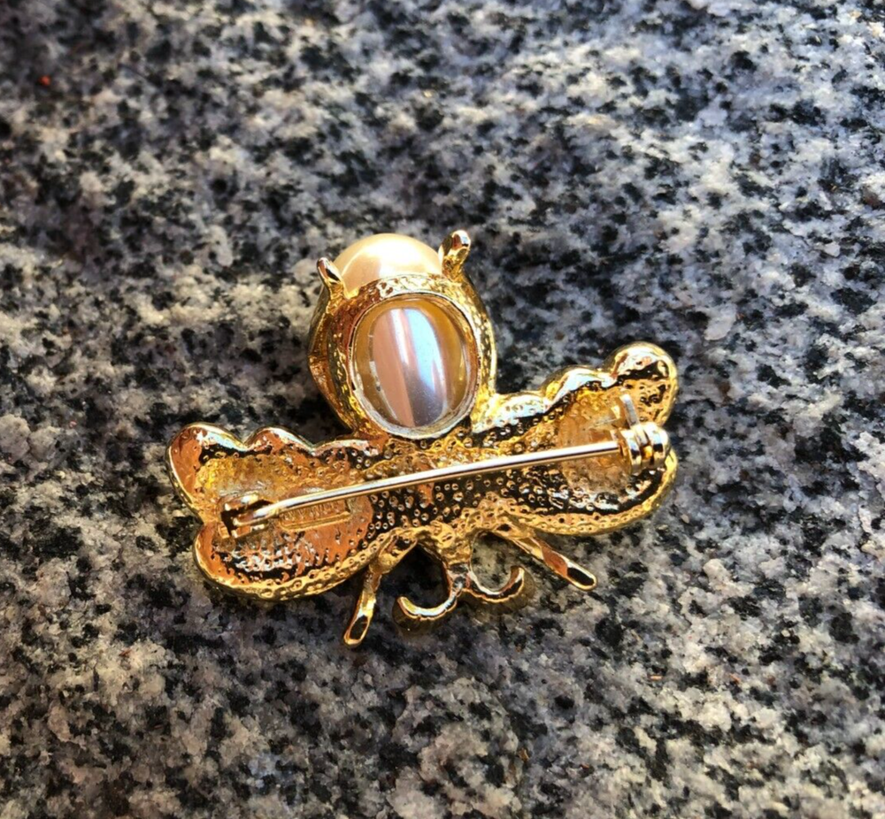 Vintage Estate Gold Tone Jelly Belly Faux Pearl Bee Pin brooch Signed Roman