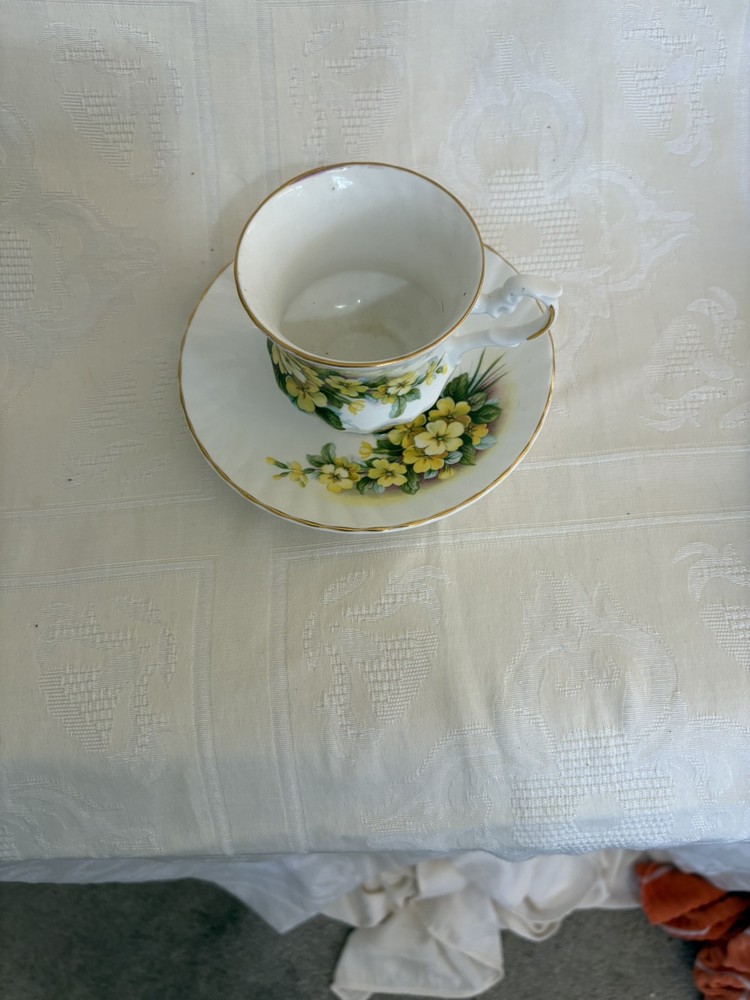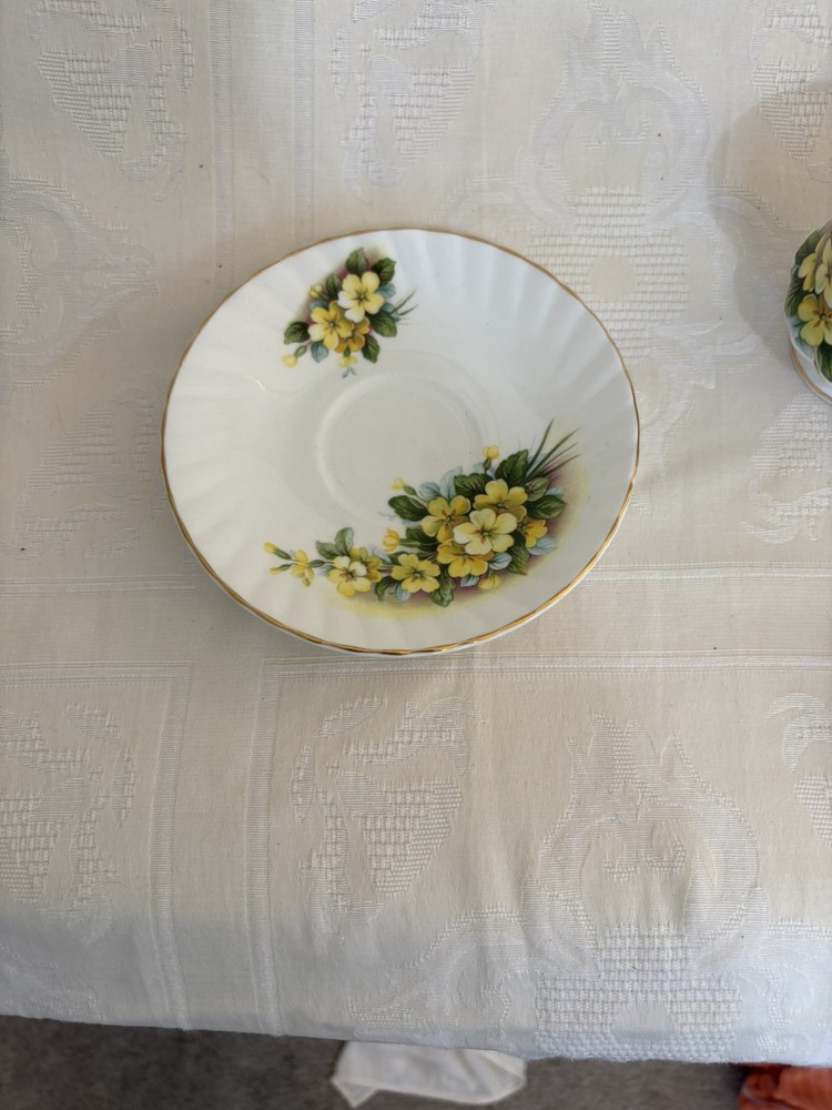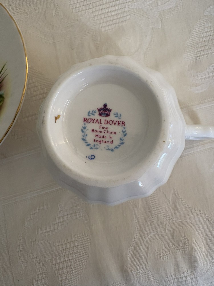 This is a vintage Royal Dover fine bone china tea cup and saucer set in a Queen Anne style. The set features a floral pattern in white and yellow colors, and is made of ceramic and porcelain. It was manufactured in England and is considered collectible.