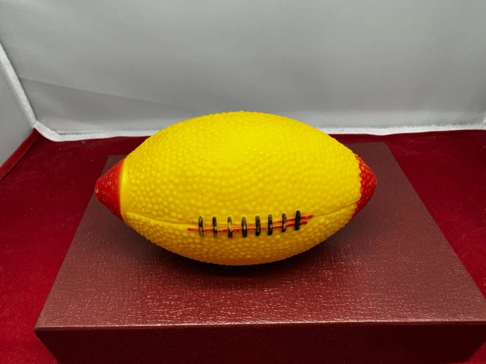 This vintage rubber squeaky toy is in the shape of a mini football and is designed to make a squeaking sound when squeezed. It is a collectible item that appeals to those interested in vintage and antique toys. The toy is marked as "works," indicating that the squeaking mechanism is functional, adding to its charm for collectors of nostalgic items. Perfect for adding a touch of vintage charm to any toy collection.