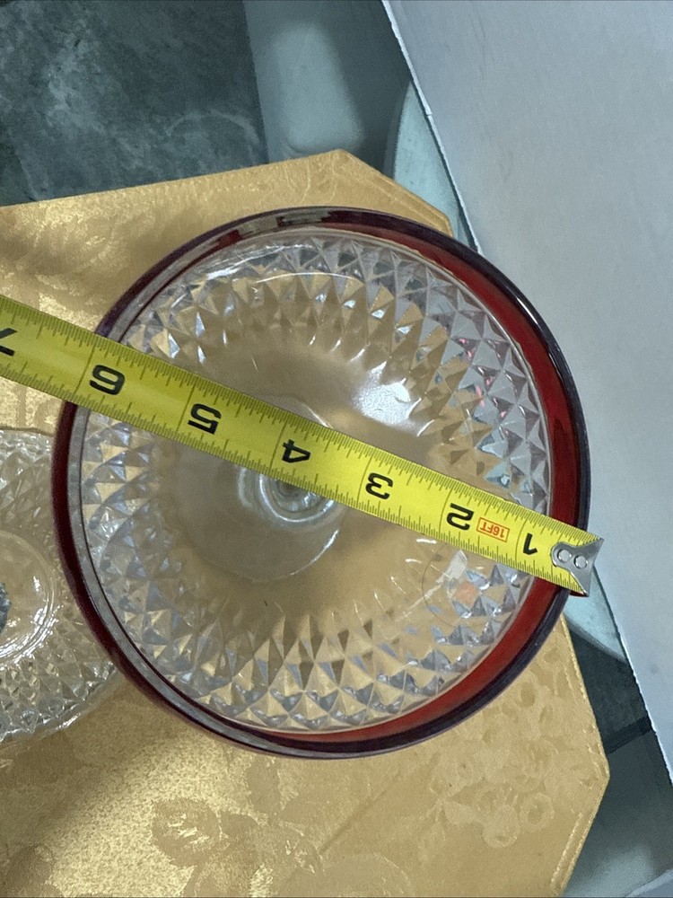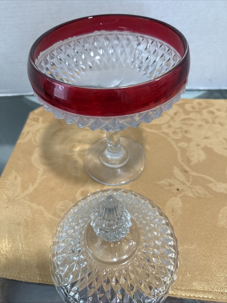 The Vintage Indiana Glass Ruby Red Flashed Diamond Point Compote with Lid is a beautiful piece of decorative collectible made of glass. This round bowl set features a clear and red color with a diamond pattern, showcasing the craftsmanship of the Indiana Glass Co. The set includes a compote or candy dish with a lid, measuring 12 inches in height and 3 inches in depth, with a bowl diameter of 6.5 inches. This original piece from the United States adds a touch of elegance to any collection or display. Look at the pictures before making your purchase