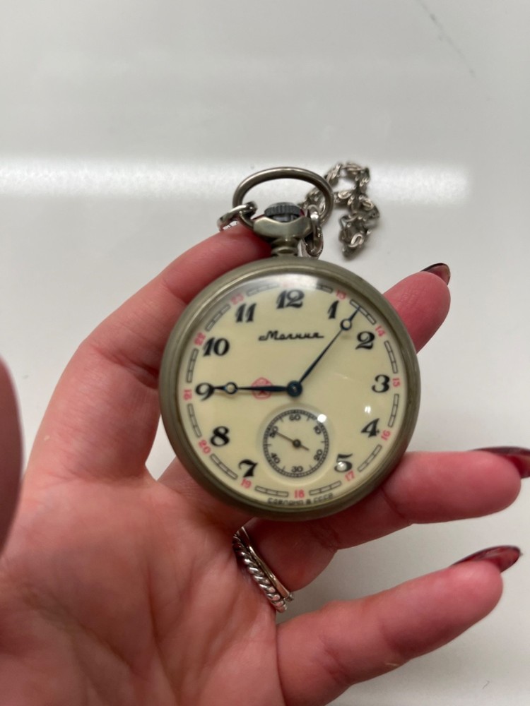 Molnija pocket watch, a mechanical timepiece produced in Russia by the Chelyabinsk Watch Factory "Molnija" (Молния, Russian for lightning). Vintage