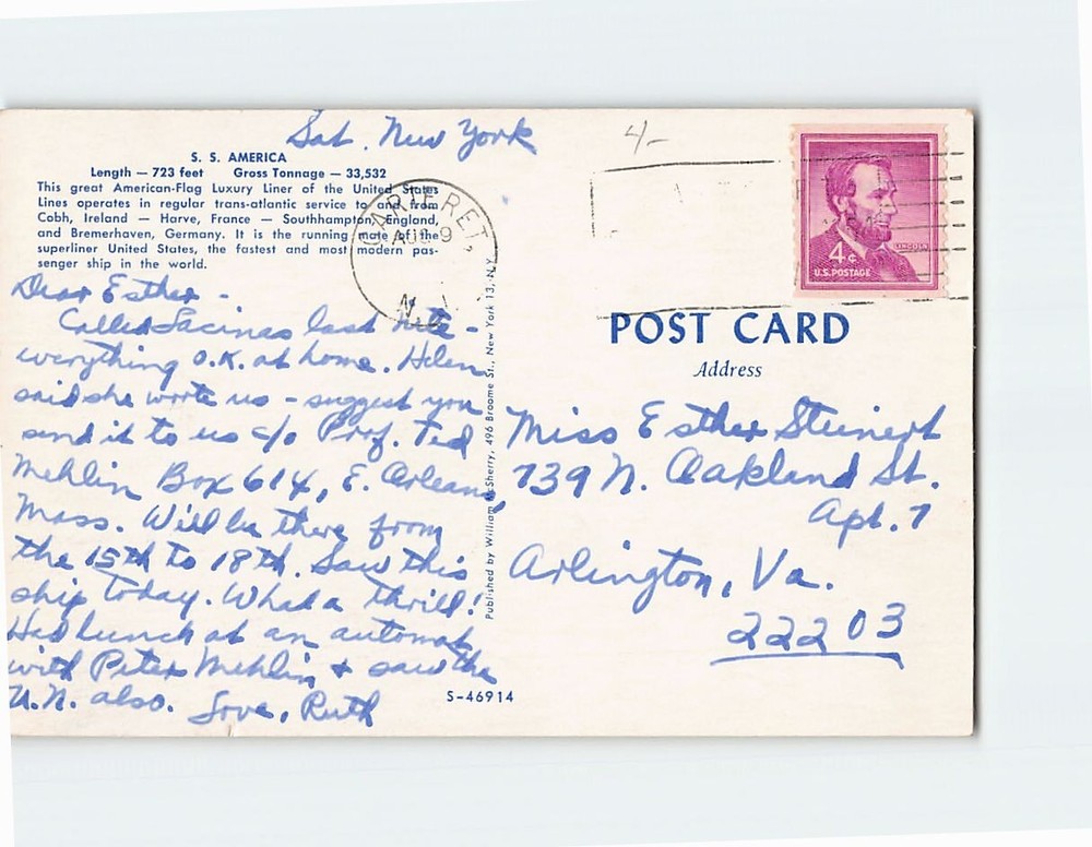 Postcard with image S. S. America United States Lines P-206920 Postcards from various collections. Many used and most show signs of use. see pictures for details on condition. To get combined shipping rate items must be paid for at the same time. Please verify your invoice is correct before you pay. If shipping charges or anything else is not correct please email me so I can try to assist before you pay. Once paid for I am not able to add additional items to the combined shipping. We ship using US Mail, Items are packed and shipped by the next business day. Speed of delivery may take longer during peak shipping seasons.