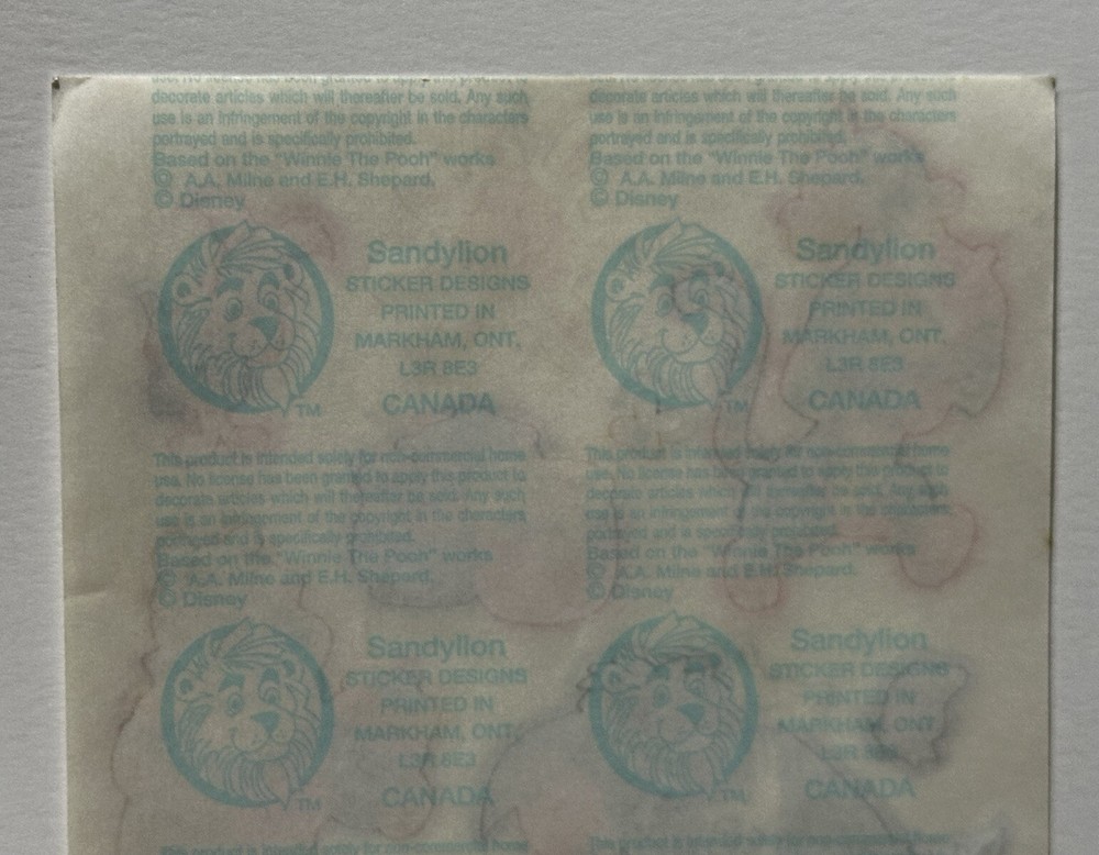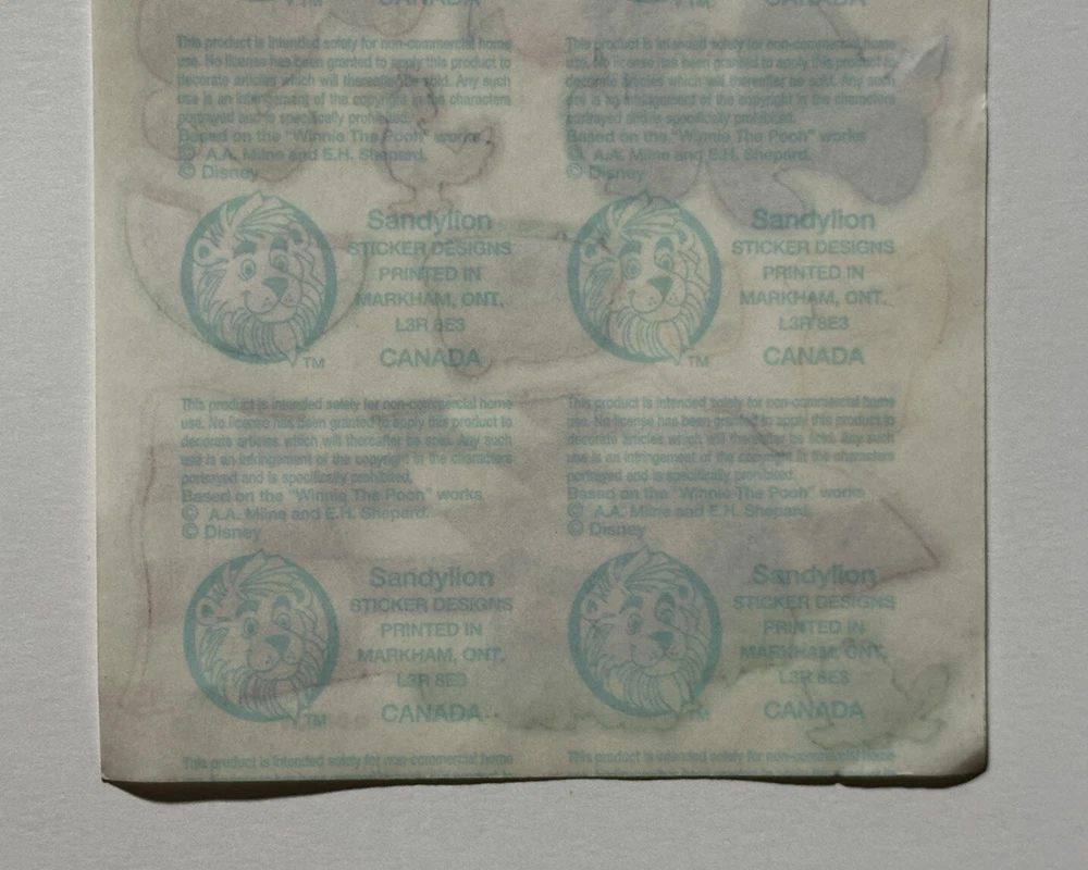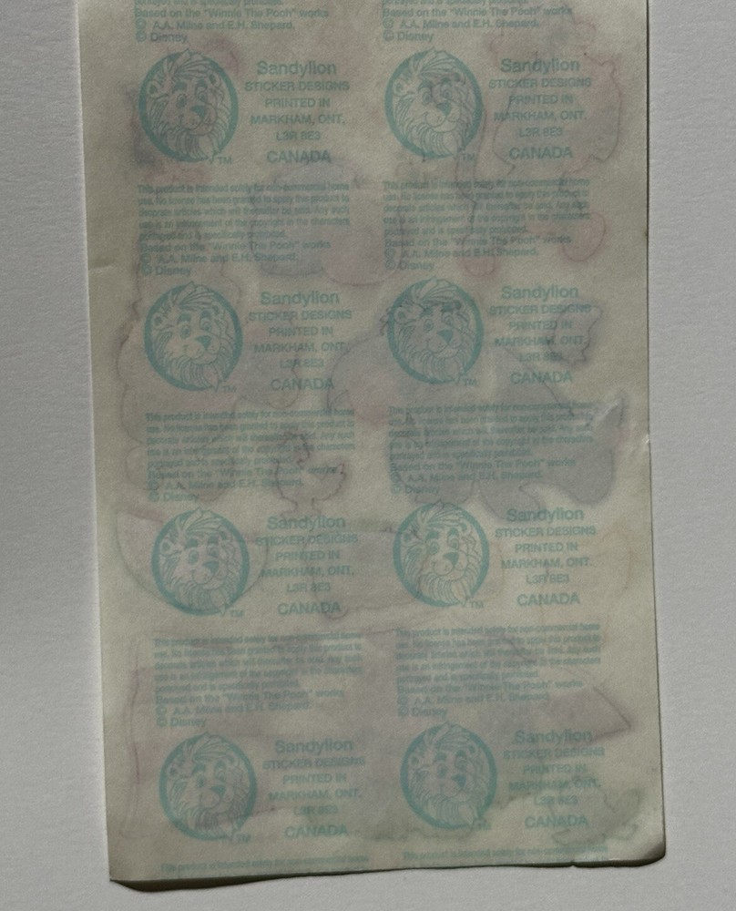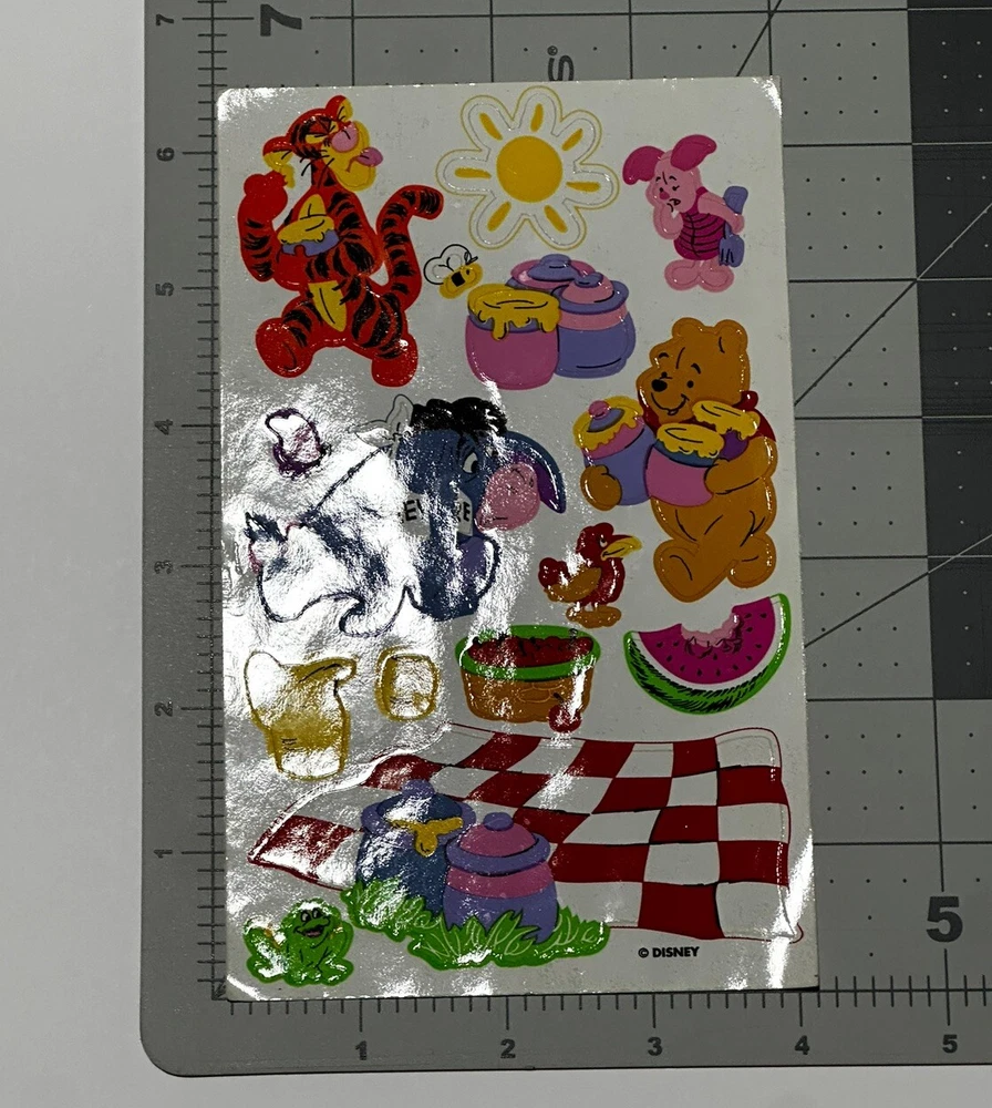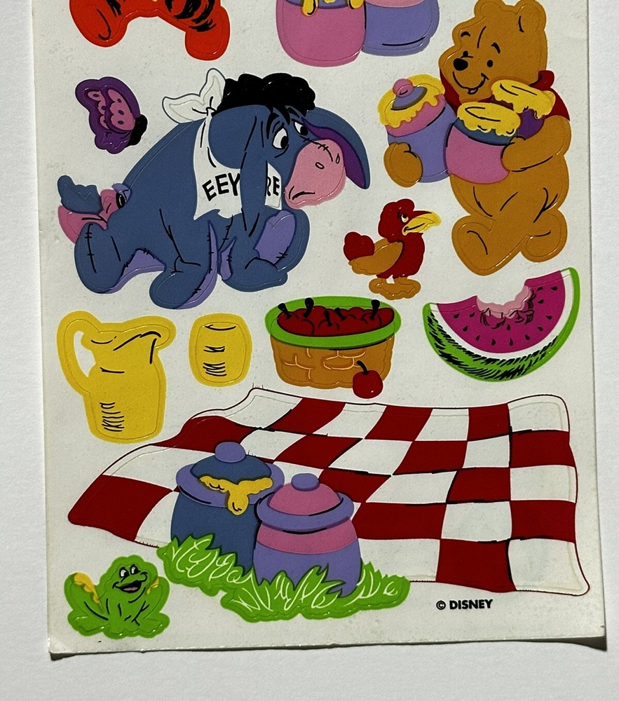 This sticker sheet from the vintage Disney and Sandylion collaboration. It features Winnie the Pooh and friends having a yummy picnic in the sun. These stickers will make a great addition to any vintage sticker collection, Winnie the Pooh fan, and/or crafter! The sticker sheet is in great, vintage condition with normal signs of wear from handle and time. Please review all of the pictures and ask any questions as this is sold as is. Thank you for your time! :)