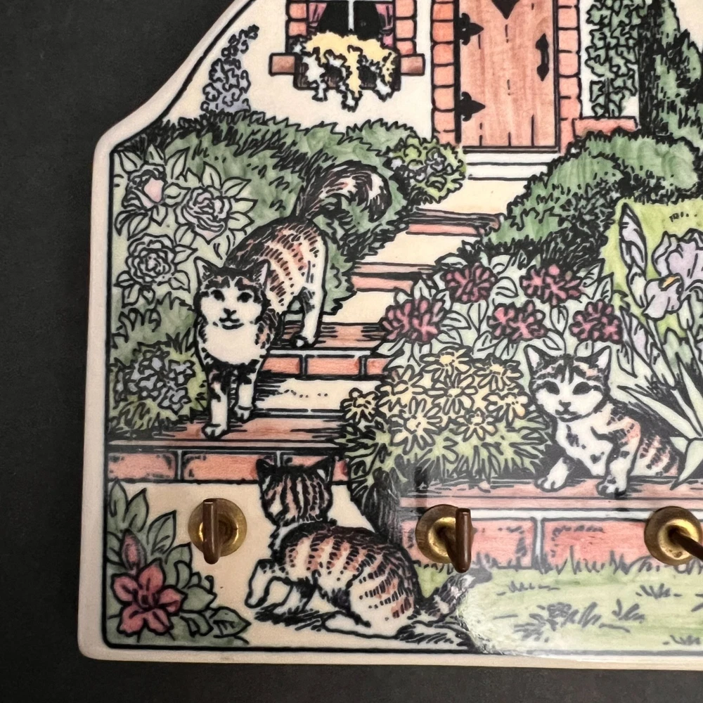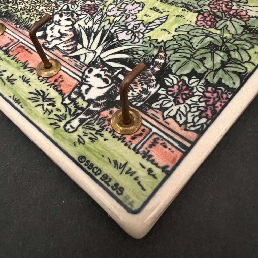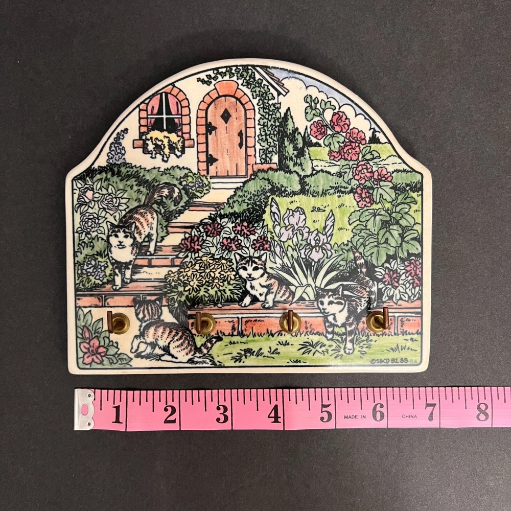 This charming vintage key holder features a delightful garden scene with playful cats, adding a touch of whimsy to your home decor. Crafted from durable ceramic, it provides an artistic and functional solution for organizing keys. The vibrant design ensures it stands out as a decorative piece on any wall. • Made of ceramic • Features 4 hooks • Colorful garden and cat design • Wall-mounted with two hooks on the back • Vintage 1995 SBC design Width = 7 inches, Height = 5.5 inches