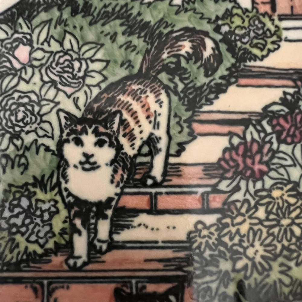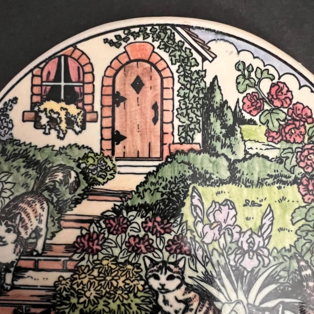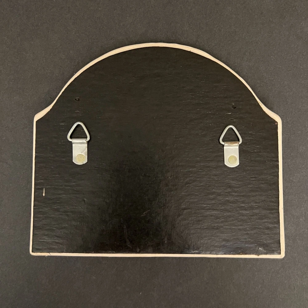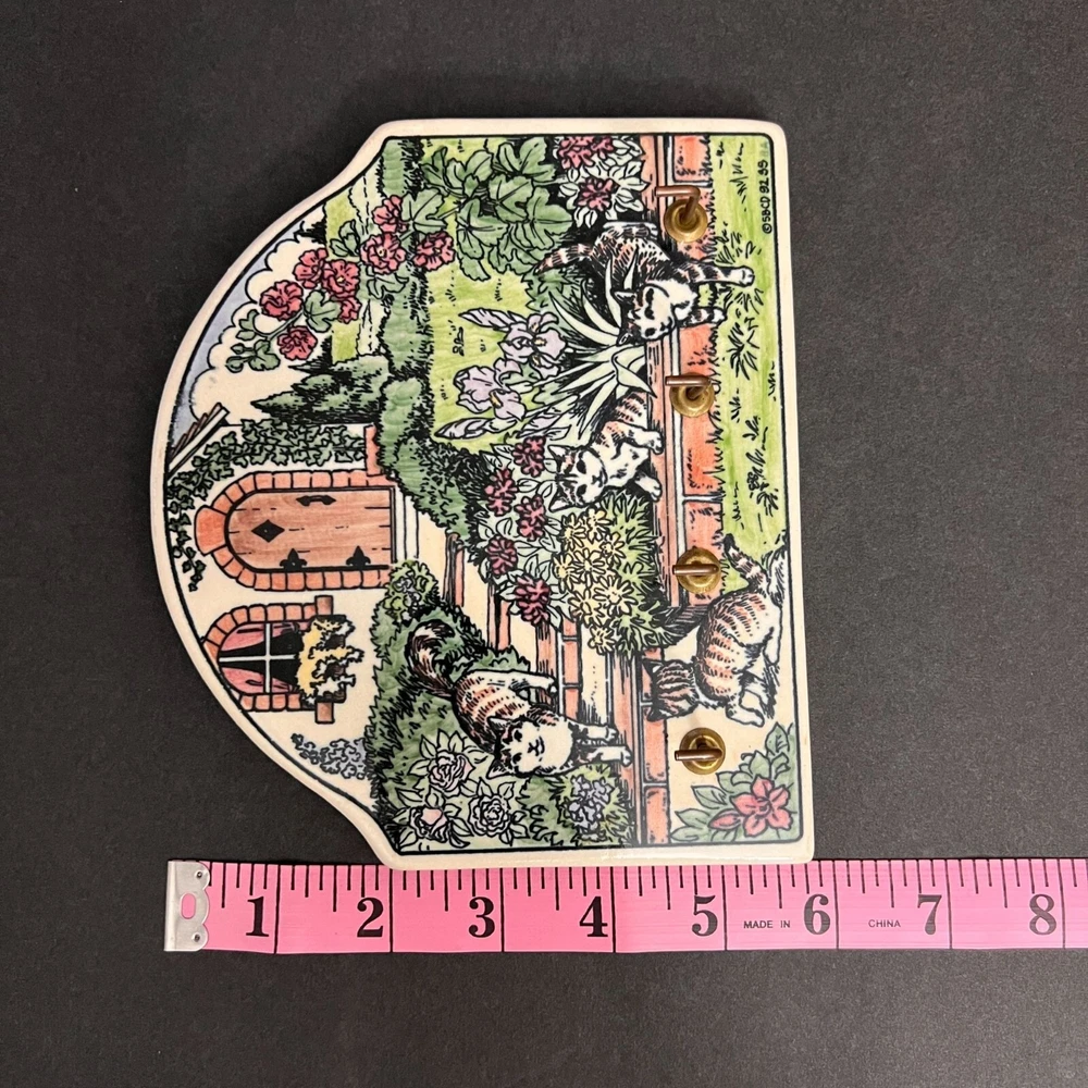 This charming vintage key holder features a delightful garden scene with playful cats, adding a touch of whimsy to your home decor. Crafted from durable ceramic, it provides an artistic and functional solution for organizing keys. The vibrant design ensures it stands out as a decorative piece on any wall. • Made of ceramic • Features 4 hooks • Colorful garden and cat design • Wall-mounted with two hooks on the back • Vintage 1995 SBC design Width = 7 inches, Height = 5.5 inches