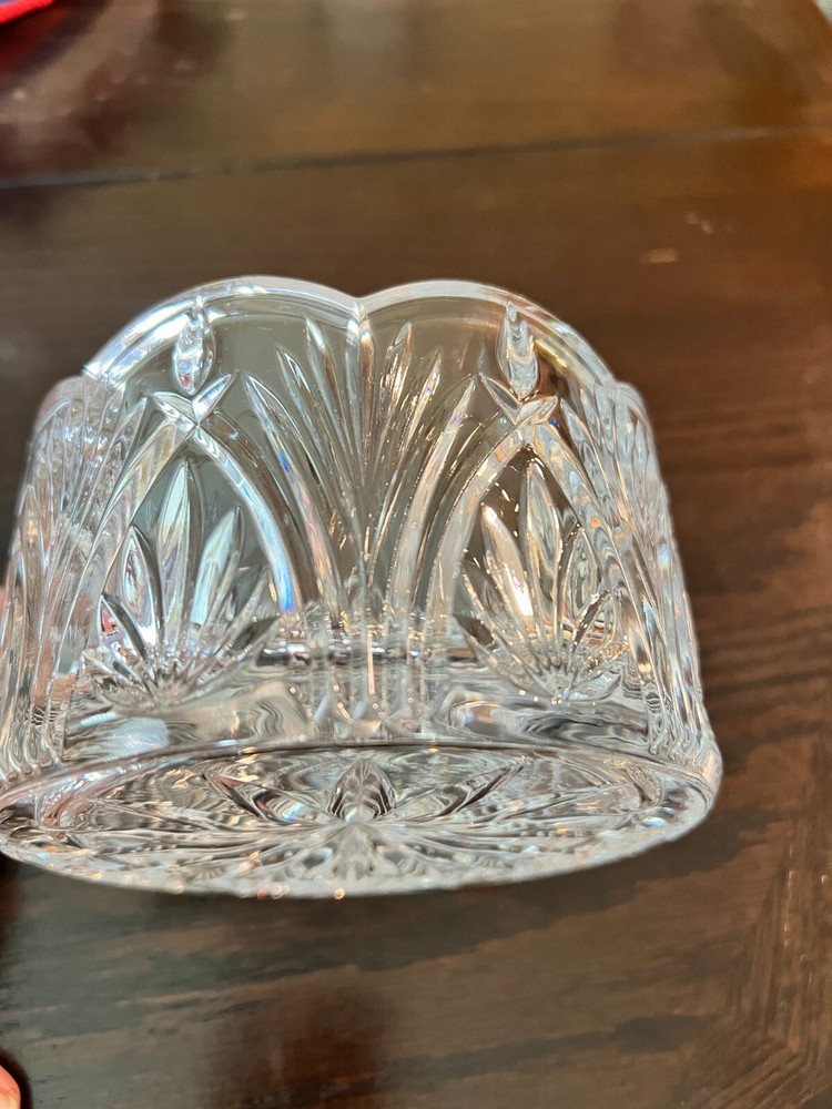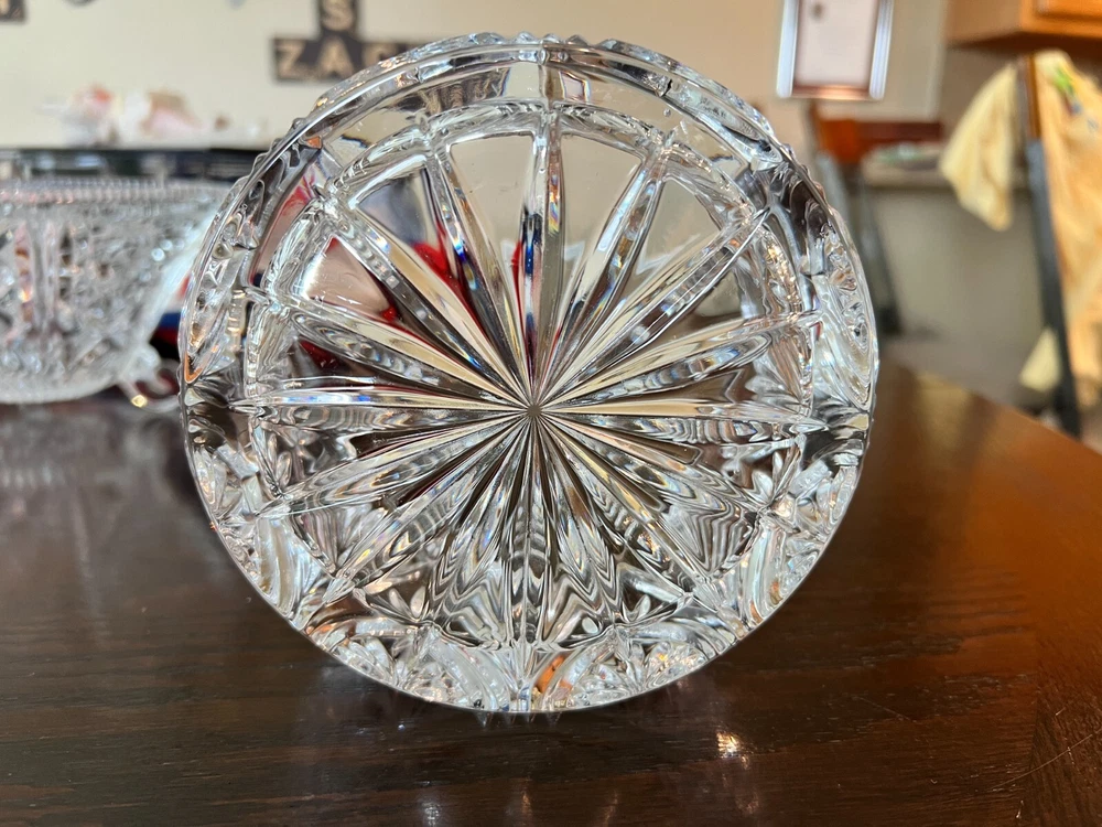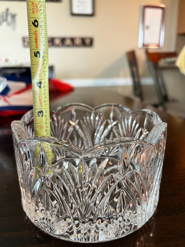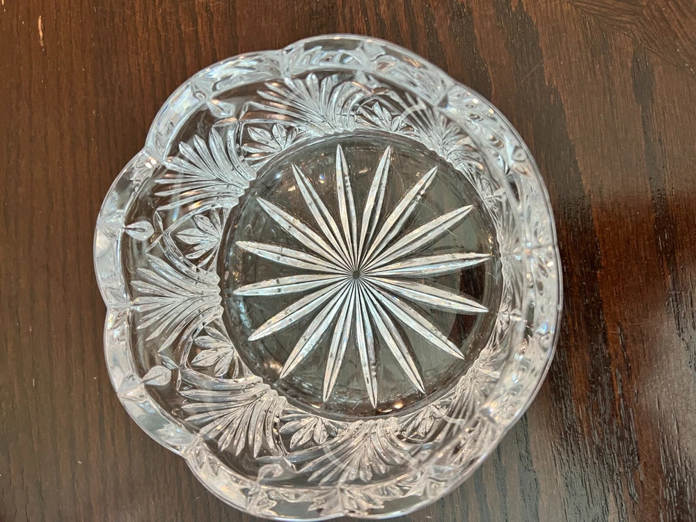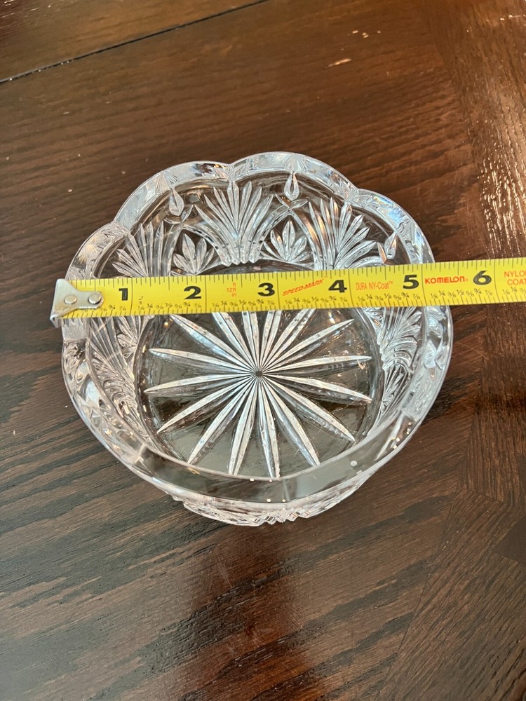 Small vintage pressed glass bowl with a scalloped edge , starburst base , and leaf/fan pattern . It measures approximately This makes it ideal as a candy dish , nut bowl , or individual serving dish —often used for formal or decorative settings in the mid-20th century. Elegant small vintage pressed glass bowl featuring a starburst base, scalloped rim, and ornate fan/leaf patterning. Perfect as a candy dish, nut bowl, or accent piece for any vintage-inspired setting. Measures approx. 5.5" across x 3.5" tall Heavy, clear pressed glass with great clarity and sparkle Mid-century American glass style Ideal for serving or display Condition: Excellent vintage condition No chips or cracks Clear and clean 📍Pickup in Temple, TX or shipping available