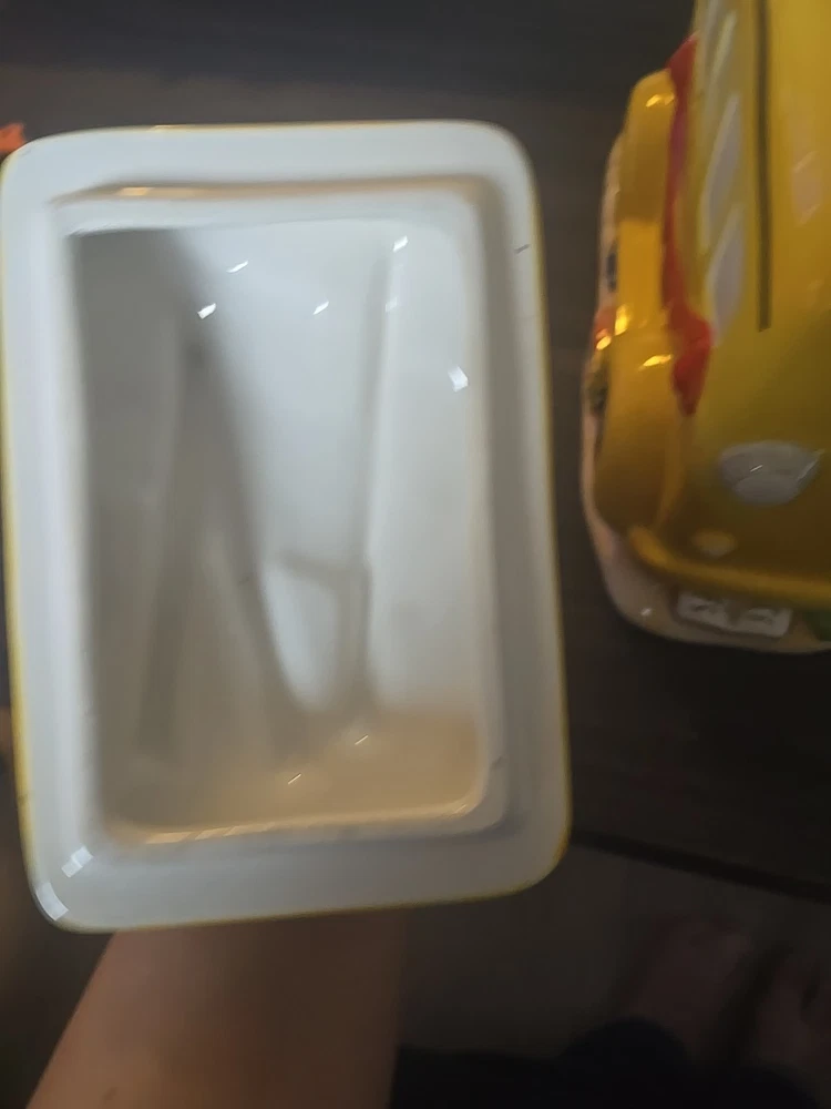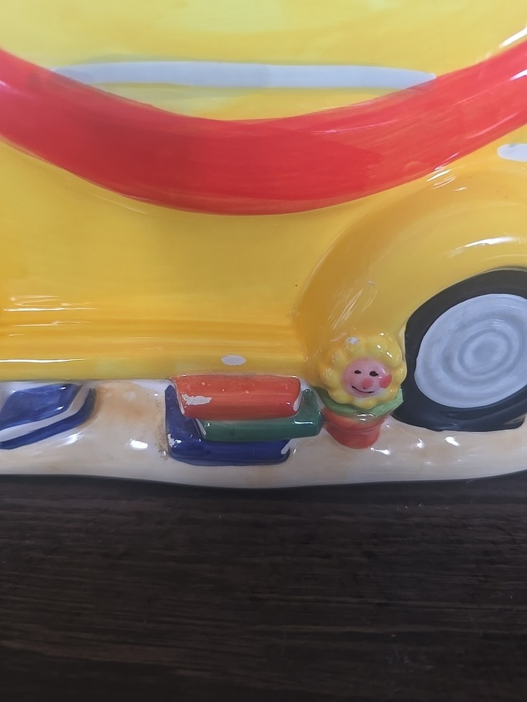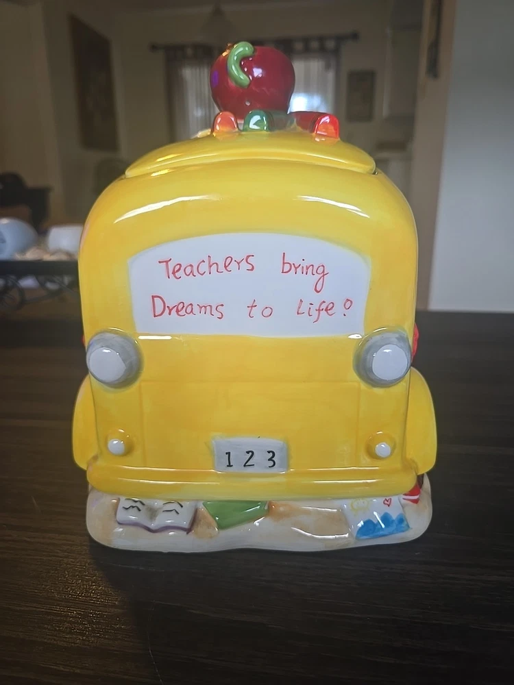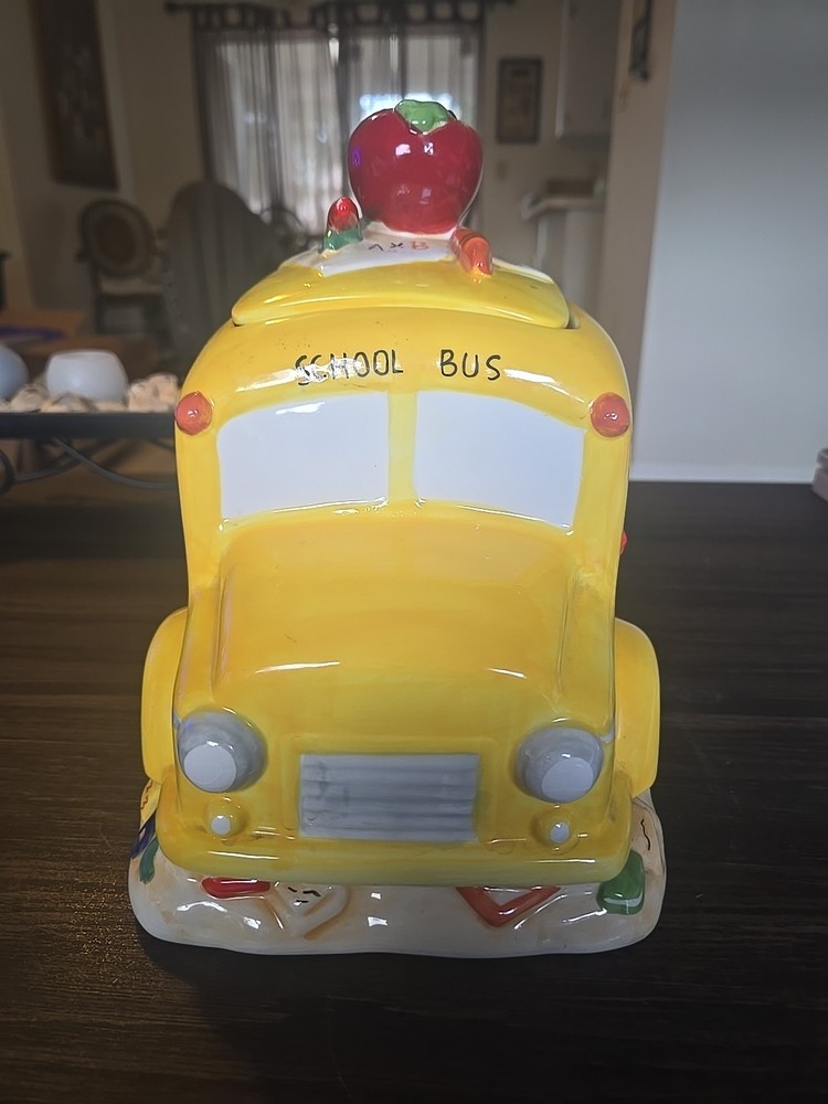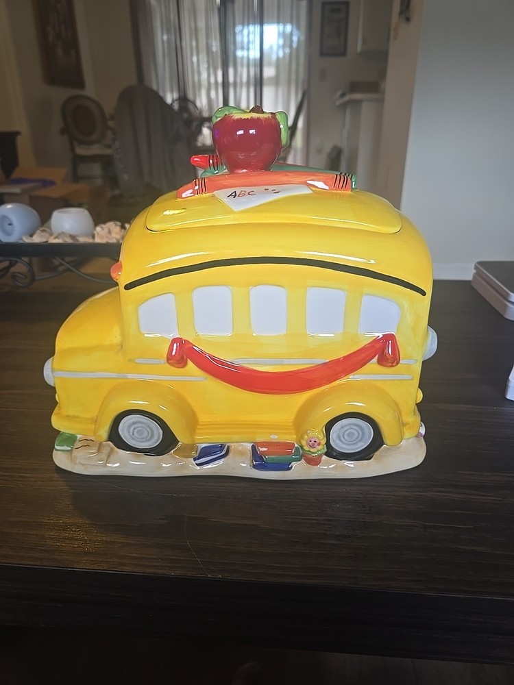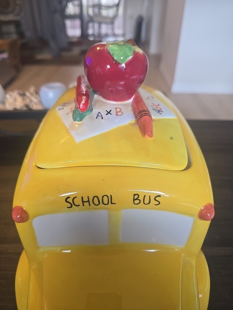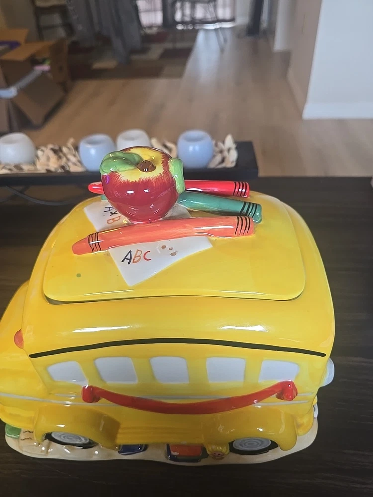 The Vintage School Bus Cookie Jar is a charming addition to any kitchen collection. Standing at 10" tall with a vibrant design featuring an apple handle and crayons, this ceramic and porcelain jar is perfect for storing your favorite cookies or candies. The retro style and original design make it a unique piece that will surely add character to your kitchen decor. This cookie jar comes with a lid for secure storage and is a free-standing item that can be easily displayed in any room of your home.