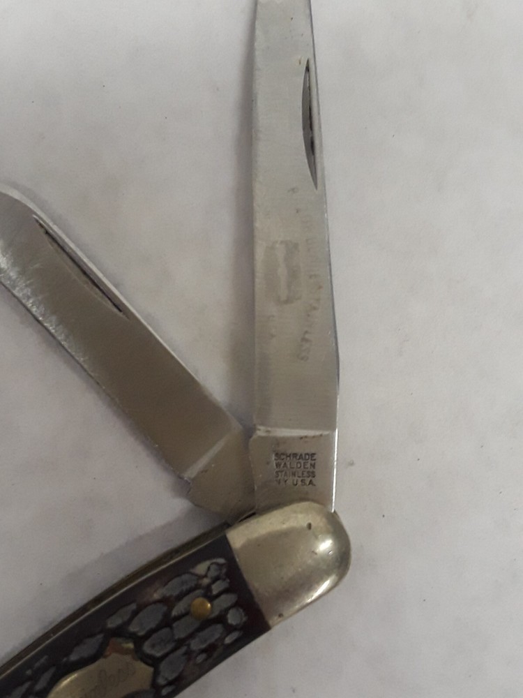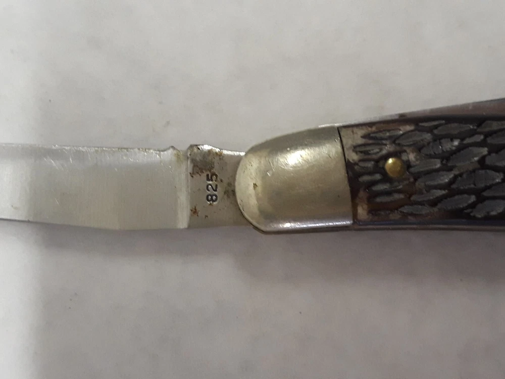 This vintage Schrade Walden NY USA Stockman Knife #825 features a clip point blade with a razor blade stainless etch. It has a blade range of 2.76 - 4 inches and a handle made of Delrin in a brown color. The knife is a pocketknife from the 1970s, with three blades that can be opened manually. It is an original Schrade model with an ambidextrous design, suitable for collectors of modern folding knives.