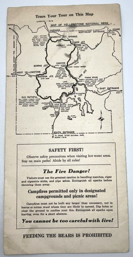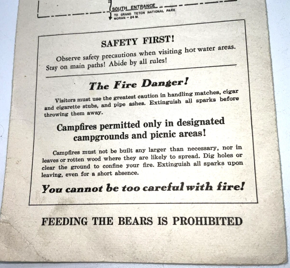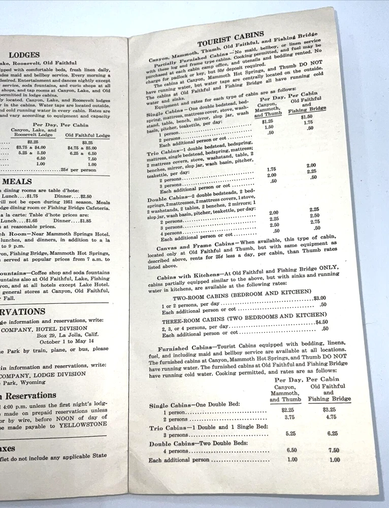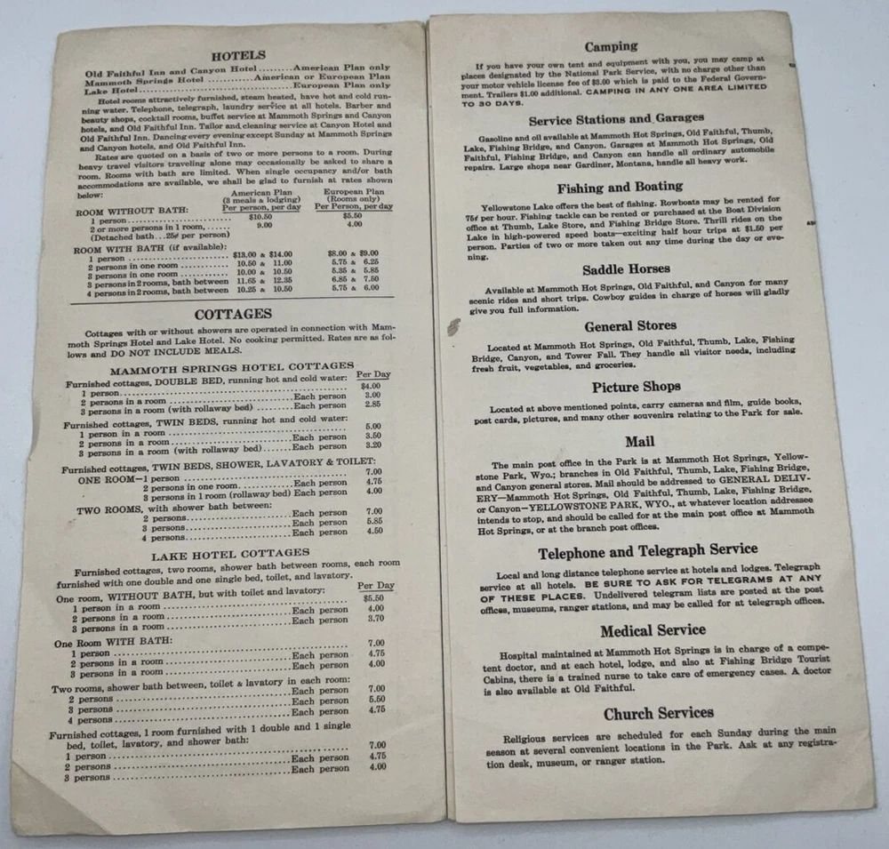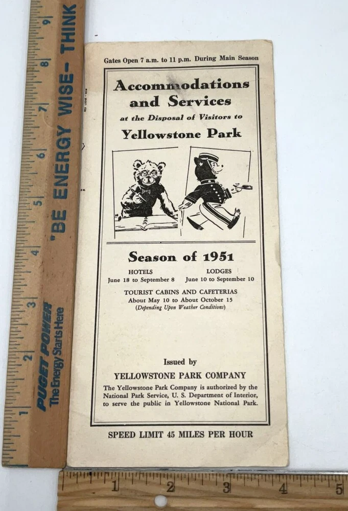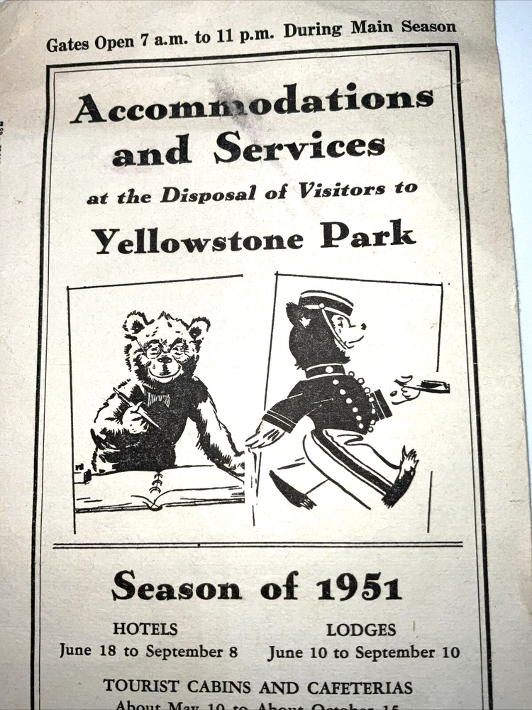 Vintage Season of 1951 Yellowstone Park Accommodations & Services Cabins, horses, fishing, hunting, service stations and garages. Mammoth Springs Hotel and Lake Hotel Cottages "Feeding the bears is prohibited." See all pictures as they are part of the description. We ship worldwide and combine shipping. If you have any questions regarding this item, please feel free to ask! Returns: Our goal is for you to be 100% satisfied with your purchase and we hope to receive your positive feedback! We follow Ebay's return policies so if for any reason you are not pleased, return the item within 30 days in the same condition as you received it for a full refund after we receive it. Thanks for your business, hope to deal with you again. Visit my store for interesting, unique, hard-to-find and vintage items and collectables at OlyVintage Collectibles | eBay Stores .