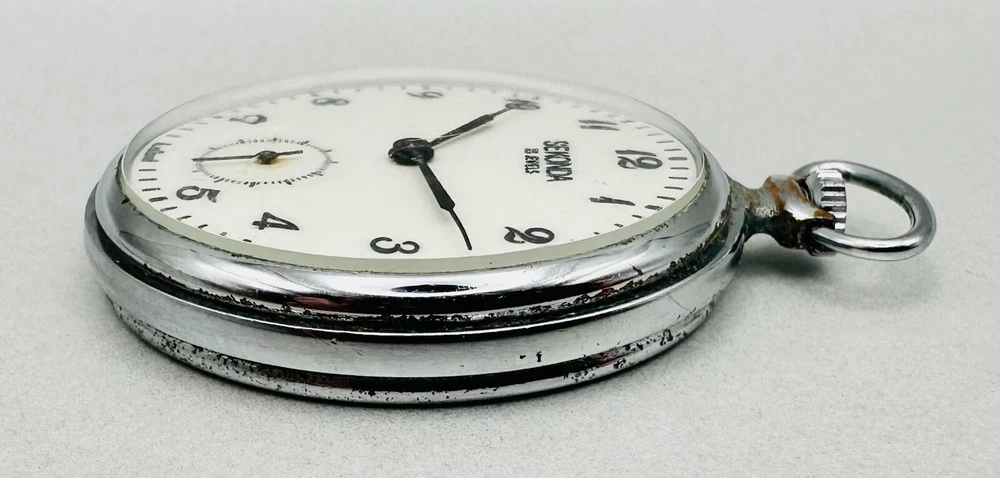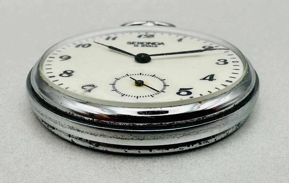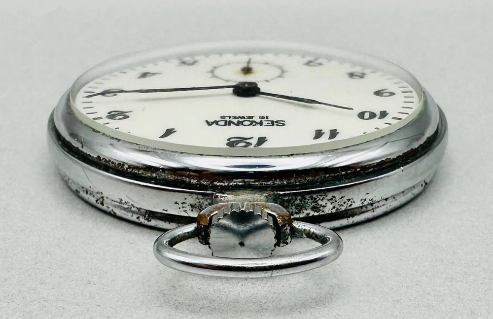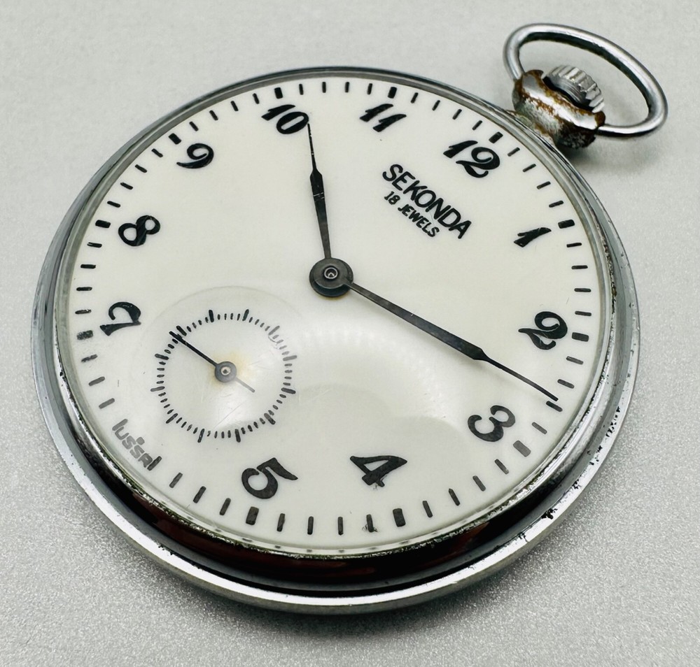 Vintage Sekonda 18 Jewels Pocket Watch – USSR Made – Working – 3602 Movement Description: A classic vintage Sekonda 18 Jewels pocket watch, made in the USSR and powered by the 3602 movement . This timepiece has been tested and winds, ticks, and keeps good time over 24 hours . A fantastic addition to any collection, or perfect for daily use by a vintage watch enthusiast. Key Details: Brand: Sekonda Movement: 3602 (with serial number 379334) Jewel Count: 18 Jewels Country of Origin: USSR Dial: White with black numerals Case Material: Plated metal Condition: Good condition overall with some tarnishing to the plating on the case Performance: Winds and ticks along, kept good time over 24 hours Dimensions: Case Diameter: 44.8mm Condition: Fully working – winds and ticks along Good timekeeping over 24 hours Some tarnishing to the plating on the case Case and crown show wear from age and use Summary: This vintage Sekonda pocket watch is a great piece for collectors of Soviet-era timepieces or anyone looking for a stylish, functional pocket watch. It offers classic Soviet-era craftsmanship and is an interesting piece of horological history. As usual, this item will be packaged carefully and dispatched with tracking. International shipping is available upon request.