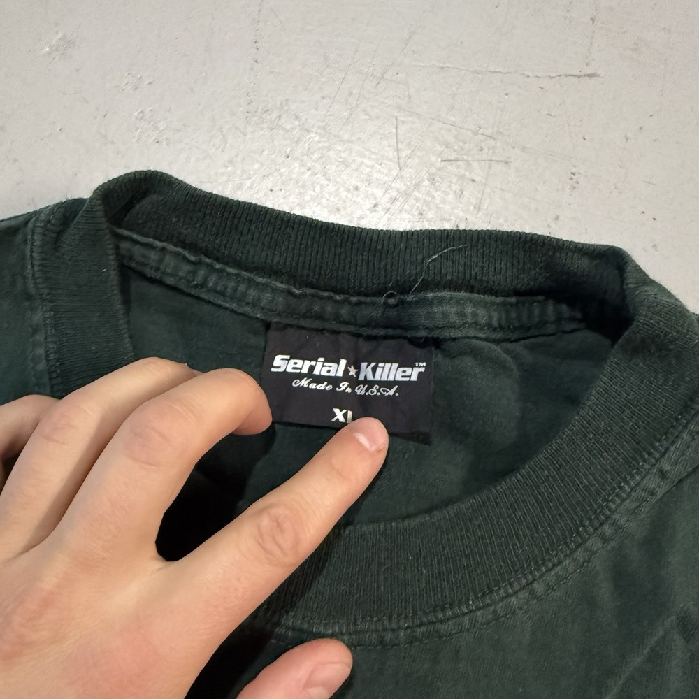 Year Manufactured:1990-1999Theme:USADepartment:MenHandmade:NoVintage:YesType:T-ShirtCountry of Origin:United StatesMaterial:CottonSleeve Length:Short SleeveNeckline:Crew NeckSize Type:RegularPattern:SolidColor:GreenSize:XLFabric Type:KnitBrand:Serial KillerPersonalize:NoFit:RegularGarment Care:Machine WashableSeason:Summer, Spring, Fall