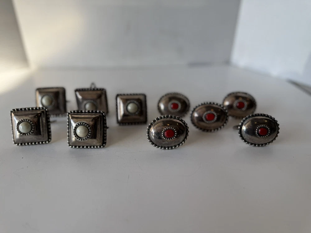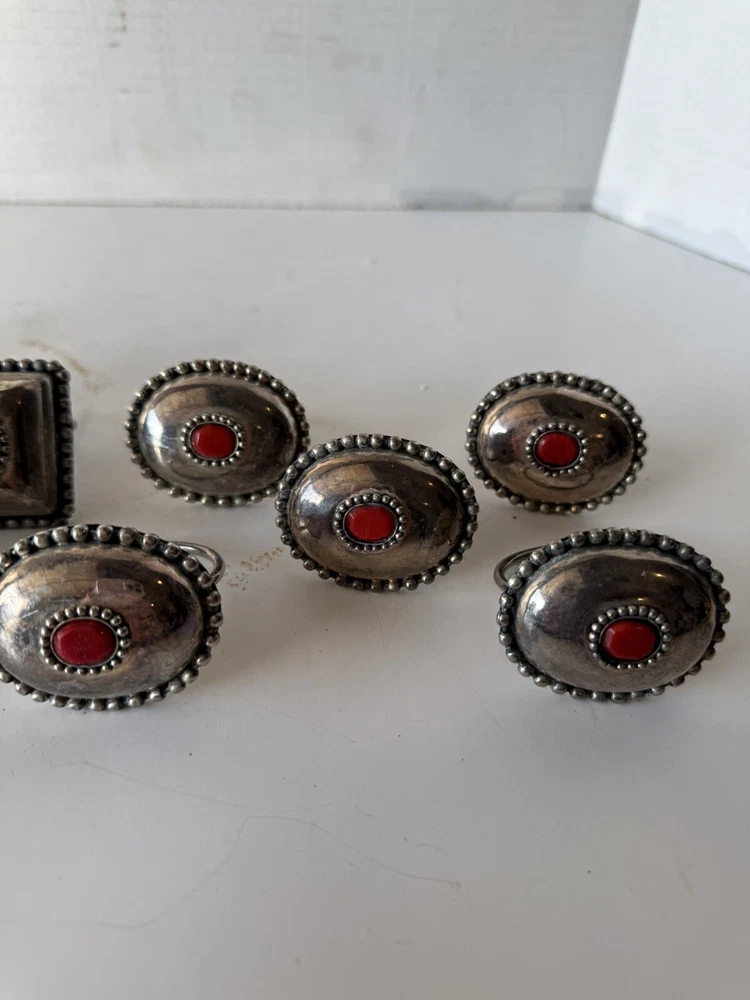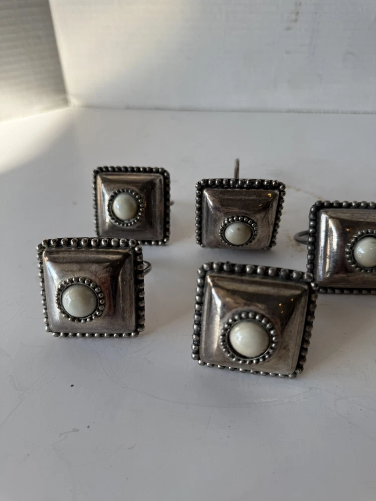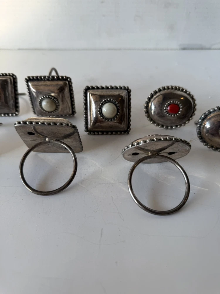 5 napkin rings are square and measure 1.5 x 1.5” 5 napkin rings are oval and measure 2 x 1.5”. All have beautiful stones in the middle.