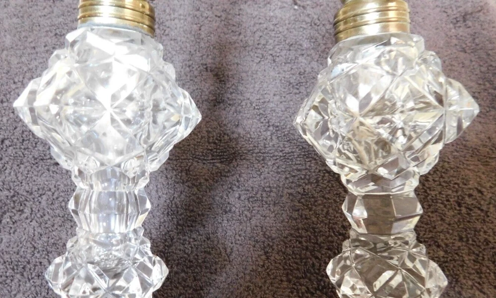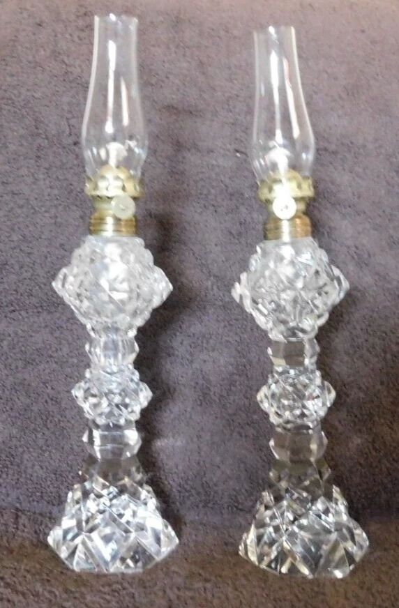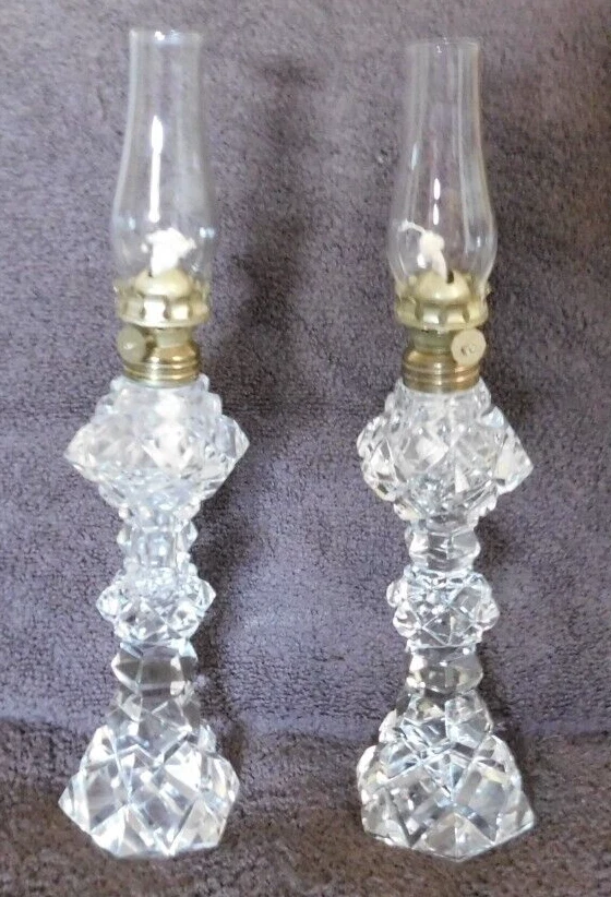 Vintage Set of 2 Exquisite Kerosene Oil Mantel Lamps All in great shape, very clean,no chips or cracks,believe to be from the 1930's. Cut glass could be crystal, wicks are new looks like they were never used. Mantel Lamps,They are very thin and bold looking. Bottoms are all solid. Great Collector's item. Great Art Decor., Found in UpState New York. Pieces are about 12 inches Tall; Thank you for Looking! Most of my items are antique or vintage ,all are found in UpState , New York, all are found in homes of senior's that ae downsizing or just moving on and can not take all the treasures they have collected over the years. Happy Shopping!