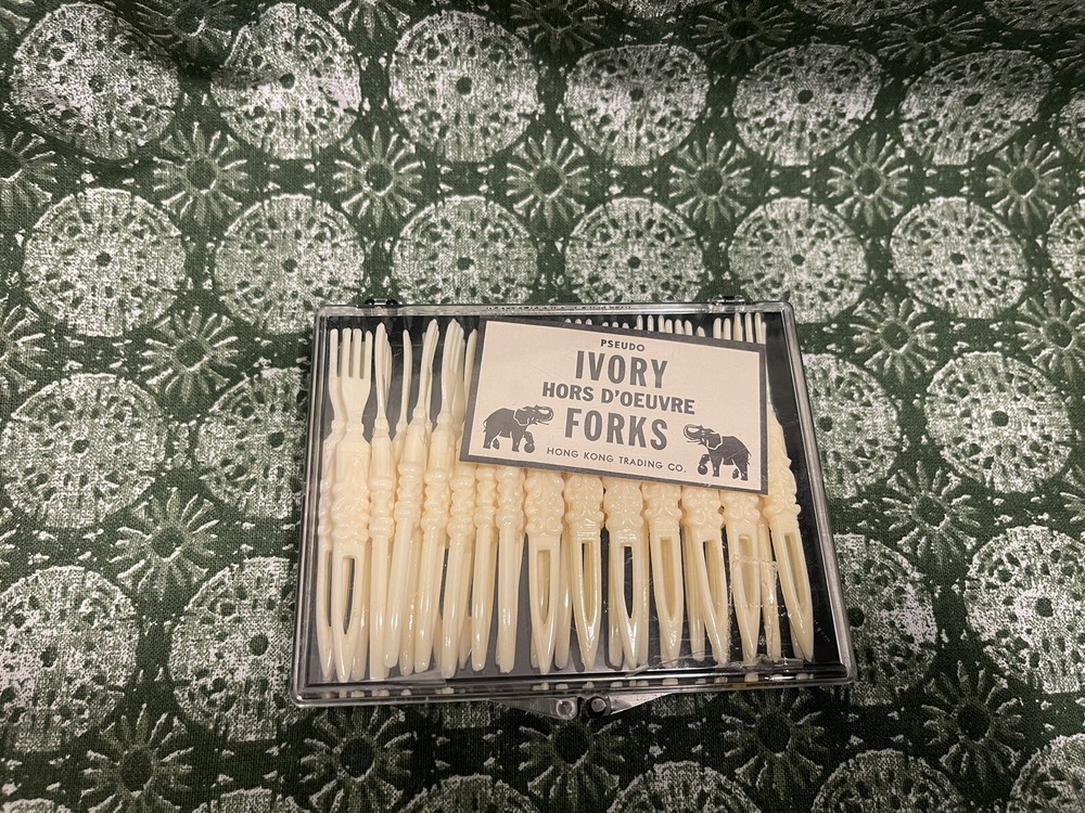 Add a touch of vintage charm to your next party with this lot of three Pseudo non-tarnishable ivory forks. Made in Hong Kong, these plastic forks are perfect for serving appetizers and other finger foods. The forks feature a classic design that is sure to impress your guests and add a sophisticated touch to your table decor. Whether you're hosting a formal dinner or a casual get-together, these forks are a must-have for any occasion. The forks are in excellent condition and are free from any signs of wear or damage. They are perfect for collectors or anyone who loves vintage party supplies. Don't miss out on the chance to add these beautiful forks to your collection and make your next party extra special.