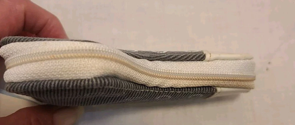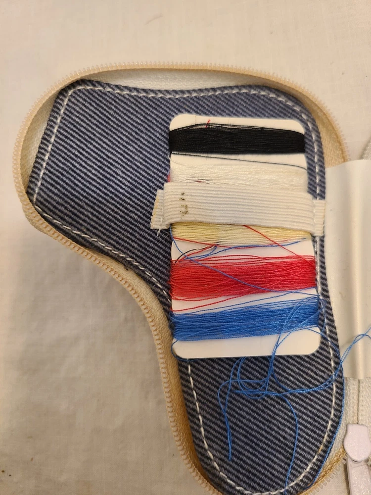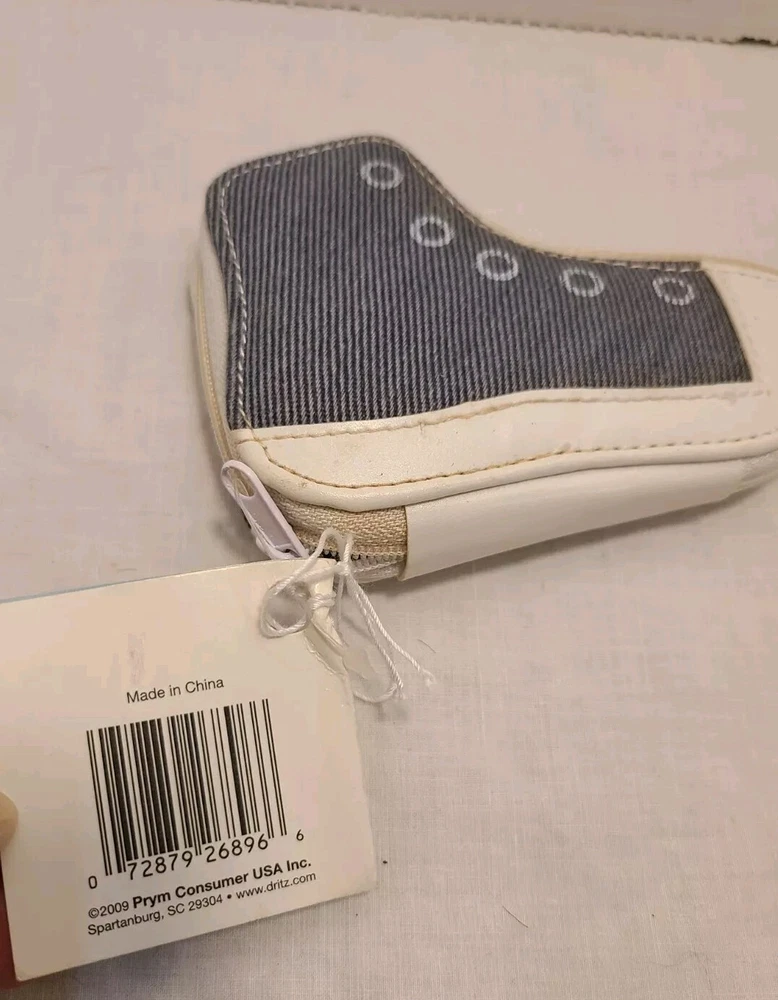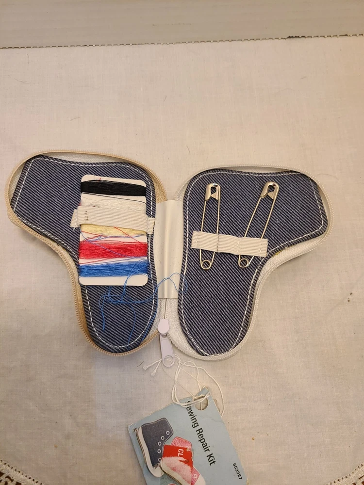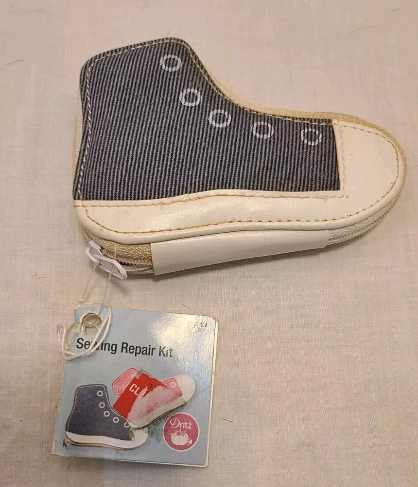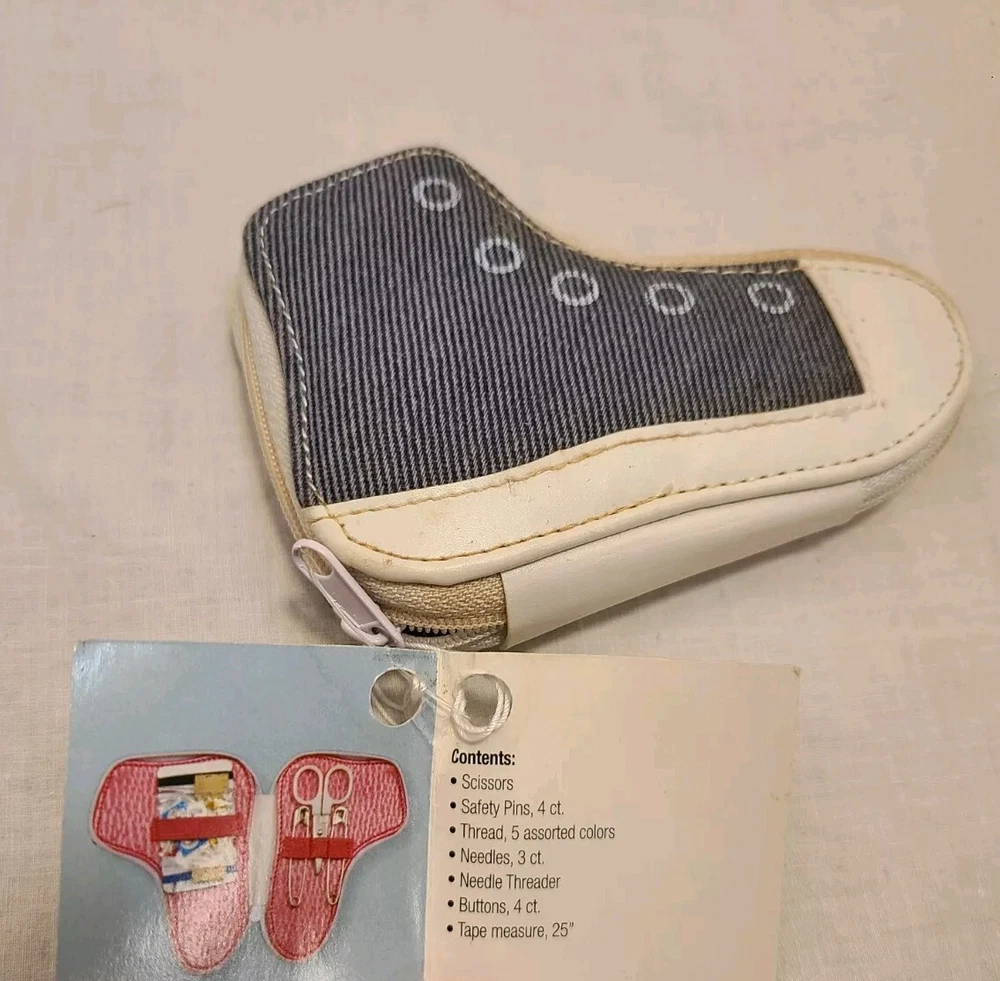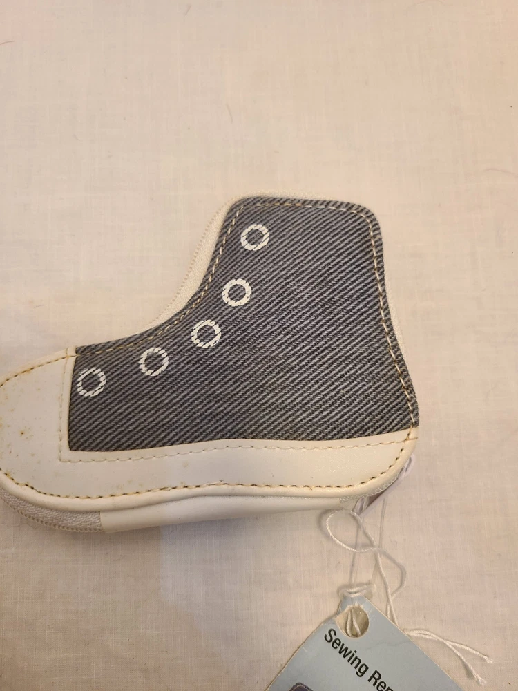This vintage sewing repair kit features a grey tennis shoe design with a zip-around closure. The kit includes tags and is an original piece. The country/region of manufacture is unknown. Perfect for collectors or those who enjoy vintage sewing kits.