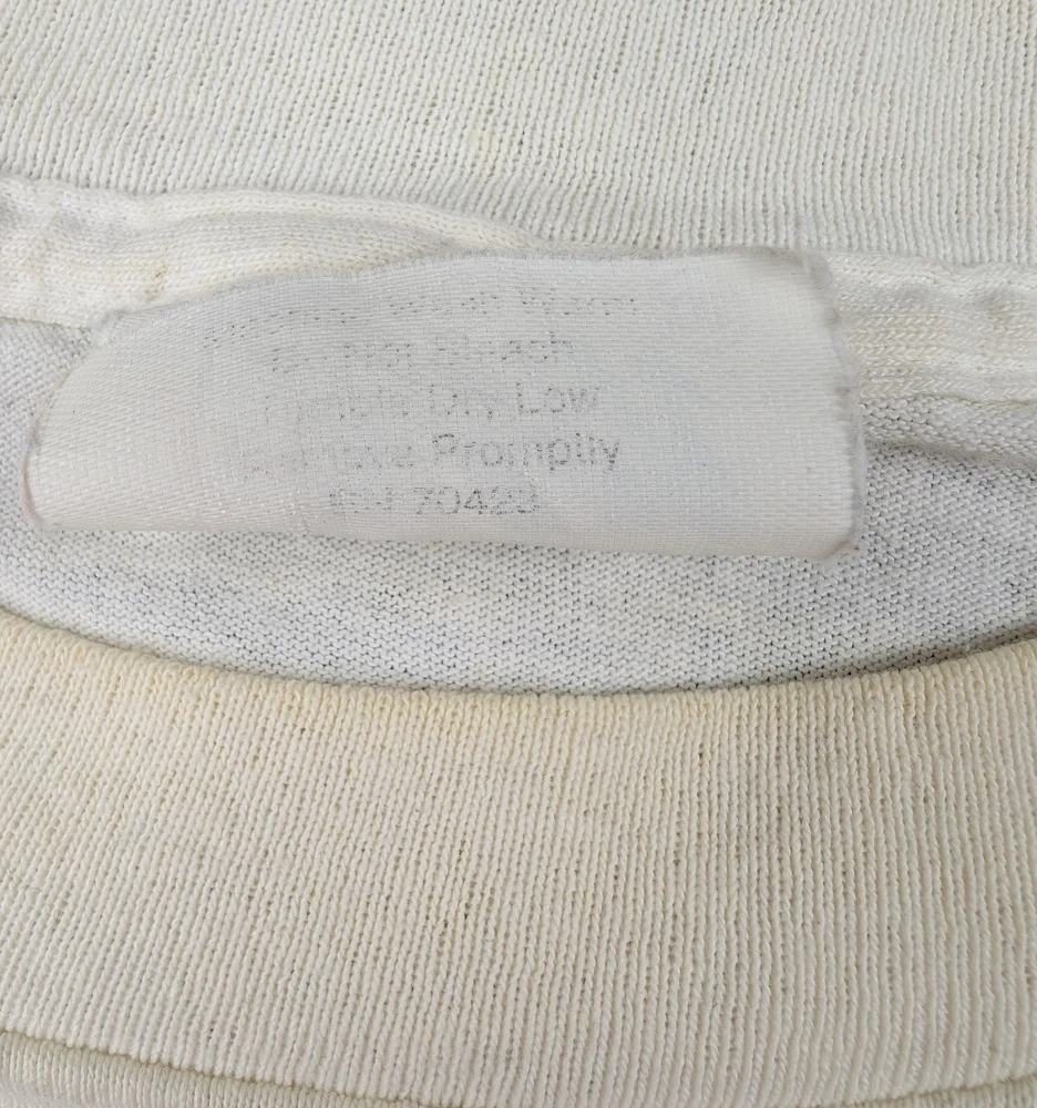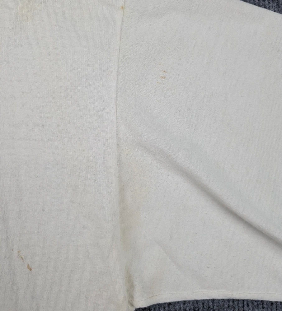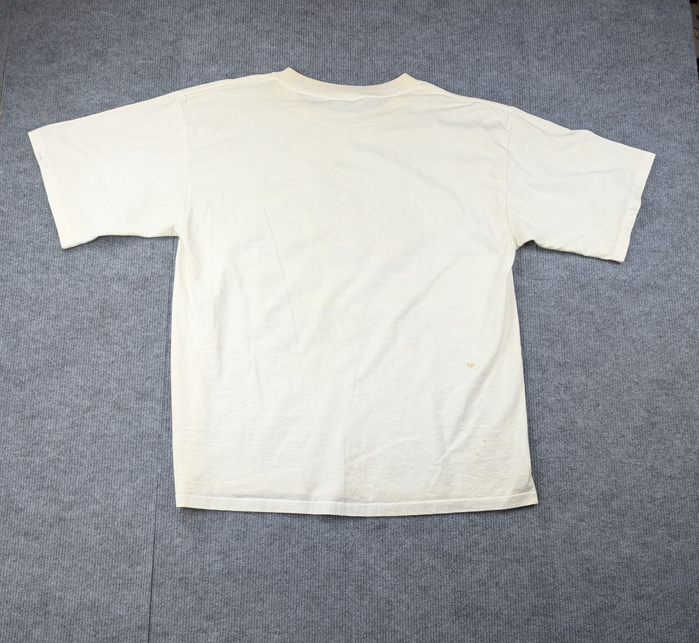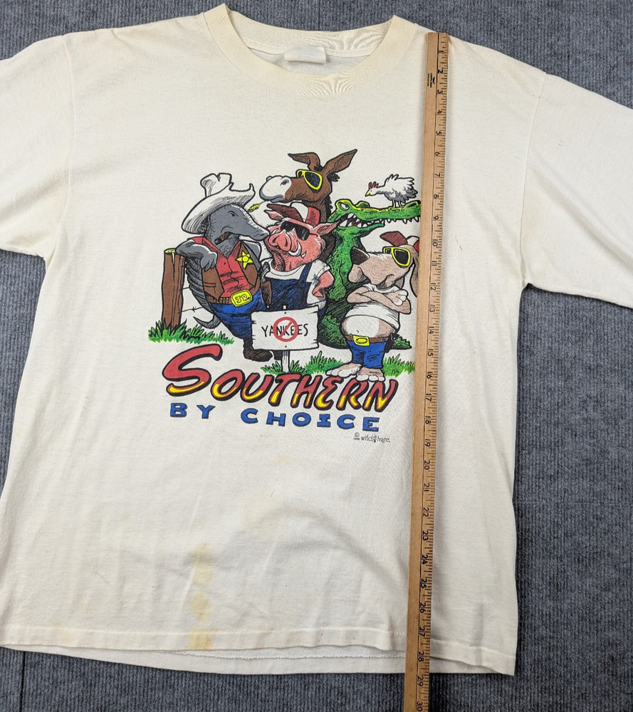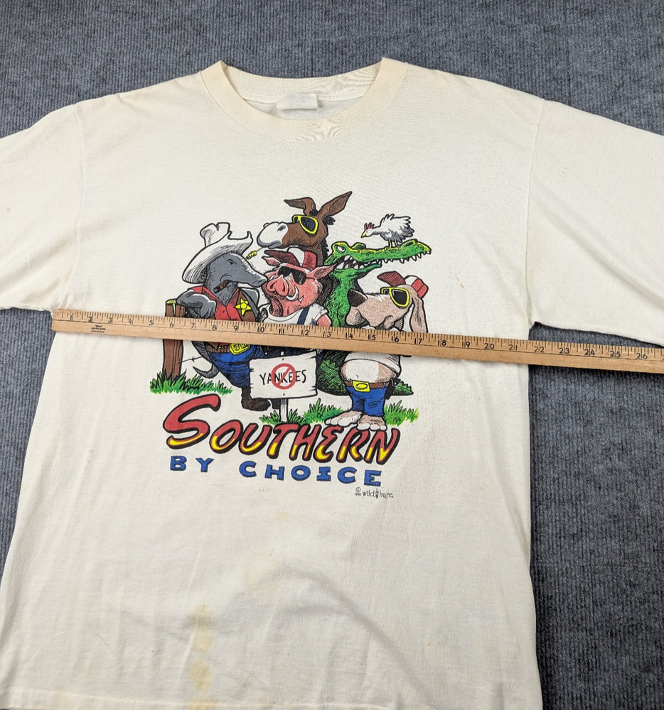 Department: Men Type: T-Shirt Style: Graphic Tee Size: Large Color: Cream / Off White Fit: Regular Neckline: Crew Neck Sleeve Length: Short Sleeve Material: Cotton (tag worn, feels cotton) Fabric Type: Knit Pattern: Graphic Print Theme: Southern, Vintage, Cartoon, Humor Vintage: Yes Country/Region of Manufacture: USA (graphic appears vintage; tag worn) Condition: Pre-owned