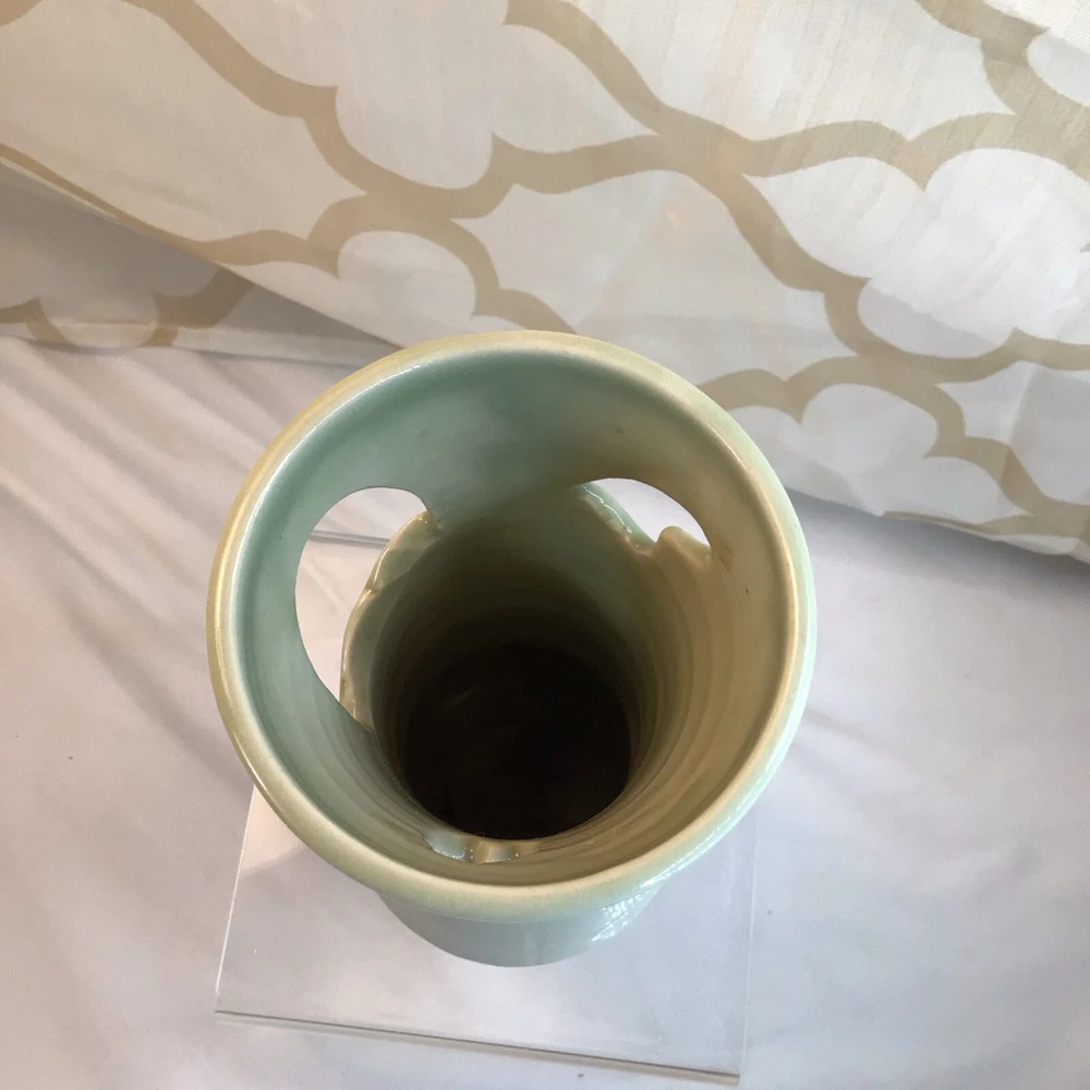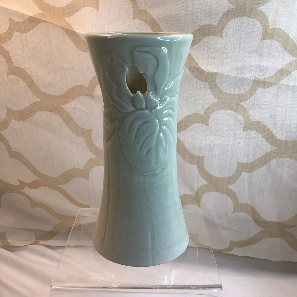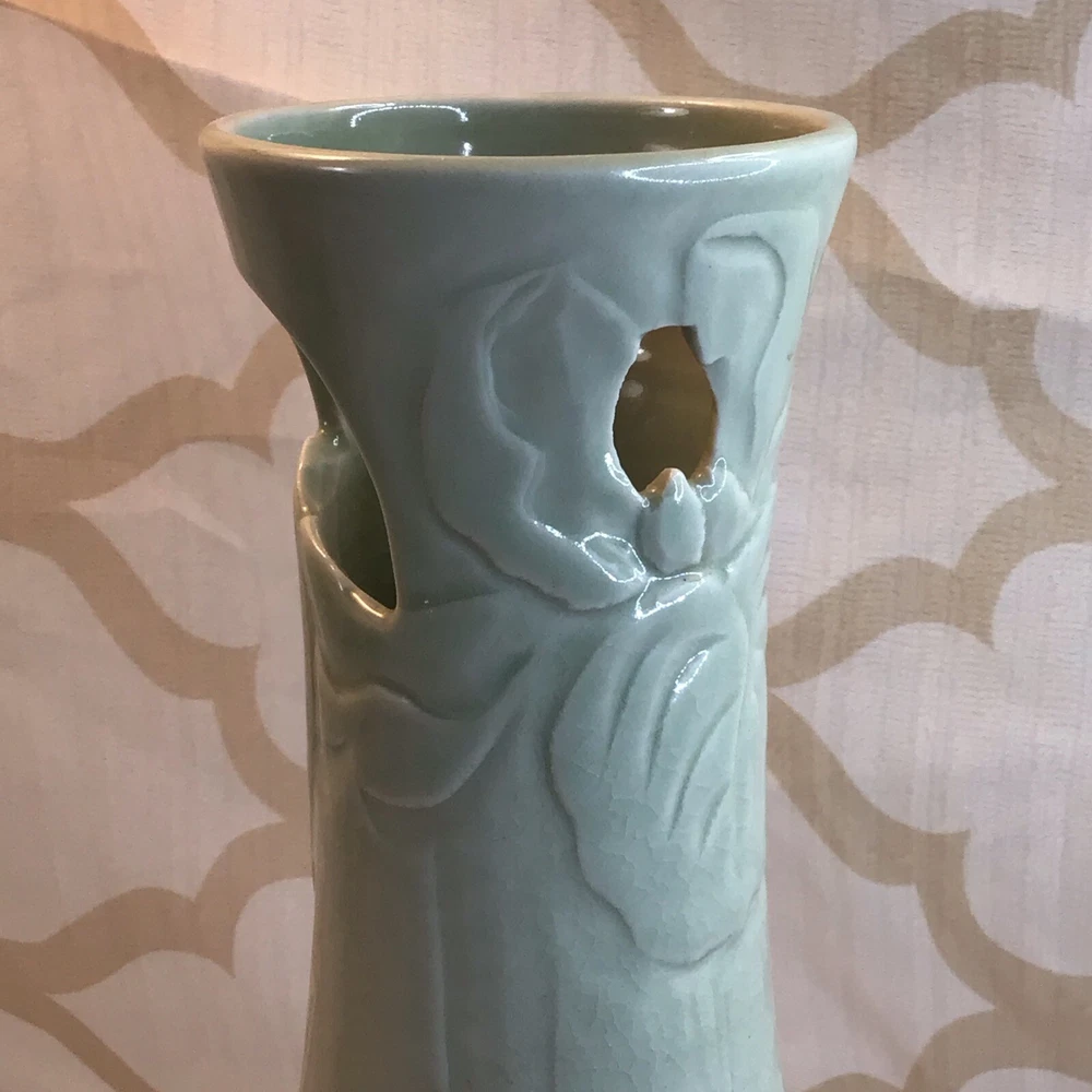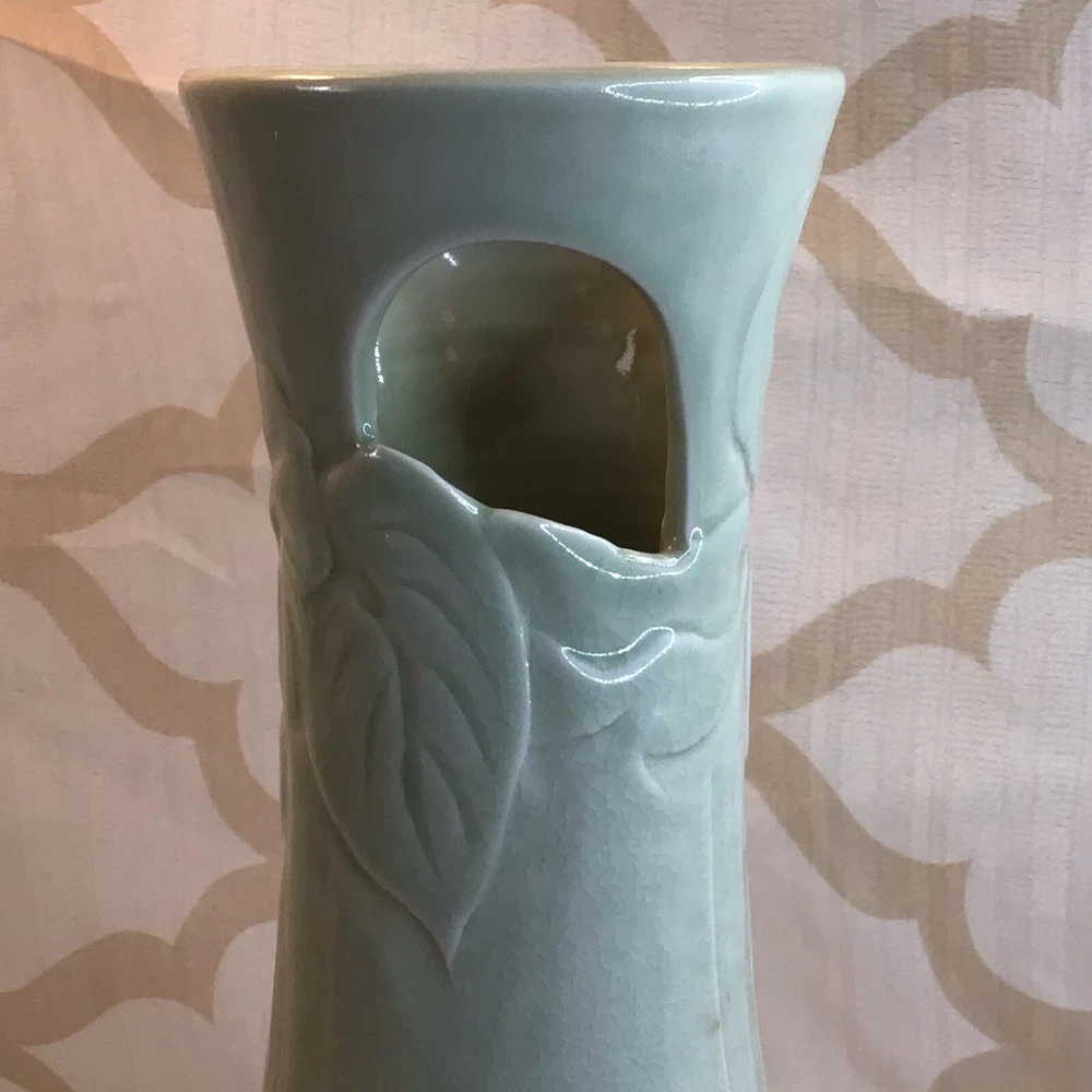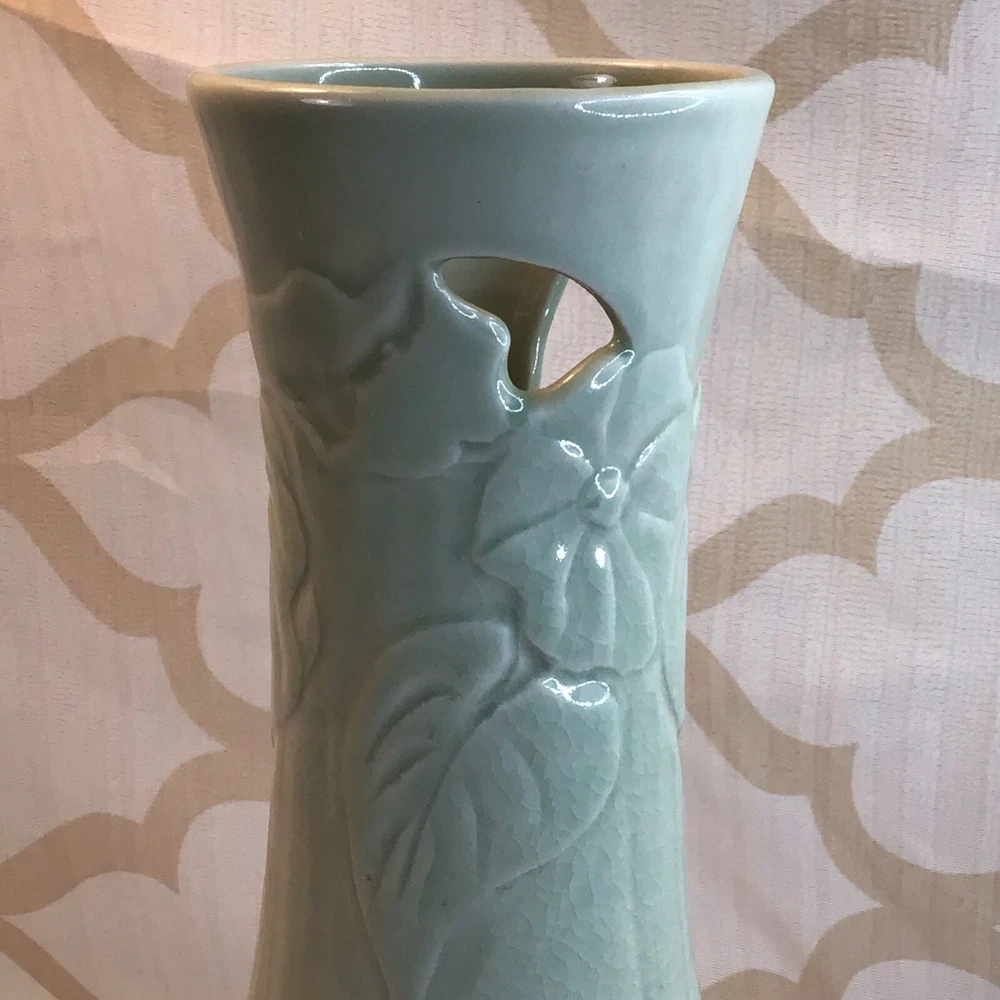 This vintage ceramic vase stands at 7 inches tall and features a green glazed finish with textured carvings. Handmade in 1985, this vase showcases a flower subject and bears a signature. Its medium size makes it suitable for various occasions and its 1980s style adds a touch of retro charm to any space. Perfect for collectors of unique decorative pieces, this original vase from the late 20th century exudes a timeless appeal with its intricate details and craftsmanship. Made in 1985, unable to decipher the signature. Has a beautiful green crackle finish with cut outs. No chips or cracks. Please look at the pictures closely, as this is the item that you will receive.