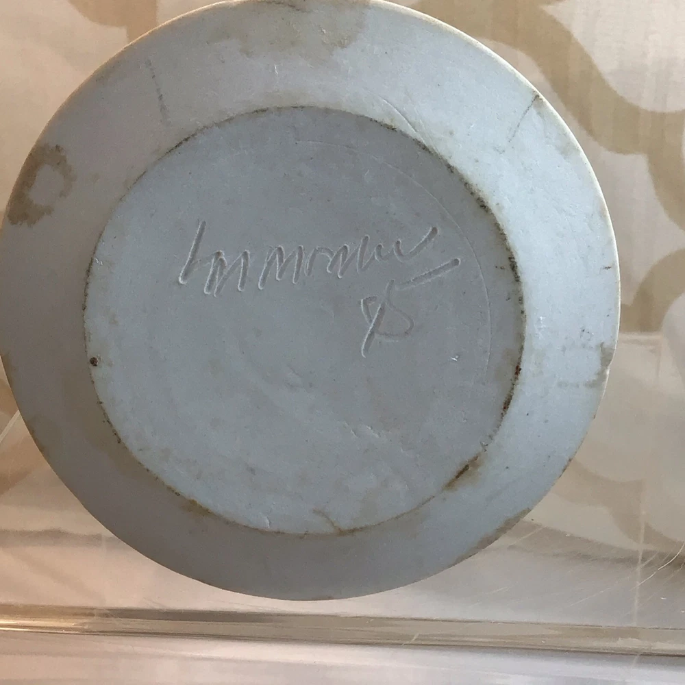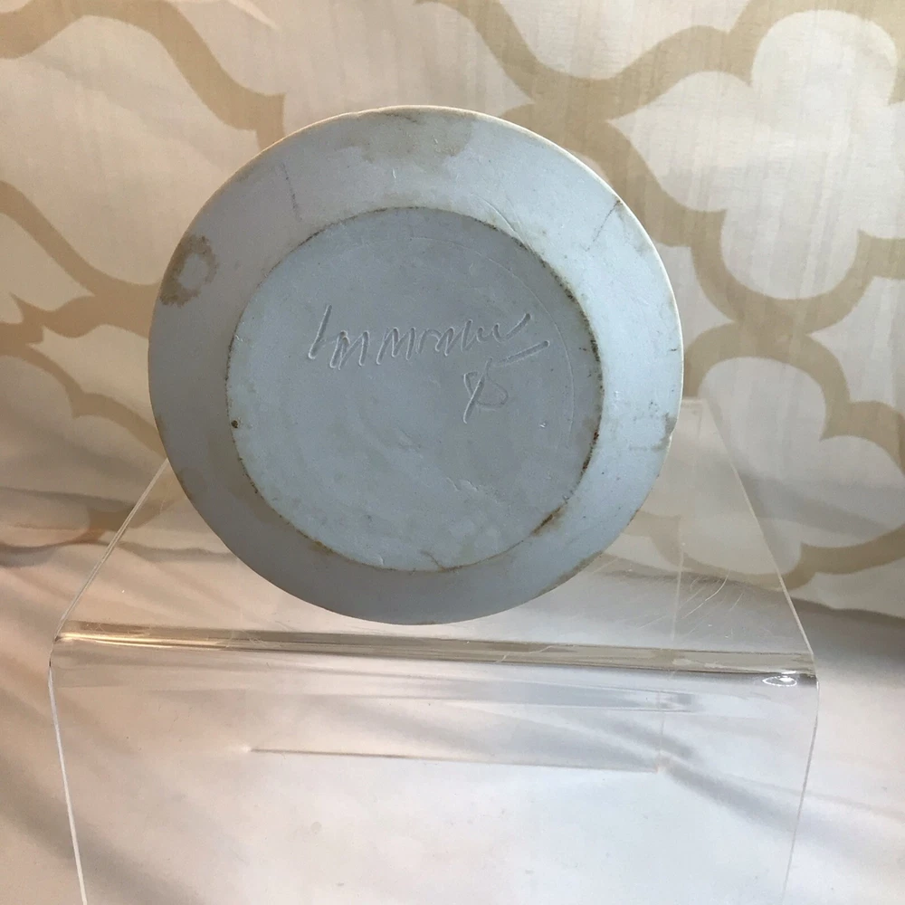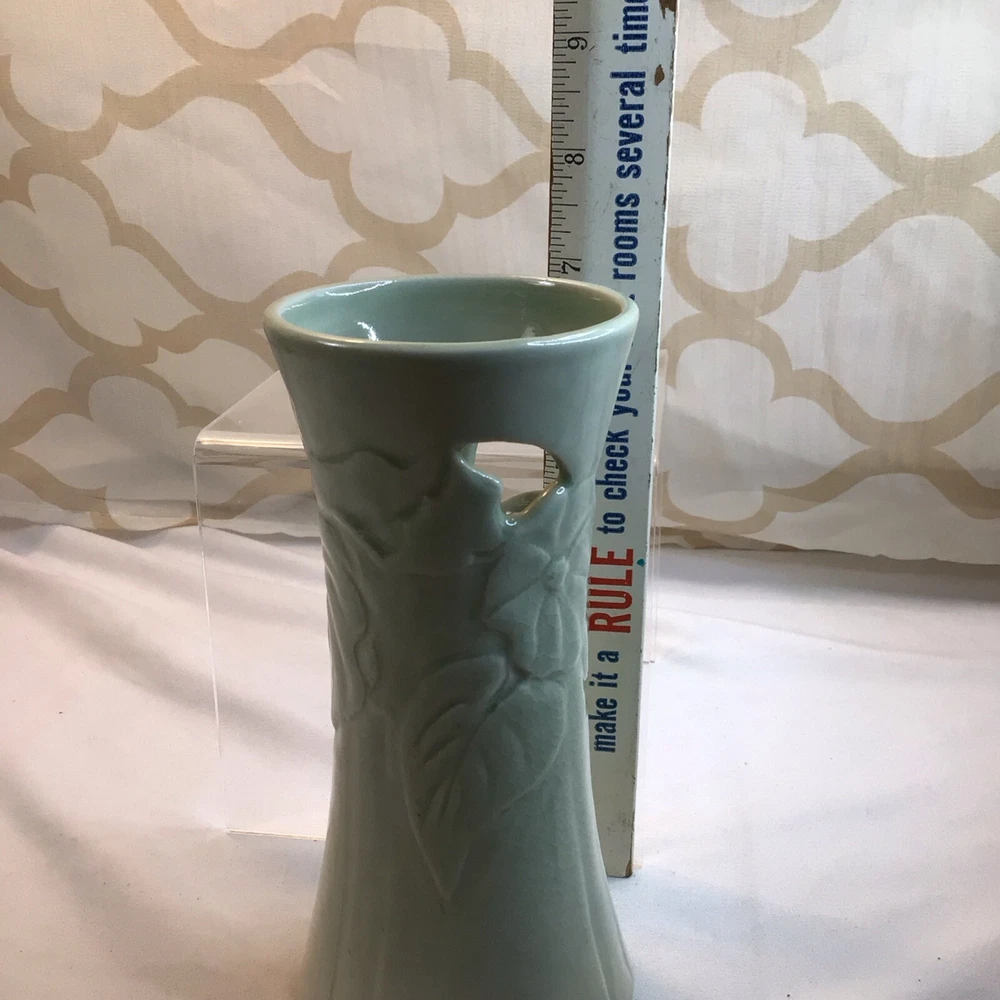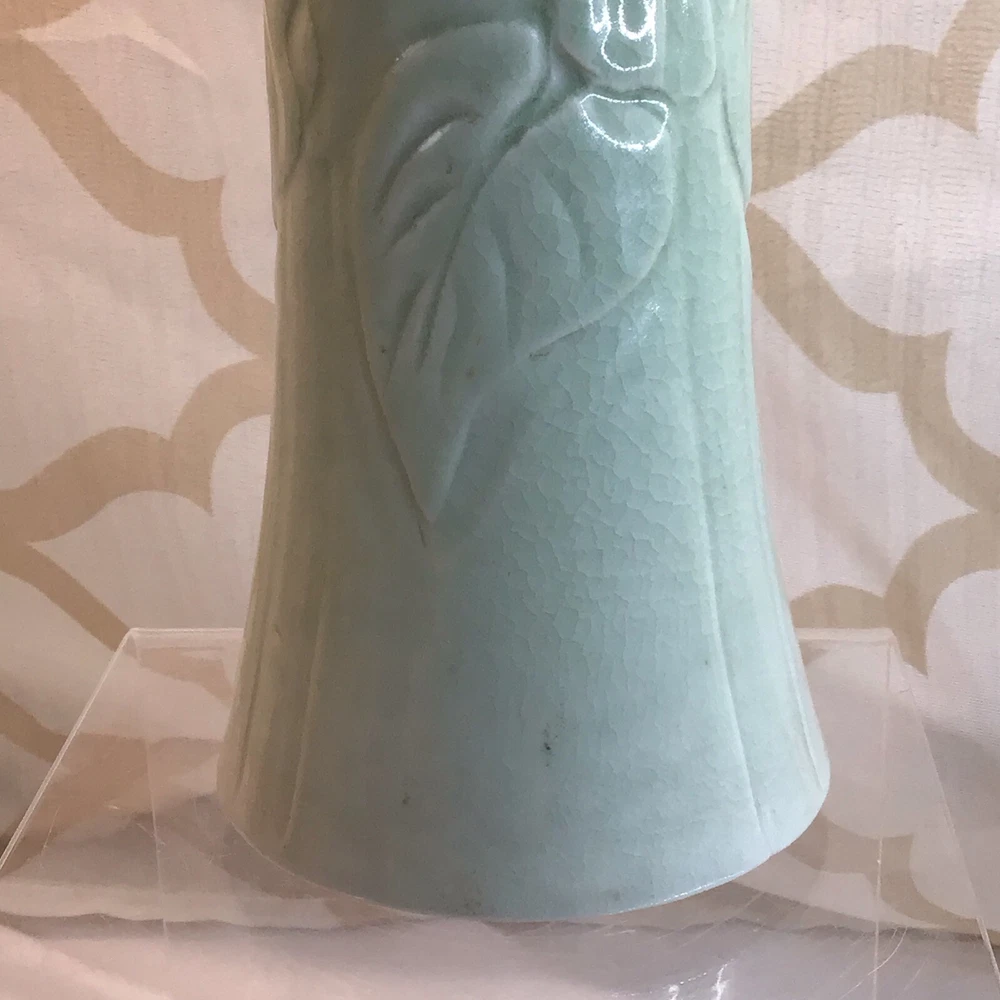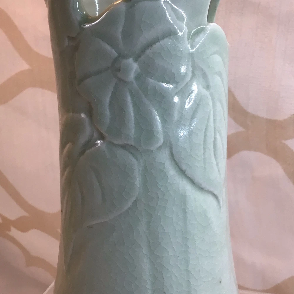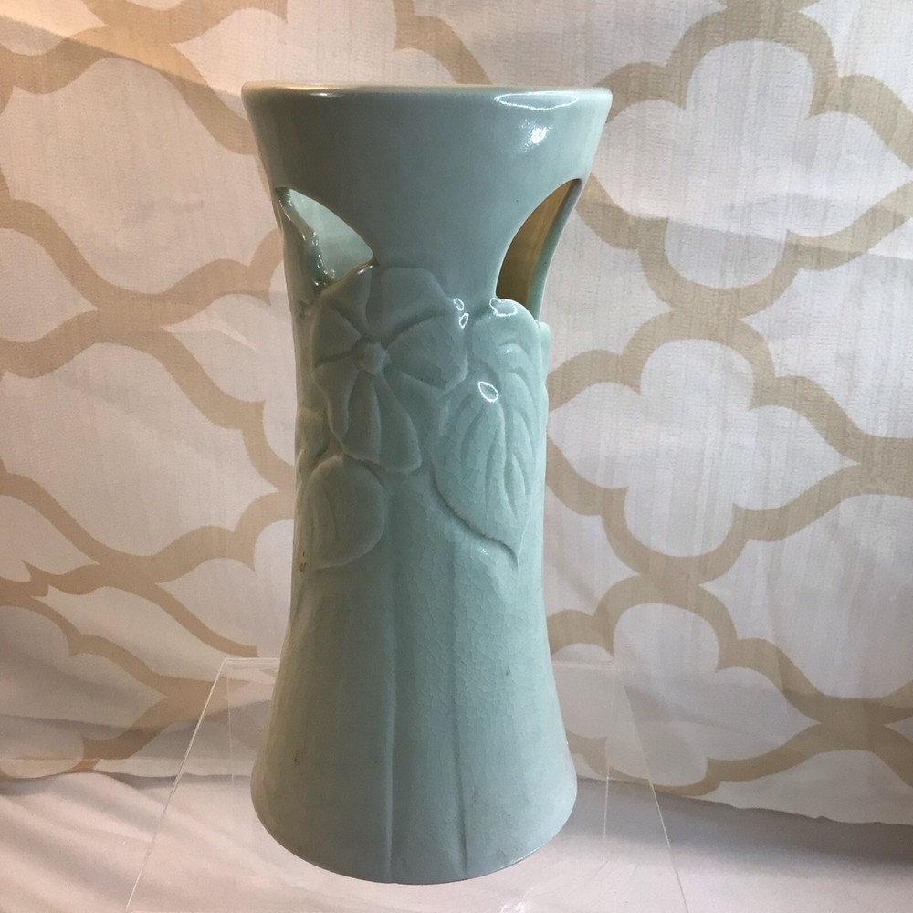 This vintage ceramic vase stands at 7 inches tall and features a green glazed finish with textured carvings. Handmade in 1985, this vase showcases a flower subject and bears a signature. Its medium size makes it suitable for various occasions and its 1980s style adds a touch of retro charm to any space. Perfect for collectors of unique decorative pieces, this original vase from the late 20th century exudes a timeless appeal with its intricate details and craftsmanship. Made in 1985, unable to decipher the signature. Has a beautiful green crackle finish with cut outs. No chips or cracks. Please look at the pictures closely, as this is the item that you will receive.