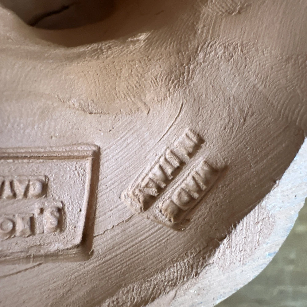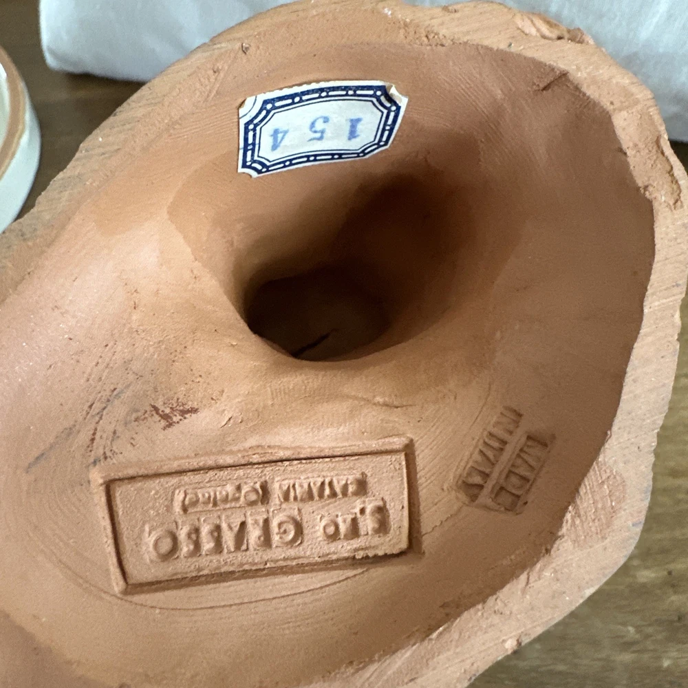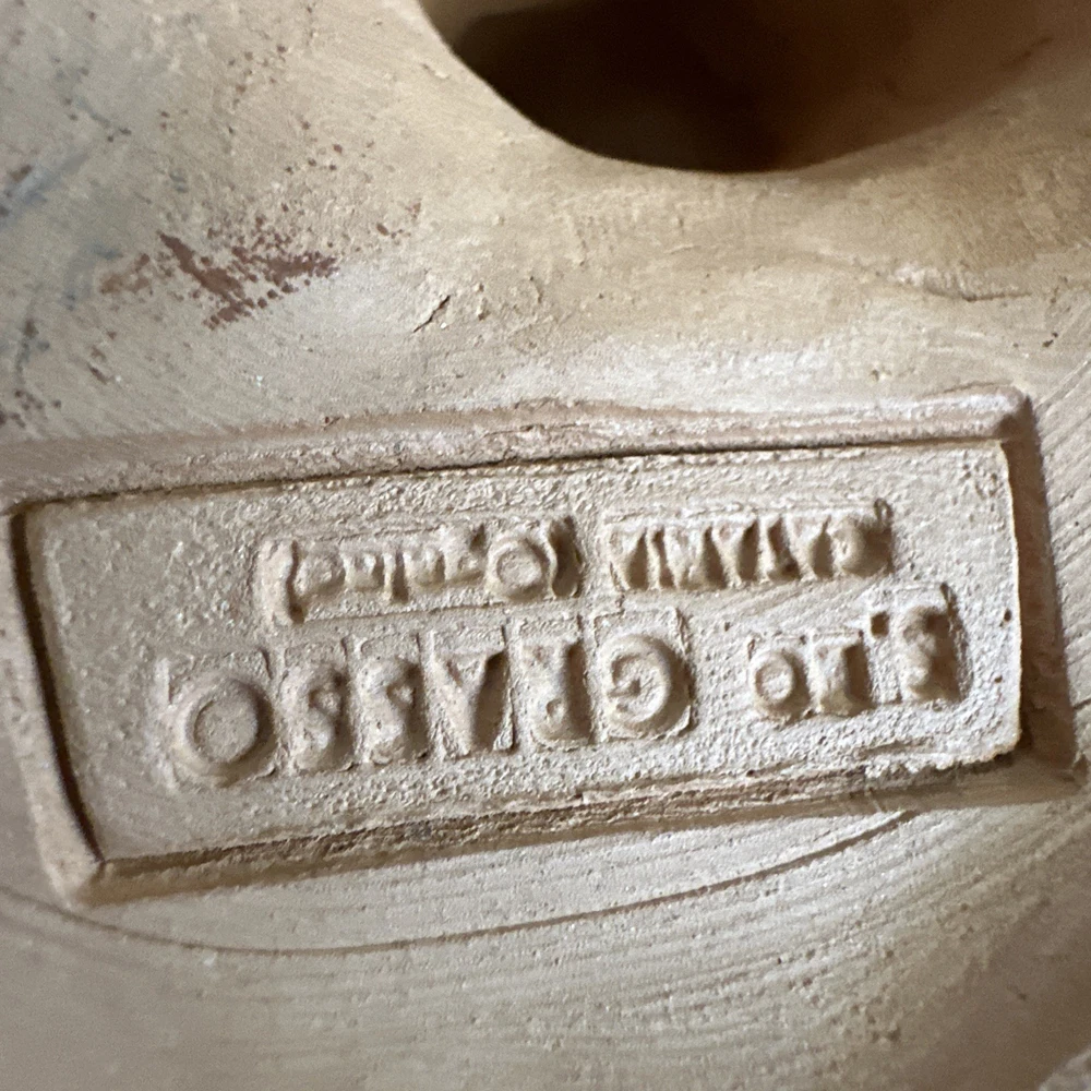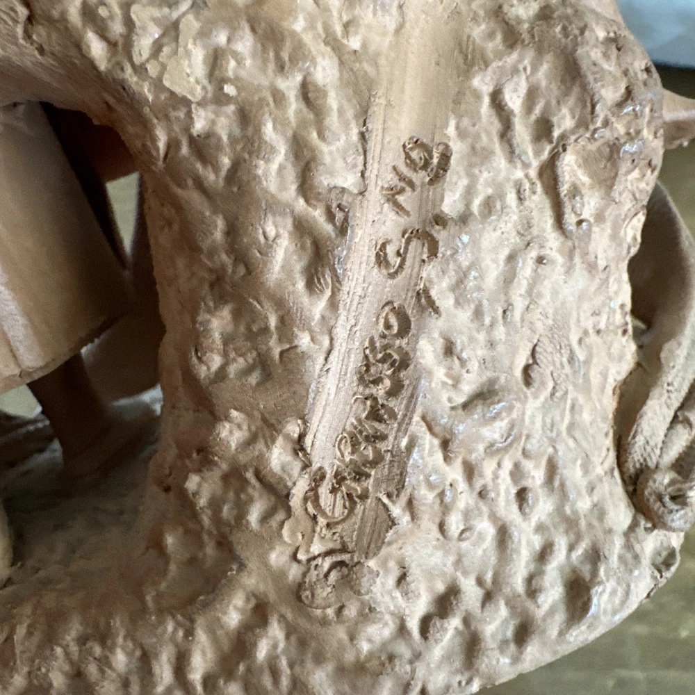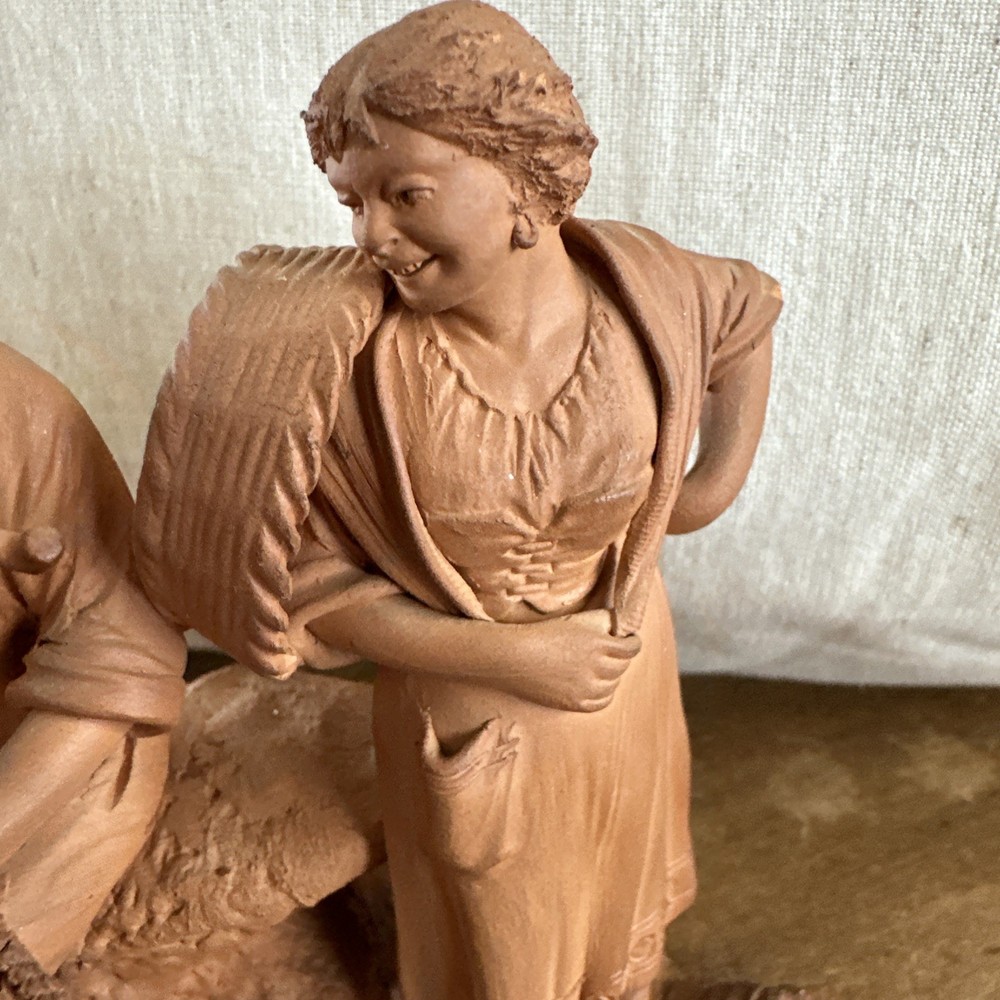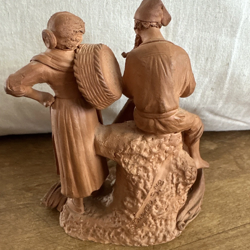 This vintage signed Grasso redware terracotta pottery sculpture depicts a fisherman and woman, showcasing a unique blend of Italian and abstract themes. Handcrafted in Bohemia, Italy in the 1970s, this art pottery piece is made of clay and terracotta, with a beautiful brown color that adds to its rustic charm. The production technique used for this one-of-a-kind sculpture is traditional pottery, making it a standout decorative piece for any art lover's collection. “Pipe has a little damage to it.”