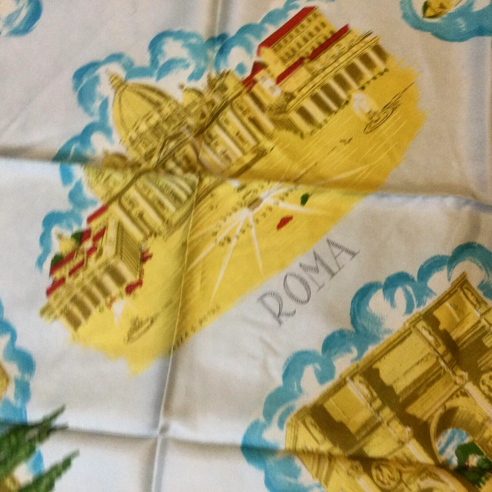 Vintage Silk Square Scarf Architecture Roma Italy Light Blue Yellow 30x30. Hand stitched edges. Very good condition, no damage, no stains . Never used. InvN/ES/4
