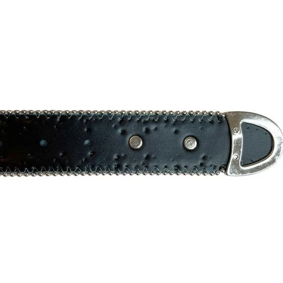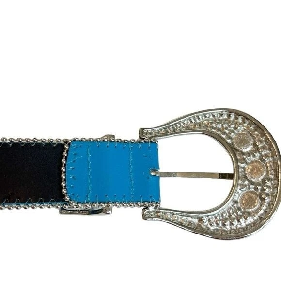 Silver End Heavy blinged silver buckle Two rows of silver studs Leather Belt Rhinestone - Size Belt length 38 with 4 holes Buckle 3" - Color Blue Clear Silver - Pre-owned condition. Some minor wear at the belt holes - Smoke and pet free home * I accept reasonable offers. * Same or next day shipping. * New items posted daily. * All used items are cleaned, washed, and/or thoroughly steamed before listing. * Bundle discounts in closet Thank you for your consideration.