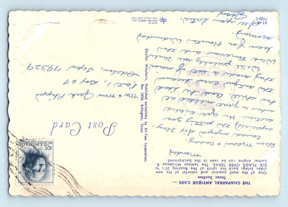 Vintage Six Flags Texas Chaparral Antique Cars Postcard Mirabeau Lamar Engine