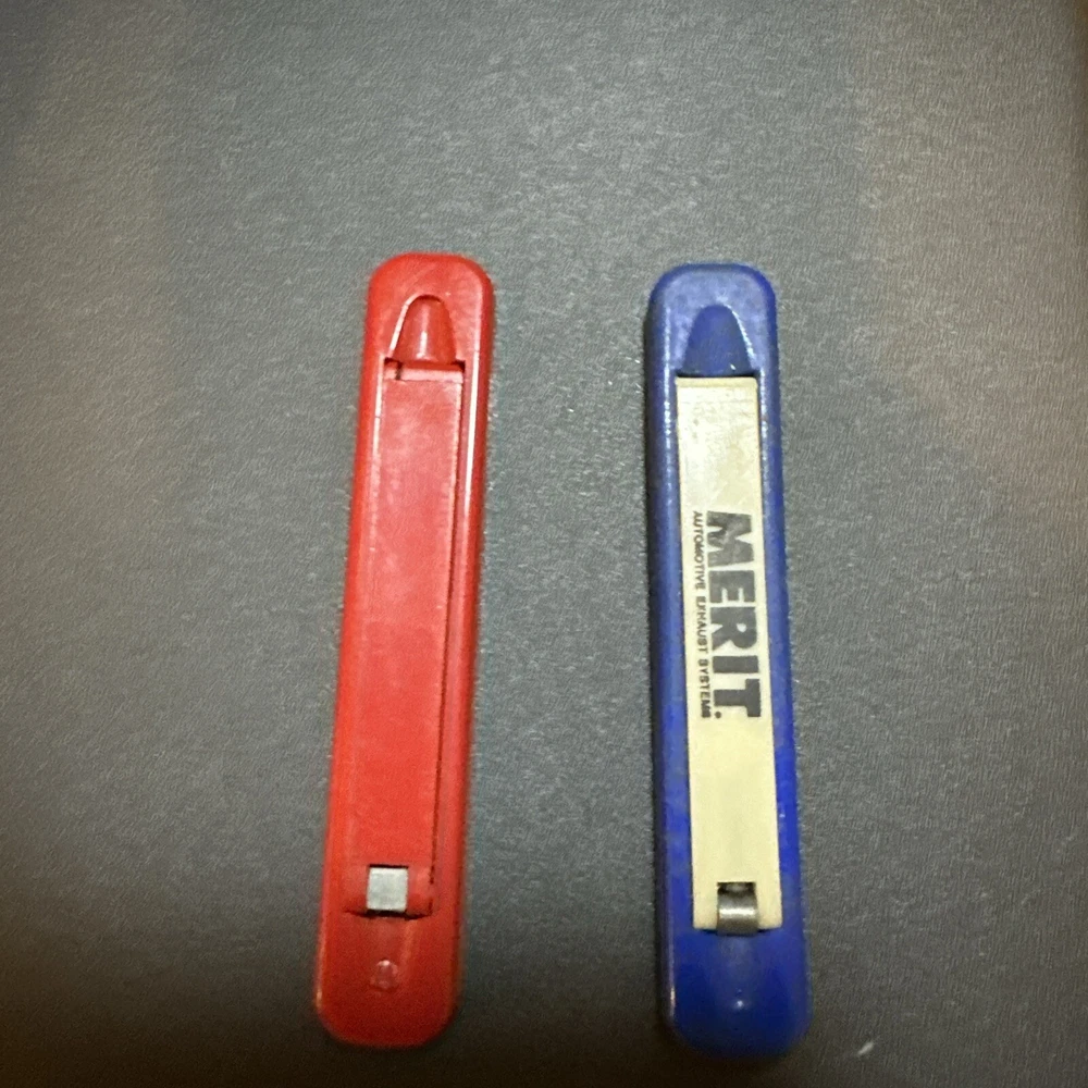 This vintage set of slide out advertising knives is a must-have for any collector. The knives feature a manual opening mechanism and have a plain edge blade. One knife is colored red and the other is blue, both are original and were manufactured in the United States. The knives are of the pocketknife type and have one blade each. They are a classic model and are perfect for any collector.