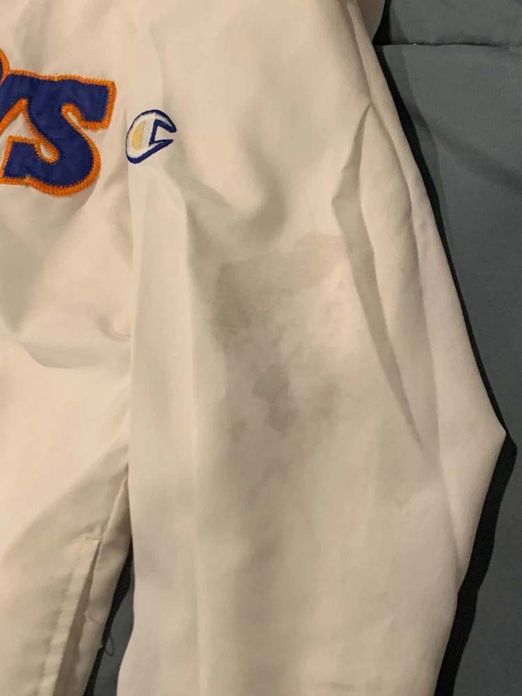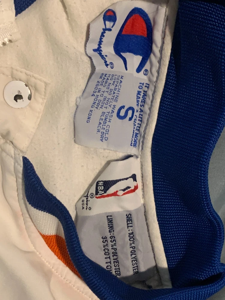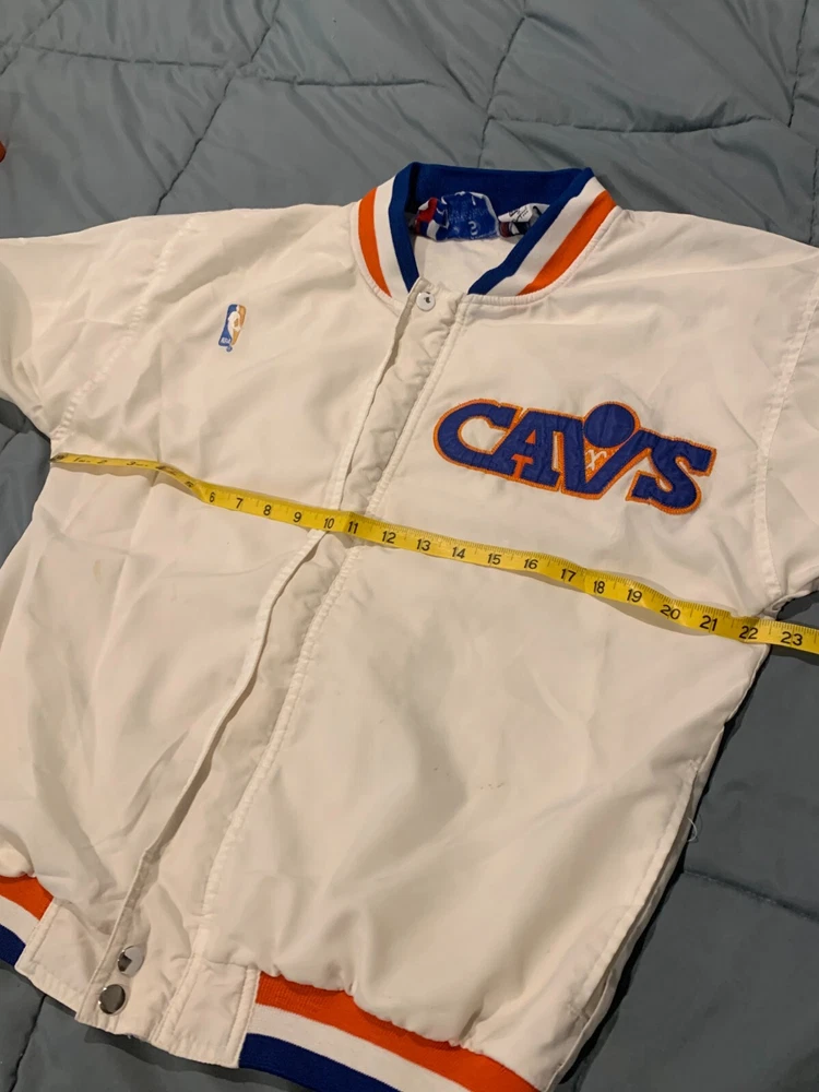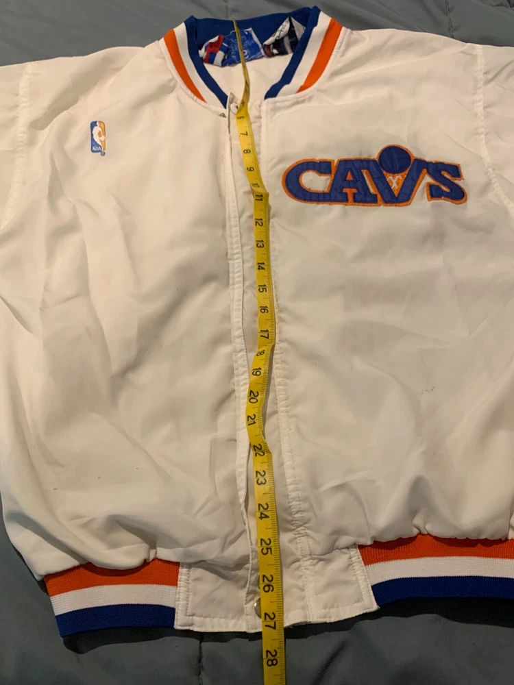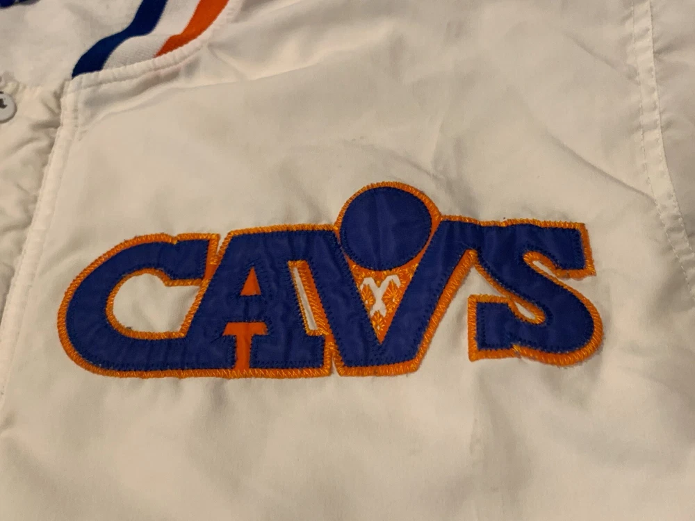 This is in good vintage condition from a non-smoking home. Note there is a light colored mark on one of the sleeves so please view pictures carefully before bidding. Show off your love for the Cleveland Cavaliers with this vintage game jacket. Made of satiny polyester material, this original piece from the 1980s is perfect for any fan. The jacket features the iconic Champion brand, and is available in a men's size small (but runs a little large - see pics for measurements). The white color and classic design make it a versatile addition to any wardrobe. Whether you're cheering on the team at a game or adding to your vintage collection, this jacket is a must-have for any true Cavaliers supporter.